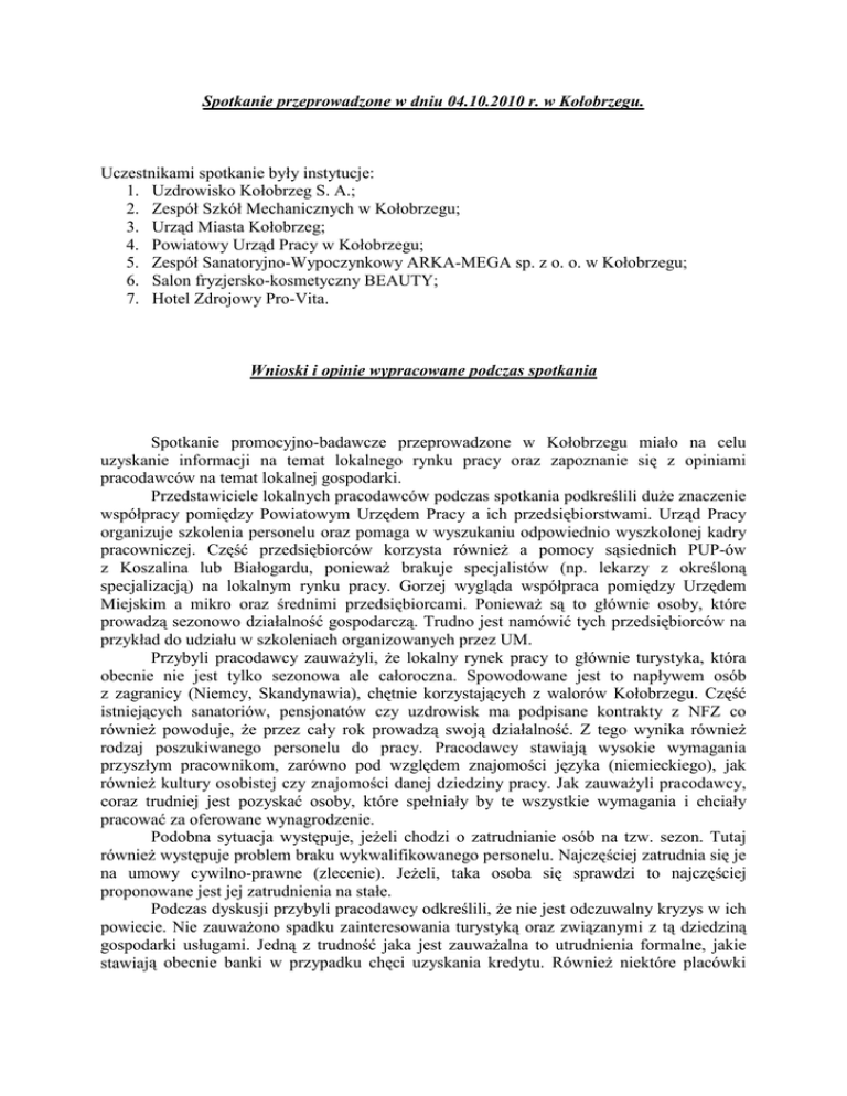Spotkanie przeprowadzone w dniu 04.10.2010 r. w Kołobrzegu. Uczestnikami spotkanie były instytucje: 1. Uzdrowisko Kołobrzeg S. A.; 2. Zespół Szkół Mechanicznych w Kołobrzegu; 3. Urząd Miasta Kołobrzeg; 4. Powiatowy Urząd Pracy w Kołobrzegu; 5. Zespół Sanatoryjno-Wypoczynkowy ARKA-MEGA sp. z o. o. w Kołobrzegu; 6. Salon fryzjersko-kosmetyczny BEAUTY; 7. Hotel Zdrojowy Pro-Vita. Wnioski i opinie wypracowane podczas spotkania Spotkanie promocyjno-badawcze przeprowadzone w Kołobrzegu miało na celu uzyskanie informacji na temat lokalnego rynku pracy oraz zapoznanie się z opiniami pracodawców na temat lokalnej gospodarki. Przedstawiciele lokalnych pracodawców podczas spotkania podkreślili duŜe znaczenie współpracy pomiędzy Powiatowym Urzędem Pracy a ich przedsiębiorstwami. Urząd Pracy organizuje szkolenia personelu oraz pomaga w wyszukaniu odpowiednio wyszkolonej kadry pracowniczej. Część przedsiębiorców korzysta równieŜ a pomocy sąsiednich PUP-ów z Koszalina lub Białogardu, poniewaŜ brakuje specjalistów (np. lekarzy z określoną specjalizacją) na lokalnym rynku pracy. Gorzej wygląda współpraca pomiędzy Urzędem Miejskim a mikro oraz średnimi przedsiębiorcami. PoniewaŜ są to głównie osoby, które prowadzą sezonowo działalność gospodarczą. Trudno jest namówić tych przedsiębiorców na przykład do udziału w szkoleniach organizowanych przez UM. Przybyli pracodawcy zauwaŜyli, Ŝe lokalny rynek pracy to głównie turystyka, która obecnie nie jest tylko sezonowa ale całoroczna. Spowodowane jest to napływem osób z zagranicy (Niemcy, Skandynawia), chętnie korzystających z walorów Kołobrzegu. Część istniejących sanatoriów, pensjonatów czy uzdrowisk ma podpisane kontrakty z NFZ co równieŜ powoduje, Ŝe przez cały rok prowadzą swoją działalność. Z tego wynika równieŜ rodzaj poszukiwanego personelu do pracy. Pracodawcy stawiają wysokie wymagania przyszłym pracownikom, zarówno pod względem znajomości języka (niemieckiego), jak równieŜ kultury osobistej czy znajomości danej dziedziny pracy. Jak zauwaŜyli pracodawcy, coraz trudniej jest pozyskać osoby, które spełniały by te wszystkie wymagania i chciały pracować za oferowane wynagrodzenie. Podobna sytuacja występuje, jeŜeli chodzi o zatrudnianie osób na tzw. sezon. Tutaj równieŜ występuje problem braku wykwalifikowanego personelu. Najczęściej zatrudnia się je na umowy cywilno-prawne (zlecenie). JeŜeli, taka osoba się sprawdzi to najczęściej proponowane jest jej zatrudnienia na stałe. Podczas dyskusji przybyli pracodawcy odkreślili, Ŝe nie jest odczuwalny kryzys w ich powiecie. Nie zauwaŜono spadku zainteresowania turystyką oraz związanymi z tą dziedziną gospodarki usługami. Jedną z trudność jaka jest zauwaŜalna to utrudnienia formalne, jakie stawiają obecnie banki w przypadku chęci uzyskania kredytu. RównieŜ niektóre placówki mają problemy związane z dofinansowaniem z NFZ, niestety wiąŜe się to ze zwolnieniami w najbliŜszych miesiącach i to nawet 10% załogi, głównie rehabilitantów i pielęgniarek. Wiesze trudności występują równieŜ w pozyskaniu środków z Unii Europejskiej. Problemy takie zauwaŜyli zarówno przedsiębiorcy, jak równieŜ przedstawiciele lokalnych szkół. Związane jest to wymogami formalnymi jakie są stawiane instytucją podczas pisania projektów. Ale równieŜ spowodowane przez moŜliwość uczestniczenia w konkursach osób spoza naszego województwa. W powiecie kołobrzeskim, jak zauwaŜyli uczestnicy dyskusji, zmniejszyła się ilość wyjeŜdŜających młodych ludzi w poszukiwaniu pracy poza granicami kraju. DuŜa część młodzieŜy decyduje się na taki krok, tylko po to aby podszkolić znajomości języka obcego a następnie wraca i szuka pracy w regionie. Natomiast widoczne są równieŜ powroty z zagranicy osób o takich specjalnościach jak: kelner, barman czy kucharz. Jednak stawiają oni bardzo wygórowane warunki finansowe, których często pracodawca nie jest w stanie spełnić. Wówczas albo przyjmują oferowaną propozycję albo otwierają swoją działalność gospodarczą. Zdarzają się teŜ przypadki, Ŝe postanawiają ponownie wyjechać za granicę. Przedstawiciele lokalnych szkół, podkreślili bardzo dobrą współpracę pomiędzy ich placówkami a przedsiębiorcami. Pracodawcy chętnie przyjmują młodzieŜ szkolna na praktyki nauki zawodu a osoby, które wykazały się duŜą wiedzą oraz zainteresowaniem zawodem są zatrudniane na stałe. Jednak duŜa część młodych osób stawia wygórowane warunki finansowe lub zaraz po skończeniu szkoły chce pracować na wysokim stanowisku, bez przejścia całej ścieŜki zawodowej. Część osób po skończeniu szkoły zawodowej planuje wyjechać za granicę. RównieŜ duŜa liczba absolwentów nigdzie nie pracuje, gdyŜ doszli do wniosku, Ŝe pomylili się z wyborem zawodu i postanawiają się przekwalifikować. Obecnie szkoły zawodowe oraz technika nie mają barku chętnych na kierunki takie jak: mechanik samochodowy, kucharz czy fryzjer. Przedstawiciele szkół zaznaczyli podczas dyskusji, trudności we współpracy z WUP. Narzekają na brak doradców, którzy pomogłyby podczas pisania projektów czy wsparcia czysto technicznego w Punkcie Konsultacyjnym PO KL w Filii WUP w Koszalinie. Dlatego część przedsiębiorców szuka dojść na własną rękę lub wynajmuje firmy doradcze, które piszą za nich projekty. Inne uwagi: - badania ankietowe prowadzone przez ZOG, powinny być przeprowadzane drogą e-mailową lub poprzez wywiad bezpośredni z pracodawcą w umówionym terminie, a nie drogą telefoniczną; Sprawozdanie sporządziła: Magdalena Dobosz