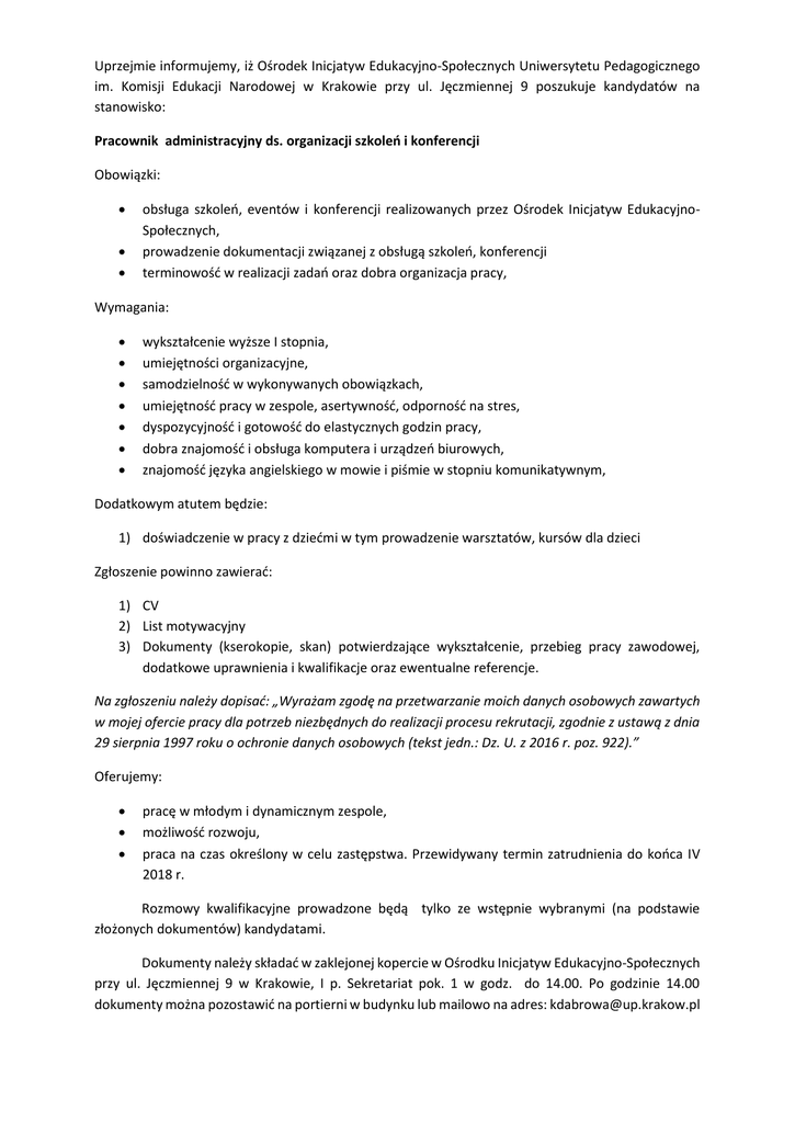 Uprzejmie informujemy, iż Ośrodek Inicjatyw Edukacyjno-Społecznych Uniwersytetu Pedagogicznego im. Komisji Edukacji Narodowej w Krakowie przy ul. Jęczmiennej 9 poszukuje kandydatów na stanowisko: Pracownik administracyjny ds. organizacji szkoleń i konferencji Obowiązki:    obsługa szkoleń, eventów i konferencji realizowanych przez Ośrodek Inicjatyw EdukacyjnoSpołecznych, prowadzenie dokumentacji związanej z obsługą szkoleń, konferencji terminowość w realizacji zadań oraz dobra organizacja pracy, Wymagania:        wykształcenie wyższe I stopnia, umiejętności organizacyjne, samodzielność w wykonywanych obowiązkach, umiejętność pracy w zespole, asertywność, odporność na stres, dyspozycyjność i gotowość do elastycznych godzin pracy, dobra znajomość i obsługa komputera i urządzeń biurowych, znajomość języka angielskiego w mowie i piśmie w stopniu komunikatywnym, Dodatkowym atutem będzie: 1) doświadczenie w pracy z dziećmi w tym prowadzenie warsztatów, kursów dla dzieci Zgłoszenie powinno zawierać: 1) CV 2) List motywacyjny 3) Dokumenty (kserokopie, skan) potwierdzające wykształcenie, przebieg pracy zawodowej, dodatkowe uprawnienia i kwalifikacje oraz ewentualne referencje. Na zgłoszeniu należy dopisać: „Wyrażam zgodę na przetwarzanie moich danych osobowych zawartych w mojej ofercie pracy dla potrzeb niezbędnych do realizacji procesu rekrutacji, zgodnie z ustawą z dnia 29 sierpnia 1997 roku o ochronie danych osobowych (tekst jedn.: Dz. U. z 2016 r. poz. 922).” Oferujemy:    pracę w młodym i dynamicznym zespole, możliwość rozwoju, praca na czas określony w celu zastępstwa. Przewidywany termin zatrudnienia do końca IV 2018 r. Rozmowy kwalifikacyjne prowadzone będą tylko ze wstępnie wybranymi (na podstawie złożonych dokumentów) kandydatami. Dokumenty należy składać w zaklejonej kopercie w Ośrodku Inicjatyw Edukacyjno-Społecznych przy ul. Jęczmiennej 9 w Krakowie, I p. Sekretariat pok. 1 w godz. do 14.00. Po godzinie 14.00 dokumenty można pozostawić na portierni w budynku lub mailowo na adres: [email protected]