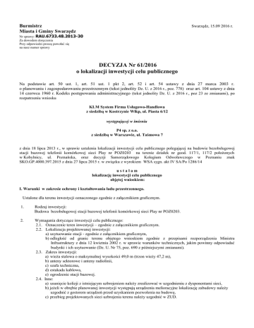 Burmistrz Miasta i Gminy Swarzędz Swarzędz, 15.09 2016 r. Nr sprawy: RAU.6733.48.2013-30 Za dowodem doręczenia Przy odpowiedzi proszę powołać się na nasz numer sprawy DECYZJA Nr 61/2016 o lokalizacji inwestycji celu publicznego Na podstawie art. 50 ust. 1, art. 51 ust. 1 pkt 2, art. 52 i art. 54 ustawy z dnia 27 marca 2003 r. o planowaniu i zagospodarowaniu przestrzennym (tekst jednolity Dz. U. z 2016 r., poz. 778) oraz art. 104 ustawy z dnia 14 czerwca 1960 r. Kodeks postępowania administracyjnego (tekst jednolity Dz. U. z 2016 r., poz 23 ze zmianami ), po rozpatrzeniu wniosku KLM System Firma Usługowo-Handlowa z siedzibą w Kostrzynie Wlkp, ul. Piasta 6/12 występującej w imieniu P4 sp. z o.o. z siedzibą w Warszawie, ul. Taśmowa 7 z dnia 18 lipca 2013 r., w sprawie ustalenia lokalizacji inwestycji celu publicznego polegającej na budowie bezobsługowej stacji bazowej telefonii komórkowej sieci Play nr POZ0203 na terenie działek nr geod. 117/1, 117/2 położonych w Kobylnicy, ul. Poznańska, oraz decyzji Samorządowego Kolegium Odwoławczego w Poznaniu znak SKO.GP.4000.397.2015 z dnia 27 lipca 2015 r. w związku z wyrokiem WSA sygn. akt IV SA/Po 1286/14 ustalam lokalizację inwestycji celu publicznego objętej wnioskiem: I. Warunki w zakresie ochrony i kształtowania ładu przestrzennego. Ustalone dla terenu inwestycji oznaczonego zgodnie z załącznikiem graficznym. 1. Rodzaj inwestycji: Budowa bezobsługowej stacji bazowej telefonii komórkowej sieci Play nr POZ0203. 2. Wymagania dotyczące inwestycji celu publicznego: 2.1. Oznaczenie teren inwestycji – zgodnie z załącznikiem graficznym. 2.2. Lokalizacja projektowanej inwestycji: a) usytuowanie stacji - zgodnie z załącznikiem graficznym, b) odległość od granic terenu objętego wnioskiem zgodnie z przepisami rozporządzenia Ministra Infrastruktury z dnia 12 kwietnia 2002 r. w sprawie warunków technicznych, jakim powinny odpowiadać budynki i ich usytuowanie (Dz. U. Nr 75, poz. 690 z późniejszymi zmianami). 2.3. Zakres inwestycji: a) wieża stalowa o maksymalnej wysokości 49,0 m (trzon wieży 47,2 m), b) anteny sektorowe i anteny radiolinii, c) szafa techniczna, d) estakada kablowa, e) ogrodzenie stacji bazowej. 2.4. Inne: a) usunięcie kolizji z istniejącym uzbrojeniem należy zrealizować w uzgodnieniu z dysponentami sieci, b) jeżeli w obrębie planowanej inwestycji występują urządzenia melioracyjne lokalizację zabudowy należy uzgodnić z gestorem urządzeń przed uzyskaniem pozwolenia na budowę, c) przebieg projektowanych sieci uzbrojenia terenu należy uzgodnić w ZUD. II. Warunki w zakresie ochrony środowiska i zdrowia ludzi oraz dziedzictwa kulturowego i zabytków oraz dóbr kultury współczesnej. 1. Przedmiotowa inwestycja nie należy do przedsięwzięć mogących znacząco oddziaływać na środowisko w rozumieniu przepisów ustawy z dnia 3 października 2008 r. o udostępnianiu informacji o środowisko i jego ochronie, udziale społeczeństwa w ochronie środowiska oraz o ocenach oddziaływania na środowisko (tekst jednolity Dz. U. z 2016 r., poz.353 z późniejszymi zmianami). II. Warunki obsługi w zakresie infrastruktury technicznej i komunikacji. 1. Obsługa komunikacyjna. 1.1. Bezpośrednio z ul. Poznańskiej (droga wojewódzka, droga serwisowa) istniejącym zjazdem. 2. Zasilanie w energię elektryczną. 2.1. Zgodnie z aktualną opinią gestora sieci. 3. Odprowadzenie wód opadowych. 3.1. Wody opadowe należy zagospodarować na własnym terenie nieutwardzonym. IV. Wymagania dotyczące ochrony interesu publicznego i osób trzecich: 1. Projektowane obiekty budowlane winny spełniać winny spełniać wymogi określone w art. 5 ust. 1 ustawy Prawo budowlane z 7 lipca 2007 r. 2. Zgodnie z art. 63 ust. 1,2 i 4 ustawy z dnia 27 marca 2003 r. o planowaniu i zagospodarowaniu przestrzennym: 2.1. w odniesieniu do tego samego terenu decyzje o warunkach zabudowy można wydać więcej niż jednemu wnioskodawcy, 2.2. niniejsza decyzja nie rodzi praw do terenu oraz nie narusza prawa własności i uprawnień osób trzecich , nie jest równoznaczna z prawem zabudowy, 2.3. wnioskodawcom, którzy nie uzyskali prawa do dysponowania gruntem przeznaczonym na cele budowlane, nie przysługuje roszczenie o zwrot nakładów poniesionych w związku z otrzymaną decyzją o warunkach zabudowy. 3. Zgodnie z opinią Referatu Rolnictwa, Melioracji i Ochrony Środowiska znak ROS.6220.2.12.2015-1 z dnia 16 grudnia 2015 r. stwierdzono, że w świetle złożonych dokumentów przedsięwzięcie nie wymaga uzyskania decyzji o środowiskowych uwarunkowaniach dla tego przedsięwzięcia. 4. Niniejsza decyzja nie uniemożliwia, ani w istotny sposób nie ogranicza korzystania z nieruchomości lub jej części w dotychczasowy sposób lub zgodny z dotychczasowym przeznaczeniem oraz nie powoduje zmiany wartości nieruchomości. V. Ochrona obiektów budowlanych na terenach górniczych. Nie dotyczy. IV. Linie rozgraniczające teren inwestycji. Linie rozgraniczające teren inwestycji wyznaczono na mapie zasadniczej w skali 1:1000, stanowiącej załącznik do niniejszej decyzji. UZASADNIENIE Stan faktyczny: W dniu 18 lipca 2013 r. został złożony wniosek w sprawie ustalenia lokalizacji inwestycji celu publicznego polegającej na budowie bezobsługowej stacji bazowej telefonii komórkowej sieci Play nr POZ0203 na terenie działek nr geod. 117/1, 117/2 położonych w Kobylnicy, ul. Poznańska. W dniu 25 lipca 2013 r., pismem znak RAU.6733-0048/001/2013 wezwano Wnioskodawcę do uzupełnienia wniosku w zakresie określenia danych dotyczących rzędnych wysokościowych (wysokości terenu n.p.m.), położenia względem współczynnika geograficznego oraz wysokości wieży - w celu uzgodnienia z Urzędem Lotnictwa Cywilnego, przedłożenia informacji o oddziaływaniu planowanego przedsięwzięcia na środowisko, a w przypadku zaliczenia inwestycji do przedsięwzięć mogących negatywnie oddziaływać na środowisko przedłożenia decyzji o 