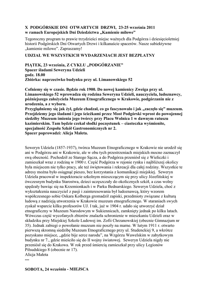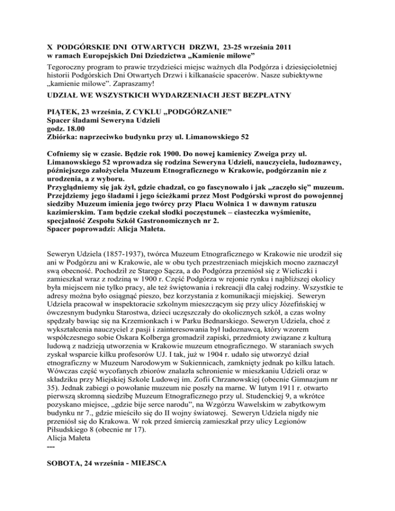 X PODGÓRSKIE DNI OTWARTYCH DRZWI, 23-25 września 2011 w ramach Europejskich Dni Dziedzictwa „Kamienie milowe” Tegoroczny program to prawie trzydzieści miejsc ważnych dla Podgórza i dziesięcioletniej historii Podgórskich Dni Otwartych Drzwi i kilkanaście spacerów. Nasze subiektywne „kamienie milowe”. Zapraszamy! UDZIAŁ WE WSZYSTKICH WYDARZENIACH JEST BEZPŁATNY PIĄTEK, 23 września, Z CYKLU „PODGÓRZANIE” Spacer śladami Seweryna Udzieli godz. 18.00 Zbiórka: naprzeciwko budynku przy ul. Limanowskiego 52 Cofniemy się w czasie. Będzie rok 1900. Do nowej kamienicy Zweiga przy ul. Limanowskiego 52 wprowadza się rodzina Seweryna Udzieli, nauczyciela, ludoznawcy, późniejszego założyciela Muzeum Etnograficznego w Krakowie, podgórzanin nie z urodzenia, a z wyboru. Przyglądniemy się jak żył, gdzie chadzał, co go fascynowało i jak „zaczęło się” muzeum. Przejdziemy jego śladami i jego ścieżkami przez Most Podgórski wprost do powojennej siedziby Muzeum imienia jego twórcy przy Placu Wolnica 1 w dawnym ratuszu kazimierskim. Tam będzie czekał słodki poczęstunek – ciasteczka wyśmienite, specjalność Zespołu Szkół Gastronomicznych nr 2. Spacer poprowadzi: Alicja Małeta. Seweryn Udziela (1857-1937), twórca Muzeum Etnograficznego w Krakowie nie urodził się ani w Podgórzu ani w Krakowie, ale w obu tych przestrzeniach miejskich mocno zaznaczył swą obecność. Pochodził ze Starego Sącza, a do Podgórza przeniósł się z Wieliczki i zamieszkał wraz z rodziną w 1900 r. Część Podgórza w rejonie rynku i najbliższej okolicy była miejscem nie tylko pracy, ale też świętowania i rekreacji dla całej rodziny. Wszystkie te adresy można było osiągnąć pieszo, bez korzystania z komunikacji miejskiej. Seweryn Udziela pracował w inspektoracie szkolnym mieszczącym się przy ulicy Józefińskiej w ówczesnym budynku Starostwa, dzieci uczęszczały do okolicznych szkół, a czas wolny spędzały bawiąc się na Krzemionkach i w Parku Bednarskiego. Seweryn Udziela, choć z wykształcenia nauczyciel z pasji i zainteresowania był ludoznawcą, który wzorem współczesnego sobie Oskara Kolberga gromadził zapiski, przedmioty związane z kulturą ludową z nadzieją utworzenia w Krakowie muzeum etnograficznego. W staraniach swych zyskał wsparcie kilku profesorów UJ. I tak, już w 1904 r. udało się utworzyć dział etnograficzny w Muzeum Narodowym w Sukiennicach, zamknięty jednak po kilku latach. Wówczas część wycofanych zbiorów znalazła schronienie w mieszkaniu Udzieli oraz w składziku przy Miejskiej Szkole Ludowej im. Zofii Chrzanowskiej (obecnie Gimnazjum nr 35). Jednak zabiegi o powołanie muzeum nie poszły na marne. W lutym 1911 r. otwarto pierwszą skromną siedzibę Muzeum Etnograficznego przy ul. Studenckiej 9, a wkrótce pozyskano miejsce, „gdzie bije serce narodu”, na Wzgórzu Wawelskim w zabytkowym budynku nr 7., gdzie mieściło się do II wojny światowej. Seweryn Udziela nigdy nie przeniósł się do Krakowa. W rok przed śmiercią zamieszkał przy ulicy Legionów Piłsudskiego 8 (obecnie nr 17). Alicja Małeta --SOBOTA, 24 września - MIEJSCA “Krawal” Krakowska Wytwórnia Lalek, ul. Bonarka 21, www.krawal.com.pl, godz. 10.00 Już po raz kolejny gościć będziemy w progach jedynej w Polsce i zarazem najstarszej fabryki lalek, w której dowiemy się jak i gdzie powstają ukochane lalki naszych milusińskich. Tylko dla dzieci? Tylko dla dziewczynek? Ależ skąd. Dlaczego? Przyjdźcie i zobaczcie. Raj dla miłośników turpizmu... --Podgórska Biblioteka Publiczna, ul. Powroźnicza 2, www.podgorska.krakow.pl, godz. 10.00 Wzniesiony pod koniec XIX wieku dworek należał co córki Jana Matejki, potem do przemysłowca, oficera gestapo, po wojnie był tu żłobek, a od 1995 roku jest siedzibą biblioteki. Wpisany do rejestru zabytków, stanowi przykład dawnej willowo-dworkowej zabudowy podmiejskiej dzielnicy Dębniki. Zapraszamy na oprowadzanie po budynku „z przeszłością” i bibliotecznym ogrodzie. Oprowadza: Dominika Stęclik --Elektrownia Wodna i Stopień Wodny “Dąbie”, ul. Ofiar Dąbia (wejście od strony Krakowa), WYMAGANA REZERWACJA godz. 10.00, 11.00, 12.30 (Grupy po 20 osób, wejściówki do odbioru w Domu Historii Podgórza i Galerii Rękawka, ul. Limanowskiego 13, w dniach: sobota 17 września w godz.10.00 – 15.00 oraz w dniach 19 – 23 września w godz.11.00-18.00, dodatkowe informacje tel.: 12 396 39 49). Co to jest jaz, czym jest zapora? I jak działa śluza? Kiedy i po co wybudowano elektrownię wodną? Zapraszamy do poznania tajemnic Stopnia Wodnego i Elektrowni Wodnej „Dąbie”. --Galeria Teranga, ul. Kalwaryjska 48, godz. 10.30 - 14.00, PO RAZ DZIESIĄTY! Poznać smak baobabu, napić się afrykańskich herbat i kawy Touba, posłuchać bębnów – tego wszystkiego możemy doświadczyć w trakcie wizyty w najsłynniejszej, najstarszej i zarazem jedynej w Podgórzu galerii sztuki afrykańskiej. --Podgórskie kamienie milowe: godz. 11.00 - „Opowieść o mieście” (opowieść będzie miała charakter ciągły, można dołączyć do grupy w podanych miejscach i czasie – albo w dowolnej chwili) rozdziały opowieści: godz. 11.00 I. Magistrat Podgórza i krótka historia miasta, (zbiórka przed Magistratem Rynek Podgórski 1, później będziemy w budynku), ok. godz. 12.00 II. Herkules w Podgórzu - o herbie miasta i o Rynku Podgórskim (rozpoczynamy przed budynkiem Magistratu - Rynek Podgórski 1, następnie spacer po Rynku, ul. Brodzińskiego na placyk przy kładce nad Wisłą, zaś stamtąd na Plac Niepodległości) ok. godz. 13.20 III. Plac Niepodległości – o dziejach i nazwie miejsca (będziemy na Placu) Oprowadza: Jarosław Żółciak --“Format” - Sztukaterie gipsowe, www.sztukaterie.com.pl, ul. Limanowskiego 48, godz. 11.00 i 13.00 Gips już w XVIII wieku został uznany za doskonały materiał dekoracyjny, z którego można tworzyć oryginalne kompozycje architektonicz