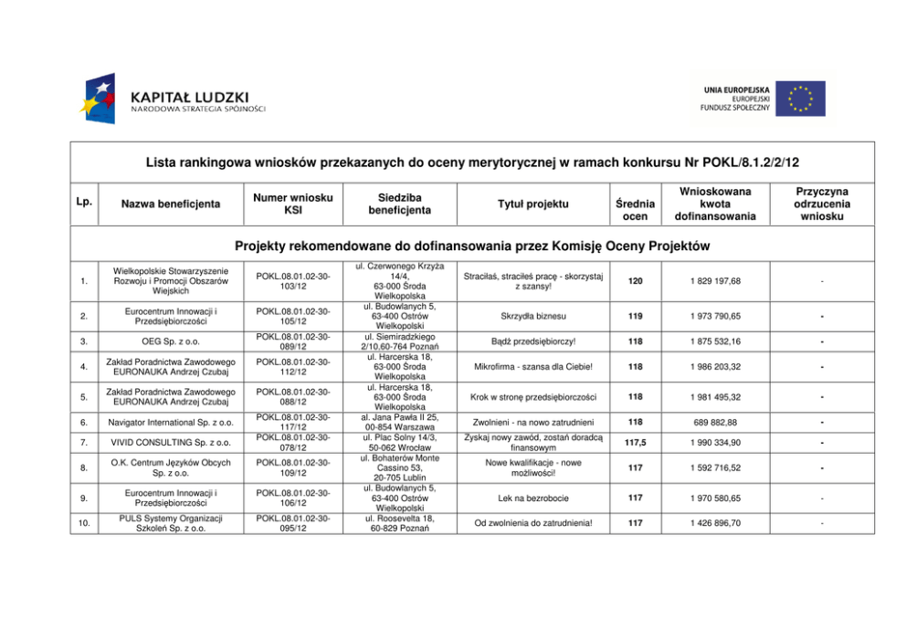 Lista rankingowa wniosków przekazanych do oceny merytorycznej w ramach konkursu Nr POKL/8.1.2/2/12 Lp. Numer wniosku KSI Nazwa beneficjenta Siedziba beneficjenta Tytuł projektu Średnia ocen Wnioskowana kwota dofinansowania Przyczyna odrzucenia wniosku Projekty rekomendowane do dofinansowania przez Komisję Oceny Projektów 1. Wielkopolskie Stowarzyszenie Rozwoju i Promocji Obszarów Wiejskich POKL.08.01.02-30103/12 2. Eurocentrum Innowacji i Przedsiębiorczości POKL.08.01.02-30105/12 3. OEG Sp. z o.o. POKL.08.01.02-30089/12 4. Zakład Poradnictwa Zawodowego EURONAUKA Andrzej Czubaj POKL.08.01.02-30112/12 5. Zakład Poradnictwa Zawodowego EURONAUKA Andrzej Czubaj POKL.08.01.02-30088/12 6. Navigator International Sp. z o.o. 7. VIVID CONSULTING Sp. z o.o. 8. O.K. Centrum Języków Obcych Sp. z o.o. POKL.08.01.02-30109/12 9. Eurocentrum Innowacji i Przedsiębiorczości POKL.08.01.02-30106/12 10. PULS Systemy Organizacji Szkoleń Sp. z o.o. POKL.08.01.02-30095/12 POKL.08.01.02-30117/12 POKL.08.01.02-30078/12 ul. Czerwonego Krzyża 14/4, 63-000 Środa Wielkopolska ul. Budowlanych 5, 63-400 Ostrów Wielkopolski ul. Siemiradzkiego 2/10,60-764 Poznań ul. Harcerska 18, 63-000 Środa Wielkopolska ul. Harcerska 18, 63-000 Środa Wielkopolska al. Jana Pawła II 25, 00-854 Warszawa ul. Plac Solny 14/3, 50-062 Wrocław ul. Bohaterów Monte Cassino 53, 20-705 Lublin ul. Budowlanych 5, 63-400 Ostrów Wielkopolski ul. Roosevelta 18, 60-829 Poznań Straciłaś, straciłeś pracę - skorzystaj z szansy! 120 1 829 197,68 - Skrzydła biznesu 119 1 973 790,65 - Bądź przedsiębiorczy! 118 1 875 532,16 - Mikrofirma - szansa dla Ciebie! 118 1 986 203,32 - Krok w stronę przedsiębiorczości 118 1 981 495,32 - Zwolnieni - na nowo zatrudnieni 118 689 882,88 - Zyskaj nowy zawód, zostań doradcą finansowym 117,5 1 990 334,90 - Nowe kwalifikacje - nowe możliwości! 117 1 592 716,52 - Lek na bezrobocie 117 1 970 580,65 - Od zwolnienia do zatrudnienia! 117 1 426 896,70 - Projekty rekomendowane do dofinansowania przez Komisję Oceny Projektów, lecz nie przyjęte do dofinansowania z powodu wyczerpania alokacji w ramach ww. konkursu 11. 12. 13. Wielkopolskie Stowarzyszenie Rozwoju i Promocji Obszarów Wiejskich Wielkopolski Instytut Rozwoju Przedsiębiorczości i Edukacji Wielkopolska Grupa Prawnicza Kozłowski, Maźwa, Sendrowski i Wspólnicy Sp. k. 14. Vision Consulting Sp. z o.o. 15. Fundacja Inicjowania Rozwoju Społecznego 16. 17. 18. 19. 20. 21. 22. 23. 7 CUBES Sp. z o.o. Agnieszka Maruda SperczakVision Consulting Group "Eurodoradztwo" Magdalena Binkowska - Jenczyk Process Team Sp. z o.o. SEMIUS Sp. z o.o. Joanna Mirowska-Wieczorek Niepubliczny Zakład Opieki Zdrowotnej Poradnia Zdrowia Psychosomatycznego VIAMED Międzynarodowe Centrum Doskonalenia Kadr Sp. z o.o. ATC S.C. Wojciech Kaczmarek, Irena Kaczmarek, Daniel Kaczmarek 24. INTACTO Grzegorz Anyszko 25. IT Grzegorz Chojnacki 26. 27. 28. 29. Biuro Consultingowo-Handlowe Gwarancja Jan Guss Prywatne Centrum Języków Obcych "ATB" Europejskie Towarzystwo Inicjatyw Obywatelskich NS Konsulting Sp. z o.o. POKL.08.01.02-30108/12 ul. Czerwonego Krzyża 14/4, 63-000 Środa Wielkopolska ul. Prusa 31, 64-800 Chodzież POKL.08.01.02-30092/12 ul. Grudzieniec 64, 60-601 Poznań POKL.08.01.02-30107/12 POKL.08.01.02-30116/12 POKL.08.01.02-30063/12 POKL.08.01.02-30123/12 POKL.08.01.02-30079/12 POKL.08.01.02-30100/12 POKL.08.01.02-30070/12 ul. Pędzichów 6, 31-152 Kraków ul. Wierzbięcice 16/1, 61-568 Poznań ul. Mokotowska 15a/1b, 00-640 Warszawa ul. Żołnierzy Narwiku 16, 61-695 Poznań ul. Leśna 2, 64-840 Budzyń ul. Palestyńska 8/33, 03-321 Warszawa ul. Nowogrodzka 50/515, 00-695 Warszawa POKL.08.01.02-30082/12 ul. Sławnikowska 120a, 20-810 Lublin Czas na zmiany! 114 861 054,48 Brak środków POKL.08.01.02-30090/12 ul. Trzy Lipy 3, 80-172 Gdańsk Nowe kwalifikacje szansą na lepsze jutro 114 909 715,92 Brak środków POKL.08.01.02-30072/12 ul. Lipowa 1, 63-800 Gostyń NOWE KWALIFIKACJE SZANSĄ NA ROZÓJ RYNKU II 114 1 155 938,60 Brak środków POKL.08.01.02-30067/12 POKL.08.01.02-30110/12 POKL.08.01.02-30101/12 POKL.08.01.02-30076/12 POKL.08.01.02-30087/12 POKL.08.01.02-30081/12 Borów 52, 66-200 Świebodzin ul. Powstańców 27a, 05-870 Błonie ul. Niezłomnych 1, 61-894 Poznań ul. Rynek 3, 64-800 Chodzież ul. Sukiennicza 6/1, 87-100 Toruń ul. Nałęczowska 30, 20-701 Lublin Nowa szansa 113,5 1 273 173,30 Brak środków Nowy zawód - lepsza perspektywa 113 1 397 767,60 Brak środków Zmiana Na Lepsze 113 2 978 791,00 Brak środków Nowe kompetencje - Twoją szansą 113 1 618 671,96 Brak środków 112,5 1 998 147,28 Brak środków 112,5 1 464 234,32 Brak środków POKL.08.01.02-30074/12 Pokonaj bezrobocie - zostań swoim szefem 117 1 828 662,68 Brak środków Nowe kwalifikacje - nowy zawód 116,5 1 999 350,00 Brak środków W kierunku samozatrudnienia 116,5 1 681 157,20 Brak środków NOWY ROZDZIAŁ 116 1 599 969,30 Brak środków Z pracy do pracy 116 2 982 116,00 Brak środków Nowy zawód - nowe życie 115,5 612 141,00 Brak środków Czas na własną firmę 115 1 873 969,96 Brak środków NOWA SZANSA 115 1 417 614,00 Brak środków Czas na zmiany 115 981 684,00 Brak środków Nowe kwalifikacje na nowy start 114,5 815 068,00 Brak środków Przez zwolnienie po samozatrudnienie ReStart Zawodowym Twoim Udziałem! 30. 31. 32. 33. 34. Europejski Dom Spotkań Fundacja Nowy Staw Centrum Doradztwa Unijnego Wioletta Piotrowska - Tarapacz, Jacek Frankowski s.c. Fundacja Inicjatyw Społecznych "Barwy Ziemi" Cityschool s.c. Paweł Kędzierski, Piotr Kossowski Melting Pot - Piotr Kossowski 35. Faber Consulting Sp. z o.o. 36. TERRA Szkolenia i Doradztwo Przemysław Omieczyński 37. INTACTO Grzegorz Anyszko 38. Custom Media Group Agnieszka Kędzierska 39. EHED Usługi szkoleniowe 40. 41. 42. 43. Centrum Samorządności i Regionalizmu Kompass Doradztwo gospodarcze Maciej Buczkowski Doradztwo Społeczne i Gospodarcze Krzysztof Bondyra Doradztwo Społeczne i Gospodarcze Krzy