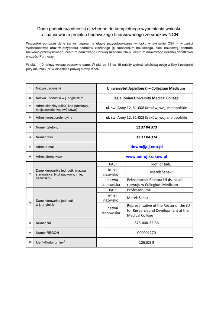 Dane jednostki we wniosku NCN - wzór wypełnienia