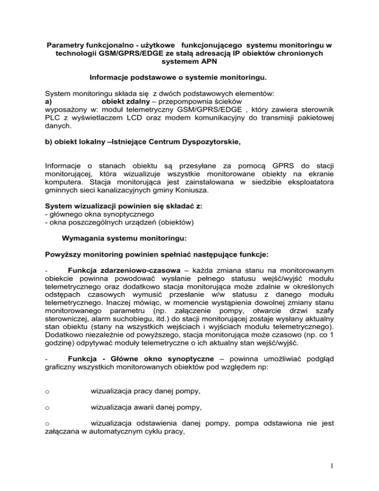 Parametry funkcjonalno - użytkowe funkcjonującego systemu monitoringu w technologii GSM/GPRS/EDGE ze stałą adresacją IP obiektów chronionych systemem APN Informacje podstawowe o systemie monitoringu. System monitoringu składa się z dwóch podstawowych elementów: a) obiekt zdalny – przepompownia ścieków wyposażony w: moduł telemetryczny GSM/GPRS/EDGE , który zawiera sterownik PLC z wyświetlaczem LCD oraz modem komunikacyjny do transmisji pakietowej danych. b) obiekt lokalny –Istniejące Centrum Dyspozytorskie, Informacje o stanach obiektu są przesyłane za pomocą GPRS do stacji monitorującej, która wizualizuje wszystkie monitorowane obiekty na ekranie komputera. Stacja monitorująca jest zainstalowana w siedzibie eksploatatora gminnych sieci kanalizacyjnych gminy Koniusza. System wizualizacji powinien się składać z: - głównego okna synoptycznego - okna poszczególnych urządzeń (obiektów) Wymagania systemu monitoringu: Powyższy monitoring powinien spełniać następujące funkcje: Funkcja zdarzeniowo-czasowa – każda zmiana stanu na monitorowanym obiekcie powinna powodować wysłanie pełnego statusu wejść/wyjść modułu telemetrycznego oraz dodatkowo stacja monitorująca może zdalnie w określonych odstępach czasowych wymusić przesłanie w/w statusu z danego modułu telemetrycznego. Inaczej mówiąc, w momencie wystąpienia dowolnej zmiany stanu monitorowanego parametru (np. załączenie pompy, otwarcie drzwi szafy sterowniczej, alarm suchobiegu, itd.) do stacji monitorującej zostaje wysłany aktualny stan obiektu (stany na wszystkich wejściach i wyjściach modułu telemetrycznego). Dodatkowo niezależnie od powyższego, stacja monitorująca może czasowo (np. co 1 godzinę) odpytywać moduły telemetryczne o ich aktualny stan wejść/wyjść. Funkcja - Główne okno synoptyczne – powinna umożliwiać podgląd graficzny wszystkich monitorowanych obiektów pod względem np: o wizualizacja pracy danej pompy, o wizualizacja awarii danej pompy, o wizualizacja odstawienia danej pompy, pompa odstawiona nie jest załączana w automatycznym cyklu pracy, 1 o wizualizacje włamań na obiekty, o wizualizacja alarmów na wszystkich obiektach lub urządzeniach w formie tabeli alarmów bieżących, alarmy powinny być podawane z następującymi informacjami: data wystąpienia alarmu, nazwa obiektu, typ alarmu, data ustąpienia alarmu, w jakim czasie alarm został potwierdzony przez operatora. Funkcja logowania/wylogowania operatorów stacji monitorującej – powinna umożliwiać na przypisanie odpowiednich kompetencji danemu operatorowi, np. operator o najmniejszych kompetencjach ma prawo tylko do przeglądania obiektów bez możliwości ich zdalnego sterowania, natomiast operator-administrator ma pełne prawa dostępu wraz z prawem zdalnego sterowania urządzeniami. Funkcja alarmów historycznych – powinna umożliwiać przeglądanie archiwalnych zdarzeń alarmowych na wszystkich lub wybranym monitorowanych obiektach za dowolny okres czasu wraz z funkcją filtrowania w/g danego stanu alarmowego. Dodatkowo posiadać możliwość uzyskania informacji kiedy dany alarm został potwierdzony i przez jakiego operatora. A także umożliwiać wykonanie wydruku sporządzonego zestawienia. Funkcja alarmów bieżących – powinna umożliwiać wizualizacje w postaci tabeli wszystkich bieżących (niepotwierdzonych) stanów alarmowych z monitorowanych obiektów lub urządzeń. W jednoznaczny sposób identyfikować, czy dany alarm jest aktywny na obiekcie (kolor: czerwony-alarm krytyczny, ), czy już ustąpił (kolor: zielony). Po potwierdzeniu danego alarmu przez operatora zostaje powinien on zostać umieszczony w pamięci systemu i powinno się posiadać możliwość przeglądania go za pomocą funkcji alarmów historycznych. Dodatkowo w momencie wystąpienia stanu alarmowego na dowolnym obiekcie lub urządzeniu powinien aktywować się sygnał dźwiękowy, którego będzie można wyłączyć po potwierdzeniu wszystkich niepotwierdzonych alarmów bieżących, co powala na wykonywanie przez operatora innych czynności niezwiązanych ze stacją monitorującą, Zapis danych – System monitoringu powinien umożliwiać zapis wszystkich odebranych danych w bazie danych SQL wraz z narzędziem do jej przeglądania oraz eksportowania do pliku csv, który jest obsługiwany przez arkusz kalkulacyjny MS Exel. Kontrola połączenia stacji monitorującej z monitowanymi obiektami lub urządzeniami – system monitoringu powinien umożliwiać informowanie operatora o czasie ostatniego odczytu danych Kontrola dostępu do monitorowanego obiektu – system powinien umożliwiać rozbrojenie/uzbrojenie obiektu za pomocą stacyjki (lokalnie w przypadku np.: ujęć głębinowych) lub funkcji rozbrojenia/uzbrojenia (zdalnie ze stacji monitorującej). W momencie rozbrojenia obiektu nie są wysyłane z niego sygnały alarmowe – funkcja testowania obiektu bez przesyłania fałszywych informacji oraz dodatkowo pozwalająca na oszczędność w ilości wysłanych/odebranych danych 2 GPRS – oszczędność w kosztach eksploatacji. Alarm włamania – system powinien wywołać na stacji monitorującej alarm włamania po określonym czasie od jego wystąpienia i nie rozbrojeniu obiektu. Alarm nie powinien ulegać skasowaniu po czasie. System powinien wymagać zdalnego skasowania alarmu przez operatora, w ten sposób informując go o swoim wystąpieniu. Funkcja zdalnego wyłączenia sygnalizacji alarmowej dźwiękowo-optycznej z poziomu stacji monitorującej. Funkcja odświeżenia obiektu – umożliwia na życzenie operatora przesłanie do stacji monitorującej aktualnego statusu wejść/wyjść modułu telemetrycznego danego obiektu lub urządzenia. Funkcja odświeżenia zegarów - umożliwia na życzenie operatora przesłanie do stacji monitorującej aktualnych danych odnośnie czasu pracy i ilości załączeń danej pompy. Informacje te są przechowywane lokalnie w pamięci modułu telemetrycz