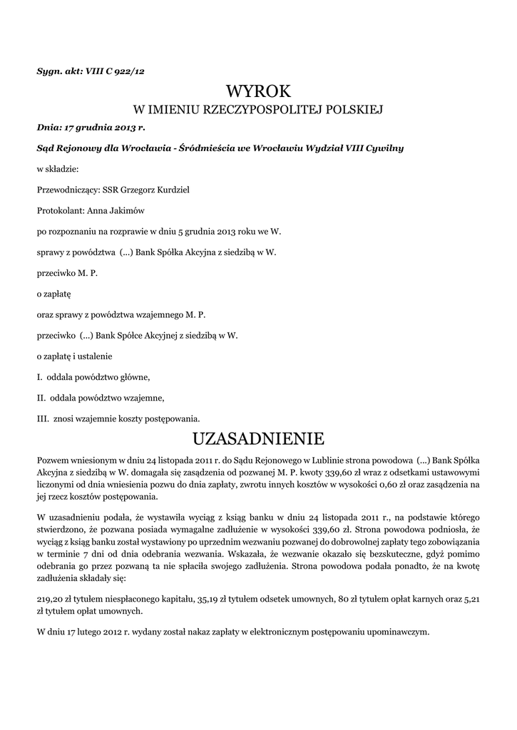Sygn. akt: VIII C 922/12 WYROK W IMIENIU RZECZYPOSPOLITEJ POLSKIEJ Dnia: 17 grudnia 2013 r. Sąd Rejonowy dla Wrocławia - Śródmieścia we Wrocławiu Wydział VIII Cywilny w składzie: Przewodniczący: SSR Grzegorz Kurdziel Protokolant: Anna Jakimów po rozpoznaniu na rozprawie w dniu 5 grudnia 2013 roku we W. sprawy z powództwa (...) Bank Spółka Akcyjna z siedzibą w W. przeciwko M. P. o zapłatę oraz sprawy z powództwa wzajemnego M. P. przeciwko (...) Bank Spółce Akcyjnej z siedzibą w W. o zapłatę i ustalenie I. oddala powództwo główne, II. oddala powództwo wzajemne, III. znosi wzajemnie koszty postępowania. UZASADNIENIE Pozwem wniesionym w dniu 24 listopada 2011 r. do Sądu Rejonowego w Lublinie strona powodowa (...) Bank Spółka Akcyjna z siedzibą w W. domagała się zasądzenia od pozwanej M. P. kwoty 339,60 zł wraz z odsetkami ustawowymi liczonymi od dnia wniesienia pozwu do dnia zapłaty, zwrotu innych kosztów w wysokości 0,60 zł oraz zasądzenia na jej rzecz kosztów postępowania. W uzasadnieniu podała, że wystawiła wyciąg z ksiąg banku w dniu 24 listopada 2011 r., na podstawie którego stwierdzono, że pozwana posiada wymagalne zadłużenie w wysokości 339,60 zł. Strona powodowa podniosła, że wyciąg z ksiąg banku został wystawiony po uprzednim wezwaniu pozwanej do dobrowolnej zapłaty tego zobowiązania w terminie 7 dni od dnia odebrania wezwania. Wskazała, że wezwanie okazało się bezskuteczne, gdyż pomimo odebrania go przez pozwaną ta nie spłaciła swojego zadłużenia. Strona powodowa podała ponadto, że na kwotę zadłużenia składały się: 219,20 zł tytułem niespłaconego kapitału, 35,19 zł tytułem odsetek umownych, 80 zł tytułem opłat karnych oraz 5,21 zł tytułem opłat umownych. W dniu 17 lutego 2012 r. wydany został nakaz zapłaty w elektronicznym postępowaniu upominawczym. Na skutek wniesienia przez pozwaną sprzeciwu od nakazu zapłaty, postanowieniem z dnia 10 kwietnia 2012 r. Sąd Rejonowy w Lublinie przekazał sprawę do rozpoznania tut. Sądowi jako Sądowi właściwości ogólnej. Pozwana wniosła o oddalenie powództwa w całości oraz o zasądzenie od strony powodowej kosztów postępowania. W uzasadnieniu podała, że zawarła umowę kredytu konsumenckiego z (...) Bank (...) S.A., a strona powodowa w wyniku umowy przelewu przejęła prawa, a także obowiązki, które w związku z tą umową wcześniej przysługiwały (...) Bank (...) S.A. Pozwana podała, że dokonała spłaty całości kredytu, a co więcej dokonała jego nadpłaty, co spowodowało, że (...) Bank (...) bezpodstawnie wzbogacił się jej kosztem. Pozwana przyznała, że kwota kredytu wyniosła 3 903,24 zł (2 993,24 zł + 910 zł), zaś całkowity koszt kredytu wynosił 787,62 zł. W odpowiedzi na sprzeciw strona powodowa wniosła o oddalenie zarzutów podniesionych przez pozwaną w sprzeciwie. Podała, że na mocy umowy cesji wierzytelności nabyła wierzytelność w stosunku do pozwanej, która w związku z brakiem spłaty kredytu w terminu stała się wymagalna. Podała także, że wezwała pozwaną do dobrowolnej spłaty kwoty zadłużenia, jednak bezskutecznie. Strona powodowa wskazała także, że wpłaty dokonane przez pozwaną zmniejszyły zadłużenie lecz nie spowodowały jego całkowitej spłaty. Strona powodowa podniosła również, że pozwana podpisując umowę kredytu oświadczyła, że otrzymała oraz zapoznała się z treścią (...) oraz W. z tabeli Opłat i Prowizji, w tym z informacją o kosztach pobieranych przez Bank w przypadku niewywiązania się z zobowiązań wynikających z umowy. Podała także, że zgodnie z warunkami opisanymi w Tabeli Opłat i Prowizji Bank każdego miesiąca naliczał opłaty karne za obsługę nieterminowej spłaty. W dniu 25 października 2012 r. pozwana wytoczyła przeciwko stronie powodowej powództwo wzajemne, które rozszerzyła pismem z dnia 20 maja 2013 r., następnie pismem z dnia 22 sierpnia 2013 r., zaś pismem z dnia 27 sierpnia 2013 r. cofnęła swoje dotychczasowe żądanie w części, a w konsekwencji wraz z powództwem wzajemnym wniosła o odrzucenie pozwu strony powodowej jako bezzasadnego wobec nieistnienia zobowiązania, zasądzenia na jej rzecz od strony powodowej kwoty 159,22 zł wraz z odsetkami ustawowymi liczonymi od tej kwoty od dnia 28 lutego 2010 r. do dnia zapłaty, (na tę kwotę składało się 132,69 zł nadpłaconego kapitału i kwota 26,63 zł tytułem odsetek liczonych od kwoty 80 zł do dnia 28 lutego 2010 r.), a także stwierdzenia przez Sąd, iż treść wyciągu z ksiąg (...) Banku S.A. jest sprzeczne ze stanem faktycznym dotyczącym przedmiotowej umowy kredytu konsumenckiego oraz o zwrot kosztów postępowania. Sąd postanowieniem z dnia 5 grudnia 2013 r. wyłączył do odrębnego rozpoznania powództwo wzajemne w zakresie roszczeń pozwanej a powódki wzajemnej zawartych w punktach od 6-11 pisma z dnia 22 sierpnia 2013 r. o ochronę dóbr osobistych i w tym też zakresie przekazał je do rozpoznania Sądowi Okręgowemu w Warszawie jako Sądowi właściwemu. W uzasadnieniu pozwu wzajemnego pozwana a powódka wzajemna podała, że kredyt, który uzyskała opiewał na kwotę 3 903,24 zł, a całkowity koszt kredytu wyniósł 787,62 zł. Podała, że była zobowiązana do spłaty w sumie kwoty 4 690,86 zł, a wysokość miesięcznej raty stanowiła równowartość 135,53 zł. Pozwana a powódka wzajemna podniosła, że dokonała na rzecz (...) S.A. wpłat 35 rat, każda w wysokości 135,53 zł, co dało kwotę 4 743,55 zł, a to przewyższało należność, do spłaty której była zobowiązana, o kwotę 52,69 zł. Podała ponadto, że poza spłatami poszczególnych rat dokonała również wpłat na poczet kredytu w wysokości 40 zł w dniu 22 maja 2007 r., 20 zł w dniu 10 sierpnia 2007 r. i 20 zł w dniu 8 stycznia 2008 r., co dało łącznie 80 zł, a w sumie z kwotą 52,69 zł wyniosło 132,69 zł. Zatem pozwana a powódka wzajemna dochodzi zwrotu kw