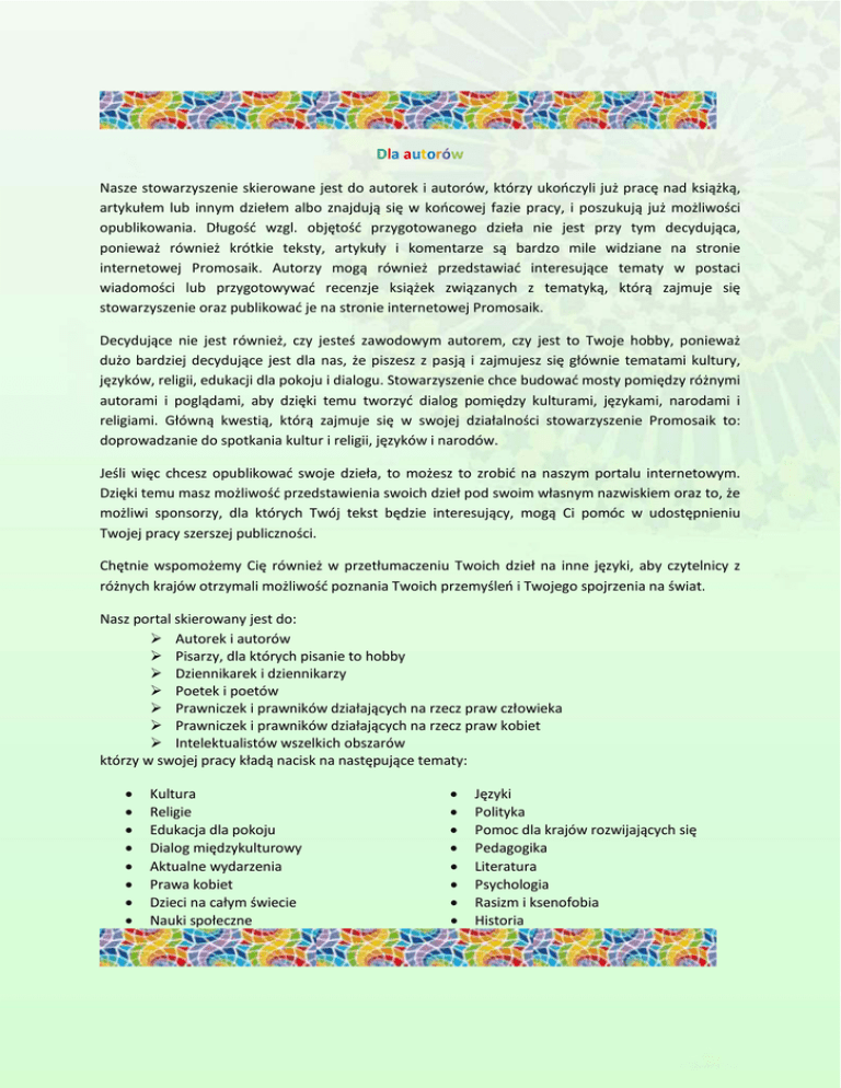 Dla autorów Nasze stowarzyszenie skierowane jest do autorek i autorów, którzy ukończyli już pracę nad książką, artykułem lub innym dziełem albo znajdują się w końcowej fazie pracy, i poszukują już możliwości opublikowania. Długość wzgl. objętość przygotowanego dzieła nie jest przy tym decydująca, ponieważ również krótkie teksty, artykuły i komentarze są bardzo mile widziane na stronie internetowej Promosaik. Autorzy mogą również przedstawiać interesujące tematy w postaci wiadomości lub przygotowywać recenzje książek związanych z tematyką, którą zajmuje się stowarzyszenie oraz publikować je na stronie internetowej Promosaik. Decydujące nie jest również, czy jesteś zawodowym autorem, czy jest to Twoje hobby, ponieważ dużo bardziej decydujące jest dla nas, że piszesz z pasją i zajmujesz się głównie tematami kultury, języków, religii, edukacji dla pokoju i dialogu. Stowarzyszenie chce budować mosty pomiędzy różnymi autorami i poglądami, aby dzięki temu tworzyć dialog pomiędzy kulturami, językami, narodami i religiami. Główną kwestią, którą zajmuje się w swojej działalności stowarzyszenie Promosaik to: doprowadzanie do spotkania kultur i religii, języków i narodów. Jeśli więc chcesz opublikować swoje dzieła, to możesz to zrobić na naszym portalu internetowym. Dzięki temu masz możliwość przedstawienia swoich dzieł pod swoim własnym nazwiskiem oraz to, że możliwi sponsorzy, dla których Twój tekst będzie interesujący, mogą Ci pomóc w udostępnieniu Twojej pracy szerszej publiczności. Chętnie wspomożemy Cię również w przetłumaczeniu Twoich dzieł na inne języki, aby czytelnicy z różnych krajów otrzymali możliwość poznania Twoich przemyśleń i Twojego spojrzenia na świat. Nasz portal skierowany jest do: Autorek i autorów Pisarzy, dla których pisanie to hobby Dziennikarek i dziennikarzy Poetek i poetów Prawniczek i prawników działających na rzecz praw człowieka Prawniczek i prawników działających na rzecz praw kobiet Intelektualistów wszelkich obszarów którzy w swojej pracy kładą nacisk na następujące tematy: • • • • • • • • Kultura Religie Edukacja dla pokoju Dialog międzykulturowy Aktualne wydarzenia Prawa kobiet Dzieci na całym świecie Nauki społeczne • • • • • • • • Języki Polityka Pomoc dla krajów rozwijających się Pedagogika Literatura Psychologia Rasizm i ksenofobia Historia Stowarzyszenie proponuje Tobie jako autorowi następujące bezpłatne usługi: • • • • • • Publikacja wiadomości, recenzji, książek, komentarzy, artykułów, i krótkich tekstów na portalu internetowym stowarzyszenia. Przygotowanie i publikacja recenzji przesłanych nam dzieł, zarówno opublikowanych jak i nieopublikowanych. Publikacja pod własnym nazwiskiem z krótkim profilem autora. Możliwość pozyskania sponsorów dla siebie i własnych dzieł. Tłumaczenie własnych dzieł na inne języki w ramach sponsoringu przez firmy i mecenasów kultury. Poszerzenie i zróżnicowania grona czytelników Twoich dzieł, dzięki ich rozpowszechnieniu w Internecie. Jeśli więc chętnie piszesz i ważne dla Ciebie jest, aby Twoje zdanie na określone tematy zostało usłyszane przez większą i bardziej zróżnicowaną publiczność oraz być może zachęciło do poważnej dyskusji i nie zaginęło pośród wielu głosów w Internecie, to Promosaik jest dokładnie tym miejscem. Nasze stowarzyszenie nie jest zainteresowane tylko tym, aby Twoje dzieła były tylko opublikowane na naszej stronie internetowej i zostały później zapomniane. Ważne dla nas jest, aby z pomocą naszego stowarzyszenia uzyskać również uwagę sponsorów, którzy pomogą Ci w tym, aby Twoje dzieła były dostępne jeszcze szerszej publiczności, bardzo chętnie również w innych krajach, a w idealnym przypadku zostały przedstawione w ramach eventów i imprez organizowanych przez stowarzyszenie. Aby opublikować tekst na naszej stronie internetowej wystarczy skontaktować się z przedstawicielem naszego stowarzyszenia w danym kraju. Ona/On doradzi Ci wtedy i opublikuje Twój tekst na stronie internetowej Promosaik. Przedstawiciele stowarzyszenia są oczywiście do Twojej dyspozycji również w kwestiach pytań dotyczących stowarzyszenia i jego celów oraz bardzo chętnie zapoznają się z Twoimi tekstami! Na zakładce Kontakt naszej strony znajdziesz adresy przedstawicieli krajowych stowarzyszenia Promosaik: link Z niecierpliwością czekamy, aby usłyszeć wzgl. przeczytać co masz nam do przekazania. Twój zespół ProMosaik www.promosaik.com [email protected]