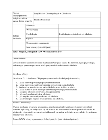 Nazwa Zespół Szkół Gimnazjalnych w Gliwicach szkoły/placówki Imię i nazwisko Bożena Sozańska autora dobrej praktyki Edukacja Wychowanie Zakres działania: Profilaktyka Profilaktyka uzależnienia od alkoholu Opieka Organizacja i zarządzanie Inne obszary (określić jakie) Tytuł: Projekt „Nałogom STOP- Wódko pozwól żyć”. Cele działania: Uświadomienie uczniom G1 oraz słuchaczom GD jakie skutki dla zdrowia, życia prywatnego, rodzinnego, społecznego może mieć spożywanie i nadużywanie alkoholu . Uzyskane efekty: Uczniowie G1 i słuchacze GD po przeprowadzeniu działań projektu wiedzą: 1. 2. 3. 4. 5. 6. 7. 8. jakie choroby powoduje spożywanie alkoholu jakie choroby nowotworowe może powodować picie alkoholu jaki wpływ na dziecko ma picie alkoholu przez kobiety w ciąży jakie skutki w życiu młodego człowieka powoduje picie alkoholu jak picie alkoholu wpływa na relacje rodzinne jak można odmówić picia alkoholu jak szybko można się uzależnić od alkoholu jak trudne jest wyjście z uzależnienia od alkoholu. Wnioski z realizacji: Wyniki ewaluacji programu uzyskane na podstawie ankiet wypełnionych przez wszystkich uczniów wykazały, że zwiększyła się ich wiedza na temat skutków nadużywania alkoholu. W większości odpowiedzi uczniowie zadeklarowali rozważne podejście w przyszłości do problemu nadużywania alkoholu. Strona WWW szkoły z prezentacją dobrej praktyki (pole nieobowiązkowe):