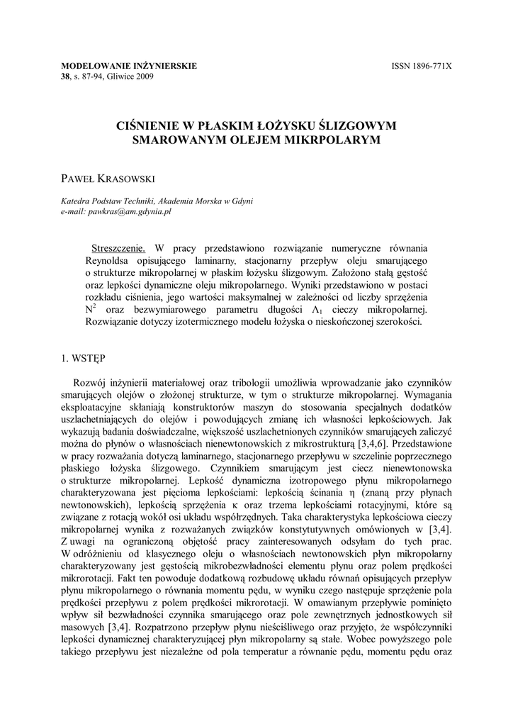 MODELOWANIE INŻYNIERSKIE 38, s. 87-94, Gliwice 2009 ISSN 1896-771X CIŚNIENIE W PŁASKIM ŁOŻYSKU ŚLIZGOWYM SMAROWANYM OLEJEM MIKRPOLARYM PAWEŁ KRASOWSKI Katedra Podstaw Techniki, Akademia Morska w Gdyni e-mail: [email protected] Streszczenie. W pracy przedstawiono rozwiązanie numeryczne równania Reynoldsa opisującego laminarny, stacjonarny przepływ oleju smarującego o strukturze mikropolarnej w płaskim łożysku ślizgowym. Założono stałą gęstość oraz lepkości dynamiczne oleju mikropolarnego. Wyniki przedstawiono w postaci rozkładu ciśnienia, jego wartości maksymalnej w zależności od liczby sprzężenia N2 oraz bezwymiarowego parametru długości Λ1 cieczy mikropolarnej. Rozwiązanie dotyczy izotermicznego modelu łożyska o nieskończonej szerokości. 1. WSTĘP Rozwój inżynierii materiałowej oraz tribologii umożliwia wprowadzanie jako czynników smarujących olejów o złożonej strukturze, w tym o strukturze mikropolarnej. Wymagania eksploatacyjne skłaniają konstruktorów maszyn do stosowania specjalnych dodatków uszlachetniających do olejów i powodujących zmianę ich własności lepkościowych. Jak wykazują badania doświadczalne, większość uszlachetnionych czynników smarujących zaliczyć można do płynów o własnościach nienewtonowskich z mikrostrukturą [3,4,6]. Przedstawione w pracy rozważania dotyczą laminarnego, stacjonarnego przepływu w szczelinie poprzecznego płaskiego łożyska ślizgowego. Czynnikiem smarującym jest ciecz nienewtonowska o strukturze mikropolarnej. Lepkość dynamiczna izotropowego płynu mikropolarnego charakteryzowana jest pięcioma lepkościami: lepkością ścinania η (znaną przy płynach newtonowskich), lepkością sprzężenia κ oraz trzema lepkościami rotacyjnymi, które są związane z rotacją wokół osi układu współrzędnych. Taka charakterystyka lepkościowa cieczy mikropolarnej wynika z rozważanych związków konstytutywnych omówionych w [3,4]. Z uwagi na ograniczoną objętość pracy zainteresowanych odsyłam do tych prac. W odróżnieniu od klasycznego oleju o własnościach newtonowskich płyn mikropolarny charakteryzowany jest gęstością mikrobezwładności elementu płynu oraz polem prędkości mikrorotacji. Fakt ten powoduje dodatkową rozbudowę układu równań opisujących przepływ płynu mikropolarnego o równania momentu pędu, w wyniku czego następuje sprzężenie pola prędkości przepływu z polem prędkości mikrorotacji. W omawianym przepływie pominięto wpływ sił bezwładności czynnika smarującego oraz pole zewnętrznych jednostkowych sił masowych [3,4]. Rozpatrzono przepływ płynu nieściśliwego oraz przyjęto, że współczynniki lepkości dynamicznej charakteryzującej płyn mikropolarny są stałe. Wobec powyższego pole takiego przepływu jest niezależne od pola temperatur a równanie pędu, momentu pędu oraz 88 P. KRASOWSKI równanie ciągłości przepływu stanowią zamknięty układ równań ruchu. Powyższe równania są wyprowadzone i szczegółowo omówione w pracach [2,3]. Elementami nowości w niniejszej pracy jest uzyskanie rozwiązania analityczno numerycznego, zbieżnego w przypadku granicznym do rozwiązania przy smarowaniu olejem newtonowskim. Rozwiązanie dotyczy łożyska płaskiego o nieskończonej szerokości. 2. RÓWNANIE REYNOLDSA W pracy przyjęto stałe wartości lepkości oleju mikropolarnego, niezależne od warunków termicznych i ciśnieniowych w łożysku. Wielkości współczynników lepkości uzależniono od lepkości dynamicznej ścinania η, która jest decydującą lepkością w przypadku płynów newtonowskich. Ciśnienie odniesienia p0 jest też określone na podstawie tej lepkości, aby uzyskane wyniki dla olejów mikropolarnych można było porównać z olejem newtonowskim. W olejach mikropolarnych decydujące znaczenie [1,3] ma wartość lepkości dynamicznej sprzężenia κ. W niektórych pracach dotyczących smarowania łożysk olejem mikropolarnym można spotkać sumę tych dwóch lepkości jako efektywną lepkość dynamiczną smarowania mikropolarnego. W niniejszej pracy lepkość sprzężenia scharakteryzowano liczbą sprzężenia N2, która dla oleju newtonowskiego jest równa zero: N= k h+ k 0 £ N <1 (1) Wartość N2 w przypadku cieczy mikropolarnej określa udział lepkości sprzężenia w efektywnej lepkości dynamicznej oleju. Z liczby sprzężenia N2 można wyznaczyć stosunek obu lepkości dynamicznych, który jest bezwymiarową lepkością sprzężenia κ1: k1 = k N2 = h 1- N2 k1 ³ 0 (2) Z dynamicznych lepkości rotacyjnych przy laminarnym smarowaniu poszczególne lepkości porównywalne są w stosunku do lepkości γ, którą wielu autorów [3] uważa za najważniejszą. Jej stosunek do lepkości ścinania η związany jest z charakterystyczną długością mikropolarną Λ przepływu, który w przypadku płynu newtonowskiego przyjmuje wartość zero. Bezwymiarowa wielkość Λ1 długości mikropolarnej oraz długość mikropolarna Λ zdefiniowane są następująco: L= g ; h LL1 = e (3) Bezwymiarowa długość mikropolarna Λ1 w przypadku oleju newtonowskiego dąży do nieskończoności. Analizę przepływu w szczelinie smarnej płaskiego łożyska przeprowadzono w układzie współrzędnych prostokątnych x, y, z, gdzie współrzędna x określa kierunek wzdłużny łożyska, współrzędna y kierunek wysokości szczeliny smarnej a współrzędna z określa kierunek szerokości łożyska płaskiego. Schemat przekroju poprzecznego szczeliny smarnej pokazano na rys.1. Szczelinę smarną opisano następującymi parametrami CIŚNIENIE W PŁASKIM ŁOŻYSKU ŚLIZGOWYM SMAROWANYM OLEJEM MIKROPOLARNYM 89 geometrycznymi: maksymalną wysokością szczeliny ho, minimalną wysokością szczeliny he, długością L szczeliny oraz szerokością b. W niniejszej pracy założono, że obie powierzchnie współpracujące zachowują identyczne wymiary szczeliny smarnej wzdłuż jej szerokości, czyli że nie występuje p