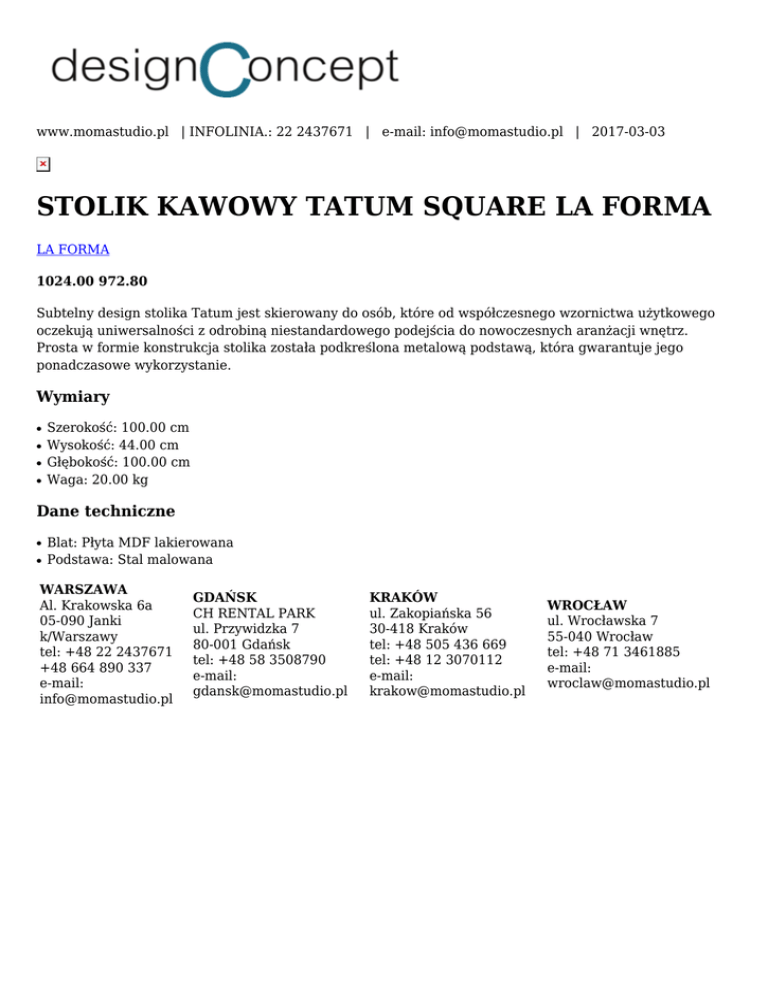 www.momastudio.pl | INFOLINIA.: 22 2437671 | e-mail: [email protected] | 2017-03-03 STOLIK KAWOWY TATUM SQUARE LA FORMA LA FORMA 1024.00 972.80 Subtelny design stolika Tatum jest skierowany do osób, które od współczesnego wzornictwa użytkowego oczekują uniwersalności z odrobiną niestandardowego podejścia do nowoczesnych aranżacji wnętrz. Prosta w formie konstrukcja stolika została podkreślona metalową podstawą, która gwarantuje jego ponadczasowe wykorzystanie. Wymiary ● ● ● ● Szerokość: 100.00 cm Wysokość: 44.00 cm Głębokość: 100.00 cm Waga: 20.00 kg Dane techniczne ● ● Blat: Płyta MDF lakierowana Podstawa: Stal malowana WARSZAWA Al. Krakowska 6a 05-090 Janki k/Warszawy tel: +48 22 2437671 +48 664 890 337 e-mail: [email protected] GDAŃSK CH RENTAL PARK ul. Przywidzka 7 80-001 Gdańsk tel: +48 58 3508790 e-mail: [email protected] KRAKÓW ul. Zakopiańska 56 30-418 Kraków tel: +48 505 436 669 tel: +48 12 3070112 e-mail: [email protected] WROCŁAW ul. Wrocławska 7 55-040 Wrocław tel: +48 71 3461885 e-mail: [email protected]