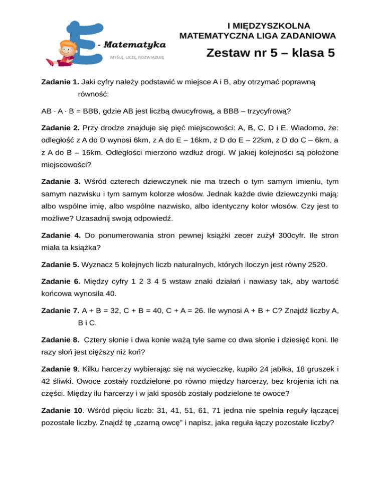 I MIĘDZYSZKOLNA MATEMATYCZNA LIGA ZADANIOWA Zestaw nr 5 – klasa 5 Zadanie 1. Jaki cyfry należy podstawić w miejsce A i B, aby otrzymać poprawną równość: AB ∙ A ∙ B = BBB, gdzie AB jest liczbą dwucyfrową, a BBB – trzycyfrową? Zadanie 2. Przy drodze znajduje się pięć miejscowości: A, B, C, D i E. Wiadomo, że: odległość z A do D wynosi 6km, z A do E – 16km, z D do E – 22km, z D do C – 6km, a z A do B – 16km. Odległości mierzono wzdłuż drogi. W jakiej kolejności są położone miejscowości? Zadanie 3. Wśród czterech dziewczynek nie ma trzech o tym samym imieniu, tym samym nazwisku i tym samym kolorze włosów. Jednak każde dwie dziewczynki mają: albo wspólne imię, albo wspólne nazwisko, albo identyczny kolor włosów. Czy jest to możliwe? Uzasadnij swoją odpowiedź. Zadanie 4. Do ponumerowania stron pewnej książki zecer zużył 300cyfr. Ile stron miała ta książka? Zadanie 5. Wyznacz 5 kolejnych liczb naturalnych, których iloczyn jest równy 2520. Zadanie 6. Między cyfry 1 2 3 4 5 wstaw znaki działań i nawiasy tak, aby wartość końcowa wynosiła 40. Zadanie 7. A + B = 32, C + B = 40, C + A = 26. Ile wynosi A + B + C? Znajdź liczby A, B i C. Zadanie 8. Cztery słonie i dwa konie ważą tyle same co dwa słonie i dziesięć koni. Ile razy słoń jest cięższy niż koń? Zadanie 9. Kilku harcerzy wybierając się na wycieczkę, kupiło 24 jabłka, 18 gruszek i 42 śliwki. Owoce zostały rozdzielone po równo między harcerzy, bez krojenia ich na części. Między ilu harcerzy i w jaki sposób zostały podzielone te owoce? Zadanie 10. Wśród pięciu liczb: 31, 41, 51, 61, 71 jedna nie spełnia reguły łączącej pozostałe liczby. Znajdź tę „czarną owcę” i napisz, jaka reguła łączy pozostałe liczby?