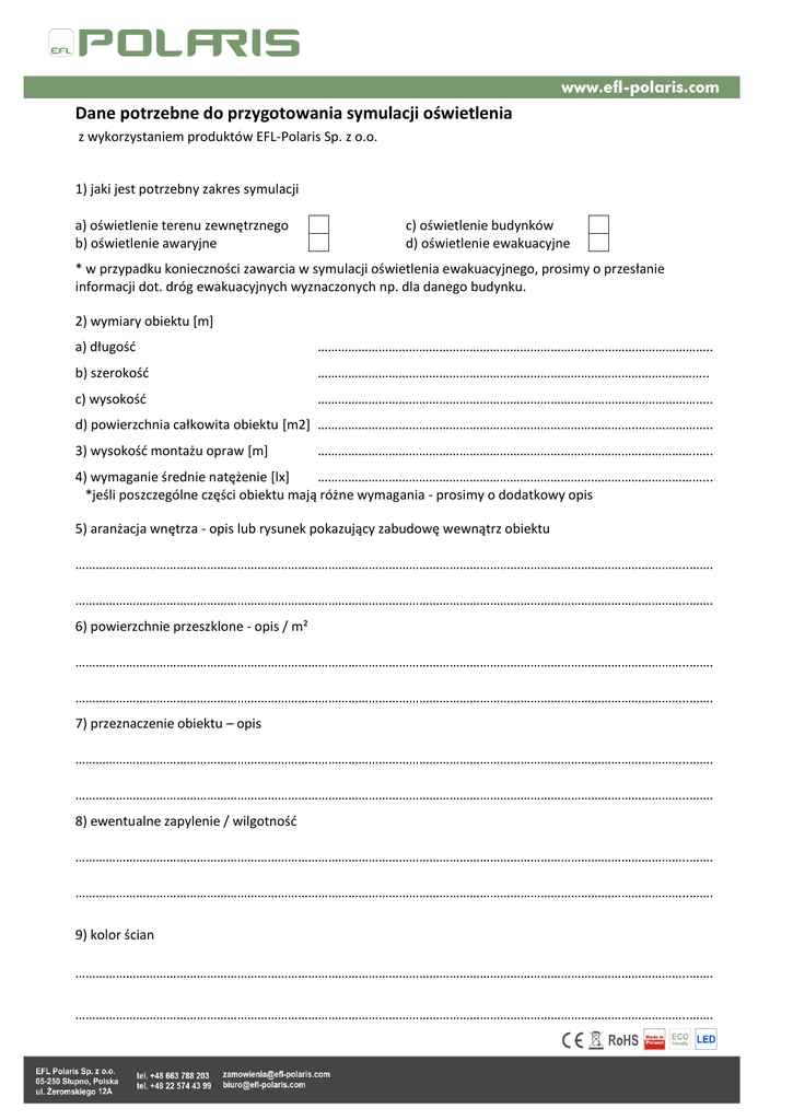 Dane potrzebne do przygotowania symulacji oświetlenia z wykorzystaniem produktów EFL-Polaris Sp. z o.o. 1) jaki jest potrzebny zakres symulacji a) oświetlenie terenu zewnętrznego b) oświetlenie awaryjne c) oświetlenie budynków d) oświetlenie ewakuacyjne * w przypadku konieczności zawarcia w symulacji oświetlenia ewakuacyjnego, prosimy o przesłanie informacji dot. dróg ewakuacyjnych wyznaczonych np. dla danego budynku. 2) wymiary obiektu [m] a) długośd ……………………………………………………………………….…………………………….. b) szerokośd …………………………………………………………………………………………………….. c) wysokośd …………………………………………………………………….……………………………….. d) powierzchnia całkowita obiektu [m2] ………………………………………………………………………………….………………….. 3) wysokośd montażu opraw [m] ………………………………………………………………………………………………….….. 4) wymaganie średnie natężenie [lx] ……………………………………………………………………………………………………... *jeśli poszczególne części obiektu mają różne wymagania - prosimy o dodatkowy opis 5) aranżacja wnętrza - opis lub rysunek pokazujący zabudowę wewnątrz obiektu ………………………………………………………………………………………………………………………………………………………………..……. ………………………………………………………………………………………………………………………………………………………………..……. 6) powierzchnie przeszklone - opis / m² ………………………………………………………………………………………………………………………………………………………………..……. ………………………………………………………………………………………………………………………………………………………………..……. 7) przeznaczenie obiektu – opis ………………………………………………………………………………………………………………………………………………………………..……. ………………………………………………………………………………………………………………………………………………………………..……. 8) ewentualne zapylenie / wilgotnośd ………………………………………………………………………………………………………………………………………………………………..……. ………………………………………………………………………………………………………………………………………………………………..……. 9) kolor ścian ………………………………………………………………………………………………………………………………………………………………..……. ………………………………………………………………………………………………………………………………………………………………..……. Dane potrzebne do przygotowania symulacji oświetlenia z wykorzystaniem produktów EFL-Polaris Sp. z o.o. 10) opis obecnie zastosowanych opraw symbol / producent ………………………………………………………………………………………….. ilośd opraw [szt] ………………………………………………………………………………………….. moc opraw [W] ………………………………………………………………………………………….. rodzaj źródła światła ………………………………………………………………………………………….. zasilanie opraw - 230 V / inne ………………………………………………………………………………………….. * system dotychczasowy – dodatkowy opis ………………………………………………………………………………………………………………………………………………………………..……. ………………………………………………………………………………………………………………………………………………………………..……. 11) system docelowy – opis ………………………………………………………………………………………………………………………………………………………………..……. ………………………………………………………………………………………………………………………………………………………………..……. 12) potrzebne ewentualnie opcje - np. sterowanie oświetleniem – opis ………………………………………………………………………………………………………………………………………………………………..……. ………………………………………………………………………………………………………………………………………………………………..……. 13) uwagi dodatkowe ………………………………………………………………………………………………………………………………………………………………..……. ………………………………………………………………………………………………………………………………………………………………..……. 14) prosimy przesład d