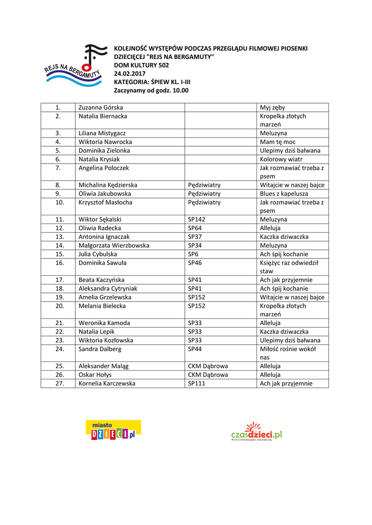 KOLEJNOŚĆ WYSTĘPÓW PODCZAS PRZEGLĄDU FILMOWEJ PIOSENKI DZIECIĘCEJ "REJS NA BERGAMUTY" DOM KULTURY 502 24.02.2017 KATEGORIA: ŚPIEW KL. I-III Zaczynamy od godz. 10.00 1. 2. Zuzanna Górska Natalia Biernacka 3. 4. 5. 6. 7. Liliana Mistygacz Wiktoria Nawrocka Dominika Zielonka Natalia Krysiak Angelina Poloczek 8. 9. 10. Michalina Kędzierska Oliwia Jakubowska Krzysztof Masłocha Pędziwiatry Pędziwiatry Pędziwiatry 11. 12. 13. 14. 15. 16. Wiktor Sękalski Oliwia Radecka Antonina Ignaczak Małgorzata Wierzbowska Julia Cybulska Dominika Sawuła SP142 SP64 SP37 SP34 SP6 SP46 17. 18. 19. 20. Beata Kaczyńska Aleksandra Cytryniak Amelia Grzelewska Melania Bielecka SP41 SP41 SP152 SP152 21. 22. 23. 24. Weronika Kamoda Natalia Lepik Wiktoria Kozłowska Sandra Dalberg SP33 SP33 SP33 SP44 25. 26. 27. Aleksander Maląg Oskar Hołys Kornelia Karczewska CKM Dąbrowa CKM Dąbrowa SP111 Myj zęby Kropelka złotych marzeń Meluzyna Mam tę moc Ulepimy dziś bałwana Kolorowy wiatr Jak rozmawiać trzeba z psem Witajcie w naszej bajce Blues z kapelusza Jak rozmawiać trzeba z psem Meluzyna Alleluja Kaczka dziwaczka Meluzyna Ach śpij kochanie Księżyc raz odwiedził staw Ach jak przyjemnie Ach śpij kochanie Witajcie w naszej bajce Kropelka złotych marzeń Alleluja Kaczka dziwaczka Ulepimy dziś bałwana Miłość rośnie wokół nas Alleluja Alleluja Ach jak przyjemnie