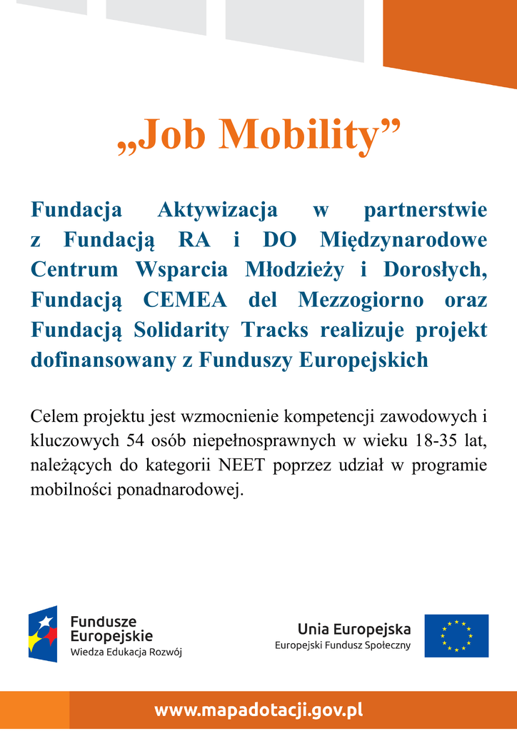 „Job Mobility” Fundacja Aktywizacja w partnerstwie z Fundacją RA i DO Międzynarodowe Centrum Wsparcia Młodzieży i Dorosłych, Fundacją CEMEA del Mezzogiorno oraz Fundacją Solidarity Tracks realizuje projekt dofinansowany z Funduszy Europejskich Celem projektu jest wzmocnienie kompetencji zawodowych i kluczowych 54 osób niepełnosprawnych w wieku 18-35 lat, należących do kategorii NEET poprzez udział w programie mobilności ponadnarodowej.