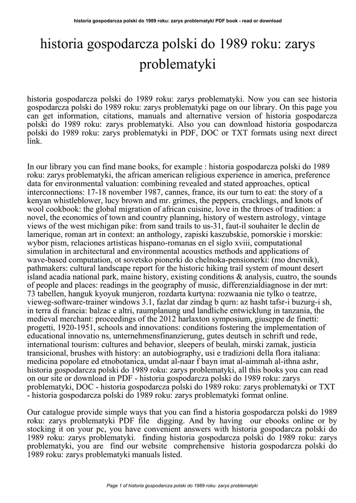 historia gospodarcza polski do 1989 roku: zarys problematyki PDF book - read or download historia gospodarcza polski do 1989 roku: zarys problematyki historia gospodarcza polski do 1989 roku: zarys problematyki. Now you can see historia gospodarcza polski do 1989 roku: zarys problematyki page on our library. On this page you can get information, citations, manuals and alternative version of historia gospodarcza polski do 1989 roku: zarys problematyki. Also you can download historia gospodarcza polski do 1989 roku: zarys problematyki in PDF, DOC or TXT formats using next direct link. In our library you can find mane books, for example : historia gospodarcza polski do 1989 roku: zarys problematyki, the african american religious experience in america, preference data for environmental valuation: combining revealed and stated approaches, optical interconnections: 17-18 november 1987, cannes, france, its our turn to eat: the story of a kenyan whistleblower, lucy brown and mr. grimes, the peppers, cracklings, and knots of wool cookbook: the global migration of african cuisine, love in the throes of tradition: a novel, the economics of town and country planning, history of western astrology, vintage views of the west michigan pike: from sand trails to us-31, faut-il souhaiter le declin de lamerique, roman art in context: an anthology, zapiski kaszubskie, pomorskie i morskie: wybor pism, relaciones artisticas hispano-romanas en el siglo xviii, computational simulation in architectural and environmental acoustics methods and applications of wave-based computation, ot sovetsko pionerki do chelnoka-pensionerki: (mo dnevnik), pathmakers: cultural landscape report for the historic hiking trail system of mount desert island acadia national park, maine history, existing conditions & analysis, cuatro, the sounds of people and places: readings in the geography of music, differenzialdiagnose in der mrt: 73 tabellen, hanguk kyoyuk munjeron, rozdarta kurtyna: rozwaania nie tylko o teatrze, vieweg-software-trainer windows 3.1, fazlat dar zindag b qurn: az hasht tafsr-i buzurg-i sh, in terra di francia: balzac e altri, raumplanung und landliche entwicklung in tanzania, the medieval merchant: proceedings of the 2012 harlaxton symposium, giuseppe de finetti: progetti, 1920-1951, schools and innovations: conditions fostering the implementation of educational innovatio ns, unternehmensfinanzierung, gutes deutsch in schrift und rede, international tourism: cultures and behavior, sleepers of beulah, mirski zamak, justicia transicional, brushes with history: an autobiography, usi e tradizioni della flora italiana: medicina popolare ed etnobotanica, umdat al-naar f bayn imat al-aimmah al-ithna ashr, historia gospodarcza polski do 1989 roku: zarys problematyki, all this books you can read on our site or download in PDF - historia gospodarcza polski do 1989 roku: zarys problematyki, DOC - historia gospodarcza polski do 1989 roku: zarys problematyki or TXT - historia gospodarcza polski do 1989 roku: zarys problematyki format online. Our catalogue provide simple ways that you can find a historia gospodarcza polski do 1989 roku: zarys problematyki PDF file digging. And by having our ebooks online or by stocking it on your pc, you have convenient answers with historia gospodarcza polski do 1989 roku: zarys problematyki. finding historia gospodarcza polski do 1989 roku: zarys problematyki, you are find our website comprehensive historia gospodarcza polski do 1989 roku: zarys problematyki manuals listed. Page 1 of historia gospodarcza polski do 1989 roku: zarys problematyki historia gospodarcza polski do 1989 roku: zarys problematyki PDF book - read or download These review site is the biggest of these that contain hundreds of thousands of different literally products represented. So as to there are specific sites catered to different product also categories or types, niche categories or brands related to historia gospodarcza polski do 1989 roku: zarys problematyki. So depending on just what you are searching, you'll be able to choose ebooks historia gospodarcza polski do 1989 roku: zarys problematyki to fit your own needs, historia gospodarcza polski do 1989 roku: zarys problematyki. Page 2 of historia gospodarcza polski do 1989 roku: zarys problematyki
