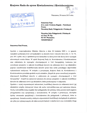1. Krajowa Rada do spraw Krwiodawstwa i Krwiolecznictwa :BA! R ^ Warszawa, 29 marca 2013 roku VM Warszawie 1 rdz, t V.L 5. 2013 J(f$ Szanowna Pani dr n. med. Grażyna Rogala - Pawelczyk Prezes Naczelnej Rady Pielęgniarek i Położnych Naczelna Izba Pielęgniarek i Położnych ul. Pory 78. Xp. 02-757 Warszawa [email protected] Szanowna Pani Prezes, Zgodnie z rozporządzeniem Ministra Zdrowia z dnia 18 kwietnia 2005 r. w sprawie warunków pobierania krwi od kandydatów na dawców krwi i dawców krwi (Dz. U. Nr 79, poz. 691 z późn. zm.) o spełnieniu przez kandydata na dawcę krwi lub dawcę krwi wymagań zdrowotnych orzeka lekarz. W opinii Krajowej Rady ds. Krwiodawstwa i Krwiolecznictwa oraz odniesieniu do wymogów obowiązujących w Unii Europejskiej, konieczna jest nowelizacji przepisów w zakresie kwalifikacji dawców do oddawania krwi i jej składników poprzez umożliwienie kwalifikowania dawców przez inne osoby posiadające odpowiednie wykształcenie medyczne. W związku z powyższym, Krajowa Rada ds. Krwiodawstwa i Krwiolecznictwa powoiała spośród swych członków „Zespół do spraw nowelizacji przepisów, dotyczących kwalifikacji dawców w odniesieniu do wymogów obowiązujących w Unii Europejskiej". Zespół ten opracował założenia do zmiany przepisów w zakresie kwalifikacji dawców do oddawania krwi i jej składników, które przekazujemy w załączeniu. Zgodnie z wyżej wspomnianymi założeniami, kwalifikacji dawców do oddawania krwi i jej składników mógłby dokonywać lekarz lub osoba wykwalifikowana pod nadzorem lekarza. Osobą wykwalifikowaną mogłaby być pielęgniarka lub położna, która posiada tytuł magistra pielęgniarstwa oraz specjalizację z krwiodawstwa. W związku z powyższym, niezbędne byłoby utworzenie specjalizacji z krwiodawstwa dla pielęgniarek i położnych, która to specjalizacja formalizowałaby zdobycie odpowiednich kwalifikacji niezbędnych do pełnienia nie tylko już wykonywanych, ale także nowych funkcji w służbie krwi oraz otwierałaby drogę Krajowa Rada do spraw Krwiodawstwa i Krwiolecznictwa do doskonalenia zawodowego szerokiej rzeszy przedstawicieli tej grupy zawodowej, która pracuje w jednostkach publicznej służby krwi. W nawiązaniu do przedmiotowej dyskusji Krajowej Rady ds. Krwiodawstwa i Krwiolecznictwa, zwracam się z uprzejmą prośbą o wskazanie, czy w przypadku podjęcia kursów w ramach specjalizacji przez pielęgniarkę lub położną wymagane jest wyższe wykształcenie oraz w jakim zakresie (tytuł magistra, licencjat). Przewodniczący Krajowej Rady do spraw Krwiodawstwa i Krwiolecznictwa dr hab. n. med. Ryszard Pogłód Krajowa Rada do spraw Krwiodawstwa i Krwiolecznictwa Warszawa, 26 lutego 2013 roku Pan Krzysztof Chlebus Podsekretarz Stanu w Ministerstwie Zdrowia REKOMENDACJA W nawiązaniu do posiedzenia, które odbyło się 26 lutego 2013 roku oraz w oparciu 0 przeprowadzoną dyskusję i głosowanie, Krajowa Rada do spraw Krwiodawstwa 1 Krwiolecznictwa przedkłada Ministrowi Zdrowia przyjętą rekomendacj ę. Krajowa Rada do spraw Krwiodawstwa i Krwiolecznictwa zgłasza wniosek do Ministra Zdrowia o zaakceptowanie rekomendacji dotyczącej przekazywania ze Stacji SanitarnoEpidemiologicznej do Regionalnego Centrum Krwiodawstwa i Krwiolecznictwa zwrotnych danych epidemiologicznych, określonych w ustawie z dnia 5 grudnia 2008 r. o zapobieganiu oraz zwalczaniu zakażeń i chorób zakaźnych u ludzi (Dz. U, Nr 234, poz. 1570, z późn. zm.) które mają ogromne znaczenie z punktu widzenia analizy ryzykownych zachowań krwiodawców (dotyczy to głównie ryzykownych zachowań seksualnych) i ilościowego rozróżnienia pomiędzy „ryzykiem" a „wysokim ryzykiem" nabycia ciężkiej choroby zakaźnej przenoszonej drogą transfuzji krwi. Uzyskane tą drogą dane pozwolą na dalsze zwiększenie bezpieczeństwa krwi i będą pomocne w przeprowadzeniu ograniczonej analizy epidemiologicznej zakażeń wśród krwiodawców. Gromadzenie i analiza takich danych w kontekście rozróżnienia między zachowaniem ryzykownym, a wysoce ryzykownym jest zalecana w projekcie Rezolucji TS057 Europejskiego Komitetu d.s. Przetaczania Krwi (CD-P-TS) - „Risk Behaviours having an impact on Blood Donor Management and Transfusion Safety". Krajowa Rada do spraw Krwiodawstwa i Krwiolecznictwa Rekomendacja Krajowej Rady ds. Krwiodawstwa i Krwiolecznictwa została zatwierdzona większością głosów podczas przeprowadzonego głosowania. Wyniki glosowania: 9 osób było za przyjęciem wniosku, nikt nie zgłosił sprzeciwu oraz nikt nie wstrzymał się od głosu. Przewodniczący Krajowej Rad/do Spraw Krwiodawstwa i Krwiolecznictwa dr hab. n. med. Ryszard Pogłód Krajowa Rada do spraw Krwiodawstwa i Krwiolecznictwa Warszawa, 26 lutego 2013 roku Fan Krzysztof Chlebus Podsekretarz Stanu w Ministerstwie Zdrowia REKOMENDACJA W nawiązaniu do posiedzenia, które odbyło się 26 lutego 2013 roku oraz w oparciu 0 przeprowadzoną dyskusję i głosowanie, Krajowa Rada do spraw Krwiodawstwa 1 Krwiolecznictwa przedkłada Ministrowi Zdrowia przyjętą rekomendację. Krajowa Rada do spraw Krwiodawstwa i Krwiolecznictwa zgłasza wniosek do Ministra Zdrowia o zaakceptowanie rekomendacji dotyczącej zmiany rozporządzenia Ministra Zdrowia z dnia 20.09.2012 r. w sprawie standardów postępowania medycznego przy udzielaniu świadczeń zdrowotnych z zakresu opieki okołoporodowej sprawowanej nad kobietą w okresie fizjologicznej ciąży, fizjologicznego porodu, połogu oraz opieki nad noworodkiem i dostosowanie zapisów w Medycznych zasadach pobierania krwi, oddzielania t1 jej składników i wydawania, obowiązujące w jednostkach organizacyjnych publicznej służby krwi" w celu ujednolicenia zapisów znajdujących się w ww. dokumentach, aby przeciwciała odpornościowe skierowane przeciwko antygenom krwinek czerwonych były oznaczane u wszystkich kobiet ciężarnych w okresie do 12 tygodnia ciąży. W dyskusji nad rekomendacją członkowie Krajowej
