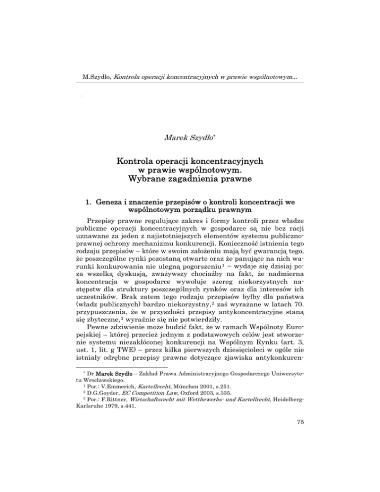 M.Szydło, Kontrola operacji koncentracyjnych w prawie wspólnotowym... Marek Szydło * Kontrola operacji koncentracyjnych w prawie wspólnotowym. Wybrane zagadnienia prawne 1. Geneza i znaczenie przepisów o kontroli koncentracji we wspólnotowym porządku prawnym Przepisy prawne regulujące zakres i formy kontroli przez władze publiczne operacji koncentracyjnych w gospodarce są nie bez racji uznawane za jeden z najistotniejszych elementów systemu publicznoprawnej ochrony mechanizmu konkurencji. Konieczność istnienia tego rodzaju przepisów – które w swoim założeniu mają być gwarancją tego, że poszczególne rynki pozostaną otwarte oraz że panujące na nich warunki konkurowania nie ulegną pogorszeniu 1 − wydaje się dzisiaj poza wszelką dyskusją, zważywszy chociażby na fakt, że nadmierna koncentracja w gospodarce wywołuje szereg niekorzystnych następstw dla struktury poszczególnych rynków oraz dla interesów ich uczestników. Brak zatem tego rodzaju przepisów byłby dla państwa (władz publicznych) bardzo niekorzystny, 2 zaś wyrażane w latach 70. przypuszczenia, że w przyszłości przepisy antykoncentracyjne staną się zbyteczne, 3 wyraźnie się nie potwierdziły. Pewne zdziwienie może budzić fakt, że w ramach Wspólnoty Europejskiej – której przecież jednym z podstawowych celów jest stworzenie systemu niezakłóconej konkurencji na Wspólnym Rynku (art. 3, ust. 1, lit. g TWE) – przez kilka pierwszych dziesięcioleci w ogóle nie istniały odrębne przepisy prawne dotyczące zjawiska antykonkuren* Dr Marek Szydło – Zakład Prawa Administracyjnego Gospodarczego Uniwersytetu Wrocławskiego. 1 Por.: V.Emmerich, Kartellrecht, München 2001, s.251. 2 D.G.Goyder, EC Competition Law, Oxford 2003, s.335. 3 Por.: F.Rittner, Wirtschaftsrecht mit Wettbewerbs- und Kartellrecht, HeidelbergKarlsruhe 1979, s.441. 75 Studia Europejskie, 4/2005 cyjnej koncentracji. 4 Jakiekolwiek by jednak były tego powody, brak wzmiankowanych przepisów nie oznaczał bynajmniej, że operacje koncentracyjne pozostawały in toto poza obszarem zainteresowania oraz kontroli ze strony prawa wspólnotowego. Tak z całą pewnością nie było, jako że organy wspólnotowe (a zwłaszcza Komisja oraz Europejski Trybunał Sprawiedliwości) próbowały w tym celu wykorzystywać reguły konkurencji zawarte w art. 81 i 82 TWE (które to przepisy chronią – co szczególnie warto w omawianym tutaj kontekście podkreślić – nie tylko konkurencję aktualną, ale również konkurencję potencjalną). 5 I tak, w sprawie Continental Can Trybunał stwierdził, że w sytuacji, gdy przedsiębiorstwo posiadające pozycję dominującą na rynku nabywa (lub przejmuje) swojego konkurenta, tak, że dochodzi do znaczącego skrępowania konkurencji na tymże rynku (oraz do uniemożliwienia tam normalnego rozwoju konkurencji), to wówczas można mówić o – zakazanym przez art. 82 TWE – nadużyciu przez wspomniane przedsiębiorstwo pozycji dominującej. 6 Z kolei w sprawie Philip Morris ETS uznał, iż nabycie przez jedno przedsiębiorstwo określonego (nawet mniejszościowego) udziału kapitałowego w drugim (konkurencyjnym) przedsiębiorstwie może służyć temu pierwszemu podmiotowi jako instrument wpływania na działalność swojego konkurenta i to wpływania powodującego ograniczenie lub zniekształcenie konkurencji na tym rynku, na którym oba podmioty wspólnie działają. Wpływ taki wystąpi zwłaszcza wówczas, gdy przedsiębiorstwo nabywające udział kapitałowy zapewni sobie kontrolę nad swoim konkurentem lub też, gdy umowa w sprawie nabycia udziałów (akcji) tego drugiego podmiotu będzie przewidywała współpracę pomiędzy obydwoma przedsiębiorstwami w zakresie ustalania strategii działania na rynku. W takim przypadku wspomniana umowa w sprawie nabycia udziału kapitałowego będzie mogła być uznana za przejaw – 4 Precyzyjnie rzecz ujmując, przepisów takich nie było w Traktacie Rzymskim (ustanawiającym EWG) oraz w ustawodawstwie wtórnym. Natomiast przepis umożliwiający prewencyjną kontrolę koncentracji znajdował się w – już nieobowiązującym – Traktacie o utworzeniu Europejskiej Wspólnoty Węgla i Stali (zob. art. 66 TEWWiS). 5 Orzeczenia ETS w sprawach: 45/85 Verband der Sachversicherer przeciwko Komisji, Zbiór Orzeczeń 1987, s.405; 85/76 Hoffmann-La Roche i Co AG przeciwko Komisji, Zbiór Orzeczeń 1979, s.461. 6 Orzeczenie ETS w sprawie 6/72 Europemballage Corporation i Continental Can Company Inc. przeciwko Komisji, Zbiór Orzeczeń 1973, s.215; zob. też decyzję Komisji w sprawie Warner-Lambert/Gillette, O. J., L 116/21/1993. 76 M.Szydło, Kontrola operacji koncentracyjnych w prawie wspólnotowym... zakazanego przez art. 81, ust. 1 TWE – porozumienia ograniczającego konkurencję. 7 Od razu jednak trzeba zauważyć, że zwalczanie operacji koncentracyjnych (w tym też operacji polegających – tak jak w powyższych przykładach – na nabywaniu lub przejmowaniu konkurentów lub też na uzyskiwaniu wpływu na nich) jedynie za pomocą art. 81 i 82 TWE byłoby dalece niewystarczające i nie gwarantowałoby skutecznej ochrony mechanizmu konkurencji. Art. 81 TWE zakazuje bowiem zawierania antykonkurencyjnych porozumień pomiędzy samodzielnymi (w sensie prawnym i organizacyjnym) przedsiębiorstwami i trudno sobie wyobrazić, aby mógł on być w takiej właśnie postaci stosowany wobec wszystkich rodzajów koncentracji (np. w stosunku do fuzji czy inkorporacji). 8 Z kolei art. 82 TWE jest o tyle ułomnym instrumentem zwalczania antykompetytywnych operacji koncentracyjnych, że pozwala kwestionować jedynie te z nich, w których uczestniczy przedsiębiorstwo już posiadające pozycję dominującą na rynku. Jeżeli natomiast żadne z uczestniczących w danej koncentracji przedsiębiorstw nie posiada takiej pozycji i zostaje ona stworzona dopiero w wyniku dokonania koncentracji, wówczas taka sytuacja nie mieści się w hipotezie normy zawarte