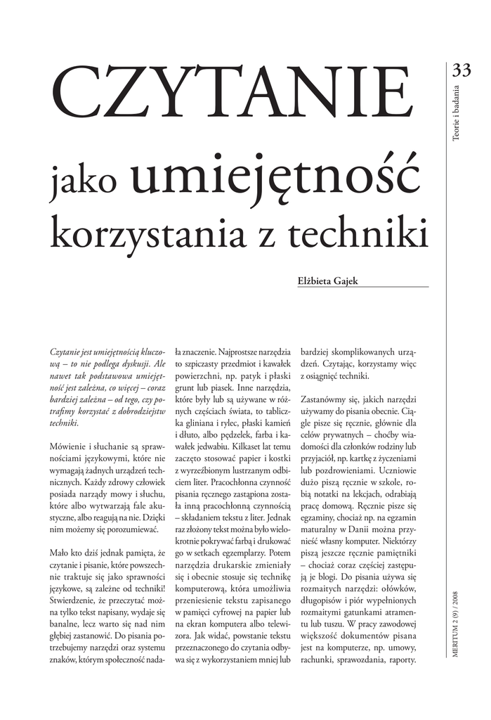 jako umiejętność Teorie i badania CZYTANIE 33 korzystania z techniki Elżbieta Gajek Mówienie i słuchanie są sprawnościami językowymi, które nie wymagają żadnych urządzeń technicznych. Każdy zdrowy człowiek posiada narządy mowy i słuchu, które albo wytwarzają fale akustyczne, albo reagują na nie. Dzięki nim możemy się porozumiewać. Mało kto dziś jednak pamięta, że czytanie i pisanie, które powszechnie traktuje się jako sprawności językowe, są zależne od techniki! Stwierdzenie, że przeczytać można tylko tekst napisany, wydaje się banalne, lecz warto się nad nim głębiej zastanowić. Do pisania potrzebujemy narzędzi oraz systemu znaków, którym społeczność nada- ła znaczenie. Najprostsze narzędzia to szpiczasty przedmiot i kawałek powierzchni, np. patyk i płaski grunt lub piasek. Inne narzędzia, które były lub są używane w różnych częściach świata, to tabliczka gliniana i rylec, płaski kamień i dłuto, albo pędzelek, farba i kawałek jedwabiu. Kilkaset lat temu zaczęto stosować papier i kostki z wyrzeźbionym lustrzanym odbiciem liter. Pracochłonna czynność pisania ręcznego zastąpiona została inną pracochłonną czynnością – składaniem tekstu z liter. Jednak raz złożony tekst można było wielokrotnie pokrywać farbą i drukować go w setkach egzemplarzy. Potem narzędzia drukarskie zmieniały się i obecnie stosuje się technikę komputerową, która umożliwia przeniesienie tekstu zapisanego w pamięci cyfrowej na papier lub na ekran komputera albo telewizora. Jak widać, powstanie tekstu przeznaczonego do czytania odbywa się z wykorzystaniem mniej lub bardziej skomplikowanych urządzeń. Czytając, korzystamy więc z osiągnięć techniki. Zastanówmy się, jakich narzędzi używamy do pisania obecnie. Ciągle pisze się ręcznie, głównie dla celów prywatnych – choćby wiadomości dla członków rodziny lub przyjaciół, np. kartkę z życzeniami lub pozdrowieniami. Uczniowie dużo piszą ręcznie w szkole, robią notatki na lekcjach, odrabiają pracę domową. Ręcznie pisze się egzaminy, chociaż np. na egzamin maturalny w Danii można przynieść własny komputer. Niektórzy piszą jeszcze ręcznie pamiętniki – chociaż coraz częściej zastępują je blogi. Do pisania używa się rozmaitych narzędzi: ołówków, długopisów i piór wypełnionych rozmaitymi gatunkami atramentu lub tuszu. W pracy zawodowej większość dokumentów pisana jest na komputerze, np. umowy, rachunki, sprawozdania, raporty. MERITUM 2 (9) / 2008 Czytanie jest umiejętnością kluczową – to nie podlega dyskusji. Ale nawet tak podstawowa umiejętność jest zależna, co więcej – coraz bardziej zależna – od tego, czy potrafimy korzystać z dobrodziejstw techniki. MERITUM 2 (9) / 2008 Teorie i badania 34 Natomiast notatki, uwagi, korekty robi się częściej ręcznie. Nauczyciele na ścieżce awansu zawodowego przygotowują komputerowo i drukują swoje portfolia. Podobnie jest w szkołach wyższych: prace seminaryjne, dyplomowe i podyplomowe muszą być napisane na komputerze i wydrukowane. Właściwie wszystkie ważne dokumenty pisane są na klawiaturze, przy zastosowaniu edytora tekstów. Ponadto komunikacja pisana odbywa się za pomocą poczty elektronicznej. Tak więc zdecydowana większość tekstów do czytania powstaje jako wynik użycia klawiatury, ekranu i odpowiedniego oprogramowania. Wynika z tego, że obecnie, aby czytać i pisać, należy mieć dostęp do sprzętu (ang. hardware), a czytanie z papieru jest stopniowo zastępowane czytaniem z ekranu. Warto zauważyć, że posiadanie narzędzi – od patyka do komputera – nie wystarczy, aby napisać tekst, podobnie jak posiadanie tekstu nie wystarczy, aby go przeczytać. Potrzebny jest jeszcze inny rodzaj sprzętu, w który, na szczęście, wyposażony jest każdy człowiek – czyli ludzki mózg. Używając dalej porównań z dziedziny komputerów, to właśnie w mózgu zainstalowane jest oprogramowanie (ang. software) niezbędne do czytania, czyli ludzki język. Język rozumiany jako system znaków i ich kombinacji niosących znaczenie może być postrzegany jako technika (oprogramowanie) niezbędna do sensownego wykorzystania sprzętu. Każdy człowiek w dzieciństwie uczy się z sukcesem co najmniej jednego takiego systemu, czyli języka ojczystego. Języki ludzkie opierają się na dwóch zasadach. Pierwsza to taka, że podstawę języka stanowi w mowie zestaw kilkudziesięciu zwykle nic nieznaczących znaków-głosek, zaś w piśmie zestaw znaków-liter, które reprezentują głoski lub sylaby. Są też języki, które znakami zapisują całe pojęcia – np. chiński. Druga wskazuje, że znaki te dają się składać w dowolnej długości ciągi, którym społeczność nadaje znaczenie. Mniej lub bardziej świadome opanowanie obu zasad, wraz ze znaczeniami, umożliwia czytanie i rozumienie tekstu czytanego. Okazuje się, że człowiek najlepiej przyswaja te zasady w wieku 5-7 lat. Potem jest coraz trudniej. Warto uświadomić sobie, że tak bezsensowna czynność, jak uczenie się pojedynczych znaków, czyli nic nieznaczących liter, jest niezbędna do odtworzenia znaczeń kombinacji tych symboli. Jednak sama znajomość liter nie wystarcza. W różnych regionach ludzkość wytworzyła różne alfabety. W Europie popularne są dwa: łaciński i cyrylica. Znajomość alfabetu jest konieczna, aby czytać (i pisać), ale niewystarczająca, aby rozumieć tekst, np. w innym języku europejskim, nawet jeśli zapisywany jest on także alfabetem łacińskim. Po opanowaniu umiejętności odczytywania znaczeń z kombinacji liter należy wejść na wyższy etap korzystania z techniki, czyli nauczyć się rozumienia tekstu. Ciekawa jest historia czytania i opinie na jego temat. Okazuje się, że już 500 lat przed naszą erą Platon, wielki przeciwnik pisma, zauważył, że tekst czytany jest martwy. Można go czytać wiele razy i zawsze dostanie się to samo