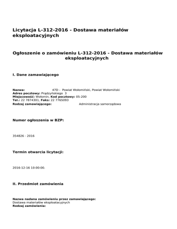 Licytacja L-312-2016 - Dostawa materiałów eksploatacyjnych Ogłoszenie o zamówieniu L-312-2016 - Dostawa materiałów eksploatacyjnych I. Dane zamawiającego Nazwa: 47D - Powiat Wołomiński, Powiat Wołomiński Adres pocztowy: Prądzyńskiego 3 Miejscowość: Wołomin, Kod pocztowy: 05-200 Tel.: 22 7874301, Faks: 22 7765093 Rodzaj zamawiającego: Administracja samorządowa Numer ogłoszenia w BZP: 354826 - 2016 Termin otwarcia licytacji: 2016-12-16 10:00:00. II. Przedmiot zamówienia Nazwa nadana zamówieniu przez zamawiającego: Dostawa materiałów eksploatacyjnych Rodzaj zamówienia: Dostawy Przed wszczęciem postępowania o udzielenie zamówienia przeprowadzono dialog techniczny: Nie Określenie przedmiotu oraz wielkości lub zakresu zamówienia Dostawa materiałów eksploatacyjnych dla potrzeb Starostwa Powiatowego w Wołominie oraz bezpłatny odbiór zużytych materiałów eksploatacyjnych do drukarek laserowych i atramentowych Wspólny słownik zamówień Główny przedmiot Dodatkowe przedmioty Słownik główny 30.12.43.00-7 30.12.51.10-5 30.19.23.00-0 30.19.23.00-4 Czas trwania zamówienia lub termin wykonania: data zakończenia: 31/12/2017 III. Informacje o charakterze prawnym, ekonomicznym, finansowym i technicznym Przewiduje się udzielenie zaliczek na poczet wykonania zamówienia Nie Warunki udziału w postępowaniu oraz opis sposobu dokonywania oceny spełniania tych warunków Informacja o oświadczeniach lub dokumentach, jakie mają dostarczyć wykonawcy w celu potwierdzenia spełniania warunków udziału w postępowaniu oraz niepodlegania wykluczeniu na podstawie art. 24 ust. 1 ustawy Ogranicza się możliwość ubiegania się o zamówienie publiczne tylko dla wykonawców, u których ponad 50 % pracowników stanowią osoby niepełnosprawne Nie IV. Procedura Jedynym kryterium oceny ofert jest najniższa cena Zmiana umowy Przewiduje się istotne zmiany postanowień zawartej umowy w stosunku do treści oferty, na podstawie której dokonano wyboru wykonawcy Nie Termin związania ofertą 30 dni Adres strony internetowej, na której jest dostępny opis przedmiotu zamówienia w licytacji elektronicznej www.powiat-wolominski.pl Wymagania dotyczące rejestracji i identyfikacji wykonawców, w tym wymagania techniczne urządzeń informatycznych Komputer PC z systemem operacyjnym Windows/Linux oraz przeglądarka internetowa Internet Explorer 6.0 lub wyższa lub Firefox 2.0 lub wyższa. Wykonawcy chcący wziąć udział w przedmiotowej licytacji są obowiązani do dokonania uprzedniej rejestracji na platformie licytacji elektronicznych UZP (jeżeli nie są jeszcze zarejestrowanymi użytkownikami) oraz do przesłania swojego LOGINU zamawiającemu wraz z wnioskiem o dopuszczenie do udziału w licytacji elektronicznej. Sposób postępowania w toku licytacji elektronicznej W toku licytacji elektronicznej wykonawcy składają kolejne korzystniejsze postąpienia. Możliwość złożenia postąpienia istnieje od otwarcia licytacji do jej zamknięcia. Podkreślenia wymaga, że system nie przyjmie postąpienia, którego wysokość jest mniejsza od minimalnego postąpienia, określonego w ogłoszeniu o zamówieniu. Wysokość postąpienia jest liczona w odniesieniu do najkorzystniejszej oferty złożonej w danej licytacji. Jednocześnie system nie przyjmie postąpienia, jeżeli zaproponowana cena oferty będzie mniej korzystna niż cena oferty najkorzystniejszej. W trakcie licytacji Wykonawca licytuje cenę brutto całości zamówienia. Licytacja rozpoczyna się od ceny wywoławczej 300.000,00 PLN (brutto). Minimalny krok postąpienia (minimalna różnica ceny składanych ofert) wynosi 10.000,00 PLN (brutto). Minimalna wysokość postąpienia 10000.00 PLN Termin składania wniosków o dopuszczenie do udziału w licytacji elektronicznej 2016-12-08 10:00:00 Miejsce składania wniosków o dopuszczenie do licytacji elektronicznej 05-200 Wołomin, ul. Prądzyńskiego 3 pokój nr 4 (kancelaria) Termin otwarcia licytacji elektronicznej 2016-12-16 10:00:00. Termin i warunki zamknięcia licytacji elektronicznej Upływa 2016-12-16 10:10:00. Wymagania dotyczące zabezpieczenia należytego wykonania umowy Nie dotyczy Istotne dla stron postanowienia umowy, które zostaną wprowadzone do treści zawieranej umowy w sprawie zamówienia publicznego Zgodnie z istotnymi postanowieniami umowy zamieszczonymi na stronie internetowej Zamawiającego. Informacje dodatkowe, w tym dotyczące finansowania projektu/programu ze środków Unii Europejskiej Zdolność techniczna lub zawodowa Określenie warunków: Warunek Zamawiający uzna za spełniony jeżeli Wykonawca wykaże, że w okresie ostatnich trzech lat przed upływem składania ofert, a jeżeli okres prowadzenia działalności jest krótszy – w okresie prowadzenia działalności - wykonał min. 2 dostawy na kwotę minimum 50 000,00 zł. każda Zamawiający wymaga od wykonawców wskazania w ofercie lub we wniosku o dopuszczenie do udziału w postępowaniu imion i nazwisk osób wykonujących czynności przy realizacji zamówienia wraz z informacją o kwalifikacjach zawodowych lub doświadczeniu tych osób: nie Zamawiający przewiduje wykluczenie wykonawcy na podstawie art. 24 ust. 5 ustawy Pzp tak Zamawiający przewiduje następujące fakultatywne podstawy wykluczenia: (podstawa wykluczenia określona w art. 24 ust. 5 pkt 1 ustawy Pzp) (podstawa wykluczenia określona w art. 24 ust. 5 pkt 8 ustawy Pzp) WYKAZ OŚWIADCZEŃ SKŁADANYCH PRZEZ WYKONAWCĘ W CELU WSTĘPNEGO POTWIERDZENIA, ŻE NIE PODLEGA ON WYKLUCZENIU ORAZ SPEŁNIA WARUNKI UDZIAŁU W POSTĘPOWANIU ORAZ SPEŁNIA KRYTERIA SELEKCJI Oświadczenie o niepodleganiu wykluczeniu oraz spełnianiu warunków udziału w postępowaniu tak Oświadczenie o spełnianiu kryteriów selekcji tak III.4) WYKAZ OŚWIADCZEŃ LUB DOKUMENTÓW , SKŁADANYCH PRZEZ WYKONAWCĘ W POSTĘPOWANIU NA WEZWANIE ZAMAWIAJACEGO W CELU POTWIERDZENIA OKOLICZNOŚCI, O KTÓRYCH MOWA W ART. 25 UST. 1 PKT 3 USTAWY PZP: - odpis z właściwego re