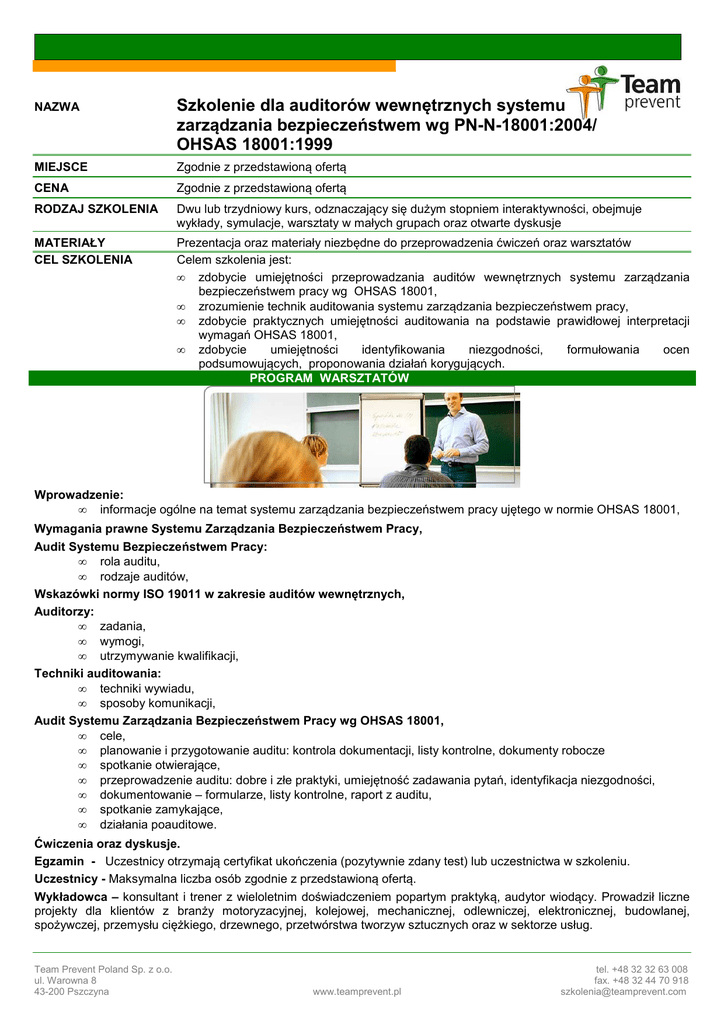 Szkolenie dla auditorow wewnetrznych SZB 18001 OHSAS 18001