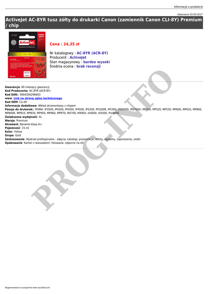 Informacje o produkcie Utworzono 03-03-2017 ActiveJet AC-8YR tusz żółty do drukarki Canon (zamiennik Canon CLI-8Y) Premium / chip Cena : 24,35 zł FO Nr katalogowy : AC-8YR (ACR-8Y) Producent : ActiveJet Stan magazynowy : bardzo wysoki Średnia ocena : brak recenzji PR O G -I N Gwarancja: 60 miesięcy gwarancji Kod Producenta: AC-8YR (ACR-8Y) Kod EAN:: 5904356296603 www: Link na stronę opisu technicznego Kod OEM: CLI-8Y Informacje dodatkowe: Wkład atramentowy z chipem Pasuje do drukarek:: PIXMA: IP3500, IP4200, IP4300, IP4500, IP5200, IP5200R, IP5300, IP6600D, IP6700D, MP500, MP520, MP530, MP600, MP610, MP800, MP800R, MP810, MP830, MP950, MP960, MP970, MX700, MX850, IX4000, IX5000, Pro9000 Zwiększona wydajność: XL Wersja: Premium Atrament: Barwnik klasa A+ Pojemność: 15 ml Kolor: Yellow Grupa: Gold Zastosowanie: Wydruki profesjonalne - zdjęcia, katalogi, prezentacje, oferty, dyplomy, zaproszenia, ulotki Opakowanie: Karton z wieszakiem, foliowane, odporne na UV Wygenerowano w programie www.oscGold.com