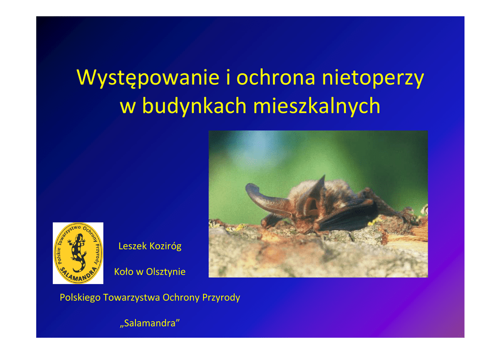 Występowanie i ochrona nietoperzy w budynkach mieszkalnych Leszek Koziróg Koło w Olsztynie Polskiego Towarzystwa Ochrony Przyrody „Salamandra” Prezentację przygotowano z wykorzystaniem materiałów z opracowania: Rok nietoperza, czyli na co nietoperzowi budynek Wiosna/Lato – czas kolonii rozrodczych Lato/Jesień – gody, czas na amory Zima – hibernacja, czas na sen Gdzie mieszka nietoperz? • szczeliny między płytami po ubytku fugi zabezpieczającej; • szczeliny na łączeniach czterech płyt; • przestrzenie pod parapetami; • szczeliny przy framugach okien i pod balkonami; Gdzie mieszka nietoperz? c.d. • przestrzenie pod blachą na stropodachu, zabezpieczającą ściany zewnętrzne przed zaciekaniem (tzw. drempel); • otwory wywietrzników; • pustki w stropodachach; • przestrzenie za drewnianymi (lub wykonanymi z innych materiałów) obiciami ścian Nietoperze – gatunki specjalnej troski: Mroczek posrebrzany Karliki Mroczek późny Borowiec wielki Skutki prac remontowych • redukcja kosztów ogrzewania • oszczędność energii • zamurowywanie żywych zwierząt • utrata miejsc lęgowych ptaków i rozrodu nietoperzy Można pogodzić prace remontowe z ochroną ptaków i nietoperzy Co należy robić? • zabezpieczanie ostoi i stanowisk przed zagrożeniami zewnętrznymi • wykonywanie zabiegów utrzymujących właściwy stan siedlisk zwierząt, poprzez ich odtwarzanie, budowanie sztucznych miejsc rozrodu, • dostosowywaniu terminów i sposobów wykonywania prac budowlanych, remontowych i innych do okresów lęgu, rozrodu lub hibernacji • obserwowanie i dokumentowanie (monitoring) Kolejność postępowania • planowanie inwestycji z uwzględnieniem działań związanych z ochroną nietoperzy • obserwacje i inspekcje miejsc występowania – czerwiec/lipiec • zabezpieczenie miejsc występowania – sierpień/wrzesień • przystąpienie do inwestycji – ocieplenie i działania ochronne Schronienia zastępcze – zasady ogólne • właściwa rekompensata utraty schronień – uwzględnienie budynków niezasiedlonych przez nietoperze • materiał: drewno (odpowiednia impregnacja), trocinobeton • montaż w warstwie ociepliny lub na powierzchni (kontrola i wymiana skrzynek uszkodzonych, montaż w miejscach nie zagrażających przechodniom) Schronienia zastępcze – zasady ogólne cd. • zawieszenie na odpowiedniej wysokości • parametry termiczne skrzynek • solidny montaż – metalowe uchwyty lub kołki rozporowe • nadzór chiropterologa – sposób montażu i schematy rozmieszczeń • rozwiązania alternatywne Schemat budowy schronu dla nietoperzy Schemat rozmieszczenia schronów Jak to wygląda? Panel dostępowy Skrzynka dla jaskółek i nietoperzy Wpływ remontów – aspekty prawne (ochrona zwierząt, miejsc występowania, sankcje karne, obowiązek rekompensaty strat) Ustawa z dnia 21 sierpnia 1997 r. o ochronie zwierząt. Rozporządzenie Ministra Środowiska z dnia 28 września 2004 r. w sprawie gatunków dziko występujących zwierząt objętych ochroną. Ustawa z dnia 16 kwietnia 2004 r. o ochronie przyrody Ustawa z dnia 13 kwietnia 2007 r. o zapobieganiu szkodom w środowisku i ich naprawie. Ustawa z dnia 27 kwietnia 2001 r. Prawo ochrony środowiska. Gdzie uzyskać pomoc? Polskie Towarzystwo Ochrony Przyrody „Salamandra” ul. Szamarzewskiego 11/6, 60-514 Poznań www.salamandra.org.pl, [email protected] tel./fax: 061 662 86 06 Polskie Towarzystwo Przyjaciół Przyrody „pro Natura” ul. Podwale 75; 50-449 Wrocław www.eko.org.pl/pronatura, [email protected] tel./fax: 071 343 09 58