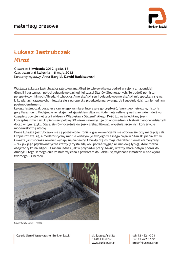 Łukasz Jastrubczak Miraż Otwarcie: 5 kwietnia 2012, godz. 18 Czas trwania: 6 kwietnia – 6 maja 2012 Kuratorzy wystawy: Anna Bargiel, Dawid Radziszewski Wystawa Łukasza Jastrubczaka zatytułowana Miraż to wielowątkowa podróż w rejony amazońskiej dżungli i pustynnych połaci południowo-zachodniej części Stanów Zjednoczonych. To podróż po historii perspektywy i filmach Alfreda Hitchcocka. Amerykański sen i południowoamerykański mit spotykają się na kilku planach czasowych, mieszają się z europejską przedwojenną awangardą i zupełnie dziś już niemodnym postmodernizmem. Łukasz Jastrubczak poszukuje czwartego wymiaru. Interesuje go prędkość, figury geometryczne, historia góry Paramount. Podejmuje refleksję nad zjawiskiem déjà vu. Podejmuje refleksję nad zjawiskiem déjà vu. Czerpie z powojennej teorii widzenia Władysława Strzemińskiego. Dość już wyświechtany język konceptualizmu i sztuki pierwszej połowy XX wieku wykorzystuje do opowiedzenia historii nieopowiedzianych dotąd w tym języku. Stara się równocześnie ów język zrehabilitować, wypełnia szczeliny i konserwuje modernistyczną utopię. Prace Łukasza Jastrubczaka nie są pozbawione ironii, a gra konwencjami nie odbywa się przy milczącej sali. Utopie rozłażą się, a modernistyczny mit nie wytrzymuje swojego własnego ciężaru. Stan skupienia sztuki Łukasza Jastrubczaka również wydaję się niepewny. Obiekty często mają charakter niemal efemeryczny – tak jak jego psychokinetyczne rzeźby (artysta siłą woli potrafi wygiąć aluminiową łyżkę), które można obejrzeć tylko na zdjęciu. Czasem jednak, jak w przypadku pracy Kowboj (rzeźby, która odbyła podróż do Ameryki i tego samego dnia została wysłana z powrotem do Polski), są wykonane z materiału nad wyraz twardego – z betonu. Śpiący kowboj, 2011, rzeźba Upadek, 2012, found footage (3 s, sekwencja z filmu Vertigo Alfreda Hitchcocka) Ruch numer 4, 2011, fotografia Zestawienie prac na wystawie nie posiada wyraźnego klucza (choć klucz jest, ale mniej zobowiązujący), publiczność dowolnie może tworzyć połączenia pomiędzy pracami, a nawet dodawać do interpretacji własne przeżycia i refleksje. Wystawa Miraż podsumowuje wątki, które artysta podjął w trakcie realizacji zeszłorocznej wystawy w Galerii Sabot w Klużu-Napoce, w projekcie Tarnów. 1000 lat nowoczesności oraz podczas pobytu rezydencyjnego w Stanach Zjednoczonych. Łukasz Jastrubczak urodził się w 1984 roku w Zielonej Górze. Tworzy prace wideo, instalacje, rysunki, efemeryczne obiekty i zdarzenia. Posługuje się strategiami artystów sztuki konceptualnej, nadając im melancholijną poetykę. Wraz z Krzysztofem Kaczmarkiem tworzy grupę Krzysztofjastrubczakłukaszkaczmarek. Swoje wystawy indywidualne prezentował między innymi w Art in General w Nowym Jorku, Centrum Sztuki Współczesnej Kronika w Bytomiu, BWA w Zielonej Górze czy Galerii Sabot w Klużu-Napoce. Współpracuje z Galerią Pies z Poznania. http://bunkier.art.pl/?wystawy=gert-weigelt-absolutnie-pina Klatki, 2011, projekcja slajdów Złota perspektywa, 2011, relief Wydarzenia towarzyszące wystawie: 14.04.2012 (sobota), godz. 16 Oprowadzanie otwarte Po wystawie Miraż oprowadzi Małgorzata Jędrzejczyk. 17.04.2012 (wtorek), godz. 18 Miraże i klisze filmowe W Zawrocie głowy zagadkowa Kim Novak jako Madeleine/ Judy wiedzie zarówno widzów, jak i samą fabułę filmu na manowce, znacząc fałszywy trop niezbadanej tajemnicy kobiecej seksualności i tożsamości. Filmowe opowiadanie podąża śladami Madeleine, prowadząc nas do muzeum, a następnie, w poszukiwaniu odpowiedzi, do zatopionego w książkach historyka sztuki. (…) Jest to znów fałszywy trop, oszustwo. Patricia Mellencamp W Klatkach Łukasz Jastrubczak wprowadza widzów w Zawrót głowy Alfreda Hitchcocka. Podążając tropem wykonanych przez artystę zdjęć „naśladujących” kadry z tej części filmu, w której główny bohater – Scottie – śledzi Madeleine/Judy, widzowie doprowadzeni zostają do galerii sztuki. Wygłaszany przez Ewę Opałkę wykład będzie próbą kolejnej rekonstrukcji palimpsestycznego układu zależności pomiędzy praktyką artystyczną, w której historia i teoria filmu stają się narzędziem badań immanentnych dla sztuk wizualnych problemów percepcji i ontologii reprezentacji a badaniem specyfiki konkretnych obrazów filmowych, ich penetracji przez obecność i gest artysty. 21.04.2012 (sobota), Dzień Otwarty godz. 11 // S.Z.T.U.K.A. czyli Szalenie Zajmujące Twory Utalentowanych i Krnąbrnych Artystów Warsztaty z Sebastianem Cichockim. Mali Klubowicze będą mieli okazję poznać jednego z najbardziej cenionych kuratorów sztuki współczesnej w Polsce. Pretekstem do spotkania będzie najnowsza książka Cichockiego o sztuce współczesnej, która została napisana specjalnie dla najmłodszych odbiorców. Warsztaty zorganizowane w nawiązaniu do trwającej w Bunkrze Sztuki wystawy Łukasza Jastrubczaka, zatytułowanej Miraż. W ramach Małego Klubu Bunkra Sztuki godz. 15 // Cliché. Oprowadzanie kuratorskie Po wystawie oprowadzą: artysta, kuratorzy i Ewa Opałka Oprowadzanie będzie powtórzeniem scenariusza zwodzenia i śledzenia centralnego dla fabuły Zawrotu głowy. W wystawę wprowadzi widzów postać Madeleine/Judy, tworząc rodzaj performatywnego, „fałszywego” przewodnika po wystawie, posługując się kliszami filmowymi i psychoanalizą. godz. 17 // Potyczka Sebastian Cichocki i Łukasz Jastrubczak zaprezentują książkę Miraż, nad którą obecnie pracują. W ramach projektu Miraż powstaje publikacja pod tym samym tytułem. Książka artystyczna jest konceptualną powieścią podróżniczą po USA, składającą się z obrazów i tekstów powstałych w wyniku swoistego pojedynku na słowo (Sebastian Cichocki) i obraz (Łukasz Jastrubczak). Kiedy artysta odbywał rzeczywistą podróż w przestrzeni, autor tekstu odbywał równolegle wyimag