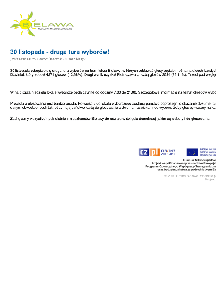 30 listopada - druga tura wyborów! , 28/11/2014 07:50, autor: Rzecznik - Łukasz Masyk 30 listopada odbędzie się druga tura wyborów na burmistrza Bielawy, w których oddawać głosy będzie można na dwóch kandyda Dźwiniel, który zdobył 4271 głosów (43,68%). Drugi wynik uzyskał Piotr Łyżwa z liczbą głosów 3534 (36,14%). Trzeci pod względ W najbliższą niedzielę lokale wyborcze będą czynne od godziny 7.00 do 21.00. Szczegółowe informacje na temat okręgów wybo Procedura głosowania jest bardzo prosta. Po wejściu do lokalu wyborczego zostaną państwo poproszeni o okazanie dokumentu danym obwodzie. Jeśli tak, otrzymają państwo kartę do głosowania z dwoma nazwiskami do wyboru. Żeby głos był ważny na kar Zachęcamy wszystkich pełnoletnich mieszkańców Bielawy do udziału w święcie demokracji jakim są wybory i do głosowania. © 2010 Gmina Bielawa. Wszelkie pr Projekt: