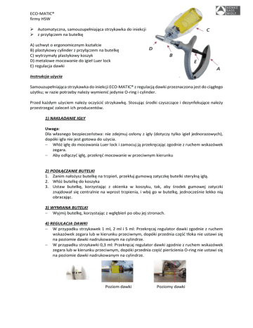 ECO-MATIC® firmy HSW Automatyczna, samouzupełniająca strzykawka do iniekcji z przyłączem na butelkę A) uchwyt o ergonomicznym kształcie B) plastykowy cylinder z przyłączem na butelkę C) wytrzymały plastykowy koszyk D) metalowe mocowanie do igieł Luer lock E) regulacja dawki Instrukcja użycia Samouzupełniająca strzykawka do iniekcji ECO-MATIC® z regulacją dawki przeznaczona jest do ciągłego użytku; w razie potrzeby należy wymienić jedynie O-ring i cylinder. Przed każdym użyciem należy oczyścić strzykawkę. Stosując środki czyszczące i dezynfekujące należy przestrzegać zaleceń ich producentów. 1) NAKŁADANIE IGŁY Uwaga: Dla własnego bezpieczeństwa: nie zdejmuj osłony z igły (dotyczy tylko igieł jednorazowych), dopóki igła nie jest gotowa do użycia. − Włóż igłę do mocowania Luer lock i zamocuj ją przekręcając zgodnie z ruchem wskazówek zegara. − Aby odłączyć igłę, przekręć mocowanie w przeciwnym kierunku 2) PODŁĄCZANIE BUTELKI 1. Zanim nałożysz butelkę na trzpień, przekłuj gumową zatyczkę butelki sterylną igłą. 2. Włóż butelkę do koszyka 3. Ustaw butelkę, korzystając z okienka w koszyku, tak, aby środek gumowej zatyczki znajdował się centralnie na wprost trzpienia, i wbij go w butelkę, jednocześnie lekko nią obracając. 3) WYMIANA BUTELKI − Wyjmij butelkę, korzystając z wgłębień po obu jej stronach. 4) REGULACJA DAWKI − W przypadku strzykawek 1 ml, 2 ml i 5 ml: Przekręcaj regulator dawki zgodnie z ruchem wskazówek zegara lub w kierunku przeciwnym, dopóki przednia część tłoka nie ustawi się na poziomie dawki nadrukowanym na cylindrze. − W przypadku strzykawki 0,3 ml: Przekręcaj regulator dawki zgodnie z ruchem wskazówek zegara lub w kierunku przeciwnym, dopóki przednia część pierścienia O-ring nie ustawi się na poziomie dawki nadrukowanym na cylindrze. Poziom dawki Poziomy dawki 5) NAPEŁNIANIE ECO-MATIC® 1. Zdejmij osłonę z igły. 2. Trzymaj ECO-MATIC® lekko nachylony, uważając, aby trzpień znajdował się poniżej poziomu płynu w celu uniknięcia zassania powietrza do cylindra. 3. Ściśnij regulowany uchwyt i następnie puść go szybko, aby strzykawka naciągnęła płyn do cylindra. 4. Aby usunąć pęcherzyki powietrza w cylindrze, powtarzaj krok (c). 5. Aby napełnić strzykawkę i przygotować się do iniekcji, upewnij się, że strzykawka jest ustawiona na poziom 0,3 ml (w przypadku strzykawki 0,3 ml) lub 0,5 ml (w przypadku strzykawki 1 ml), aby przygotować ją do pierwszego użycia, i że nie widać w niej żadnych pęcherzyków powietrza. Ustaw strzykawkę pionowo do góry i naciśnij tłok, aby wypchnąć pęcherzyki powietrza. Od tego momentu możesz ustawić dowolną dawkę. Wgłębienia – uchwyty Trzpień Okienko Stosowanie z gwintowanym adapterem do butelek gwintowanych: Przytrzymaj HSW ECO-MATIC® końcówką ssącą do dołu, i nakręć butelkę gwintowaną na adapter. dalej postępuj, jak opisano w kroku 5.2 Butelkę odłącza się wykonując powyższe czynności w odwrotnej kolejności. CZYNNOŚCI PO UŻYCIU ECO-MATIC® Usuń ze strzykawki wszelkie pozostałości materiału przepłukując ją dokładnie gorącą wodą z mieszaniną detergentu. Wypłucz starannie czystą, ciepłą wodą. Uwaga! Jeżeli zaobserwujesz, że po opisanym wyżej czyszczeniu strzykawka zaciąga powietrze, możliwe jest, że zawór z przodu metalowego zacisku jest zamknięty. Zawór ten można zwolnić stukając lekko przednią częścią strzykawki w np. krawędź stołu, i następnie przepłukując strzykawkę ciepłą wodą. DEZYNFEKCJA Przed każdym użyciem i po nim zaleca się zdezynfekowanie ECO-MATIC® oraz zapasu igieł i dysz. 1. Napełnij cylinder "gorącą" wodą, zasysając ją przy pomocy przyłączonej butelki z ciepłą wodą. 2. Zanurz całe urządzenie ECO-MATIC®, łącznie z igłami lub dyszami, w pojemniku z wodą, doprowadź wodę do wrzenia i wygotowuj przez czas do 20 minut. Najlepiej, jeżeli cylinder zostanie odłączony od uchwytu, a strzykawka będzie wygotowywana w stanie rozmontowanym. 3. Wyjmij ECO-MATIC® z pojemnika, owiń uchwyt ściereczką i naciskaj do całkowitego osuszenia. SMAROWANIE Odłącz plastykowy cylinder od uchwytu, przekręcając go. Nasmaruj tłok i szklany cylinder 100% czystym olejem tłoczonym na zimno lub równoważnym olejem roślinnym. Przestrzegaj instrukcji producenta dotyczących trwałości i okresu przechowywania. Nie stosuj olejów mineralnych, silikonu, WD-40, gliceryny ani alkoholu. Produkty ropopochodne mogą powodować stwardnienie tłoka, skracając jego okres przydatności do użycia.