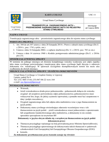 KARTA USŁUGI USC-11 Urząd Stanu Cywilnego Urząd Gminy w Lipowej TRANSKRYPCJA ZAGRANICZNEGO AKTU – PRZENIESIENIE ZAGRANICZNEGO AKTU DO REJESTRU STANU CYWILNEGO obowiązuje od 1 marca 2015r NAZWA USŁUGI Transkrypcja zagranicznego aktu – przeniesienie zagranicznego aktu do rejestru stanu cywilnego PODSTAWA PRAWNA 1. Art. 104 do art.107 ustawy z dnia 28 listopada 2014 r. Prawo o aktach stanu cywilnego (Dz.U. z 2014 r., poz. 1741,z późn. zm.) 2. Ustawa z dnia 16 listopada 2006 r. o opłacie skarbowej (Dz. U. z 2015r. poz. 783 ze zm.) 3. Ustawa z dnia 14 czerwca 1960 r.-Kodeks postępowania administracyjnego (Dz.U. z 2016r. poz.23). SPOSÓB ZAŁATWIENIA SPRAWY W terminie do jednego miesiąca od złożenia kompletnego wniosku wydawany jest odpis zupełny aktu stanu cywilnego potwierdzający transkrypcję aktu stanu cywilnego bądź decyzja o odmowie dokonania ww. transkrypcji. W sprawach szczególnie skomplikowanych termin ten może ulec wydłużeniu do dwóch miesięcy. MIEJSCE ZAŁATWIENIA SPRAWY / ZŁOŻENIA DOKUMENTÓW Urząd Stanu Cywilnego w Urzędzie Gminy w Lipowej I piętro, pokój Nr 8 Tel. (33) 860-15-64, (33) 867-06-22 wew.164 e-mail: [email protected] WYMAGANE DOKUMENTY Wniosek; Jeżeli wnioskodawca działa przez pełnomocnika - pełnomocnik dołącza do wniosku oryginał ub urzędowo potwierdzony odpis pełnomocnictwa; pełnomocnictwo musi wskazywać kto, kogo, do jakiej czynności upoważnia, a ponadto musi być zaopatrzone w datę i podpis mocodawcy; Oryginał zagranicznego aktu lub odpisu aktu małżeństwa wraz z jego tłumaczeniem na język polski; Dokumenty stanu cywilnego stwierdzające zdarzenie wcześniejsze wraz z ich tłumaczeniem na język polski - jeżeli wnioskodawca wnosi jednocześnie o sprostowanie lub uzupełnienie transkrybowanego aktu małżeństwa, a dokumenty te nie zostały uprzednio sporządzone na terytorium RP. Dokumenty w języku obcym składa się z urzędowym tłumaczeniem na język polski dokonanym przez: Tłumacza przysięgłego wpisanego na listę prowadzoną przez Ministra Sprawiedliwości, Tłumacza przysięgłego uprawnionego do dokonywania takich tłumaczeń w państwach członkowskich Unii Europejskiej lub Europejskiego Obszaru Gospodarczego (EOG) konsula. Za dokumenty przetłumaczone przez konsula uznaje się również: Dokumenty w języku obcym przetłumaczone na język polski przez tłumacza w państwie przyjmującym i poświadczone przez konsula, Dokumenty przetłumaczone z języka rzadko występującego na język znany konsulowi, a następnie przetłumaczone przez konsula na język polski. W przypadku braku tłumacza przysięgłego języka obcego na terytorium RP dokument zagraniczny potwierdzający stan cywilny w języku obcym może zostać przetłumaczony przez konsula lub uprawnionego pracownika przedstawicielstwa dyplomatycznego państwa obcego na terytorium RP. Nie wymagają tłumaczenia odpisy skrócone aktów urodzeń, małżeństw i zgonów na drukach wielojęzycznych wystawione zgodnie z Konwencją nr 16 dotyczącą wydawania wielojęzycznych odpisów skróconych aktów stanu cywilnego, sporządzoną w Wiedniu 8 września 1976r. Dokumenty składane wraz z wnioskiem o transkrypcję zagranicznego aktu małżeństwa nie podlegają zwrotowi. Na wniosek osoby, która przedkłada zagraniczny dokument stanu cywilnego, można wydać ten dokument, po uprzednim sporządzeniu kopii poświadczonej za zgodność z oryginałem przez kierownika urzędu stanu cywilnego, jeżeli wnioskodawca nie ma możliwości ponownego uzyskania tego dokumentu. Osoby przebywające poza granicami RP mogą również skorzystać w sprawie transkrypcji aktu małżeństwa z pośrednictwa konsula RP. We właściwym konsulacie otrzymają wówczas niezbędne informacje oraz uiszczą stosowne opłaty. WNIOSKI DO POBRANIA 1. Wniosek o wpisanie zagranicznego aktu do rejestru stanu cywilnego 2. Pełnomocnictwo OPŁATY 1. Opłata skarbowa za wydanie odpisu zupełnego aktu stanu cywilnego potwierdzającego transkrypcję: 50,00zł. 2. Opłata skarbowa za złożenie dokumentu stwierdzającego udzielenie pełnomocnictwa 17,00 zł (nie dotyczy pełnomocnictw udzielonych małżonkowi, wstępnemu, zstępnemu lub rodzeństwu albo gdy mocodawcą jest podmiot zwolniony od opłaty skarbowej). Opłatę skarbową należy uiścić: - gotówką w kasie Urzędu Gminy w Lipowej lub - bezgotówkowo na rachunek bankowy Urzędu Gminy w Lipowej Bank Spółdzielczy w Żywcu Nr rachunku: 39 8137 0009 0000 2538 2000 0010 3. Termin wniesienia opłaty: najpóźniej w dniu składania wniosku. PRZEWIDYWANY TERMIN ZAŁATWIENIA SPRAWY 1. Bez zbędnej zwłoki. 2. Do jednego miesiąca jeśli konieczne jest przeprowadzenie postępowania wyjaśniającego, a w sprawach skomplikowanych do dwóch miesięcy. OSOBY DO KONTAKTU Iwona Talik (Kierownik USC), tel. (33) 860-15-64, e-mail: [email protected] TRYB ODWOŁAWCZY Tryb odwoławczy występuje tylko w przypadku wydania decyzji o odmowie dokonania transkrypcji. Odwołanie wnosi się do Wojewody Śląskiego w Katowicach , za pośrednictwem Kierownika Urzędu Stanu Cywilnego w terminie 14 dni od dnia jej doręczenia UWAGI 1. Zagraniczny dokument stanu cywilnego, będący dowodem zdarzenia i jego rejestracji, może zostać przeniesiony do rejestru stanu cywilnego w drodze transkrypcji. 2. Transkrypcja polega na wiernym i literalnym przeniesieniu treści zagranicznego dokumentu stanu cywilnego zarówno językowo, jak i formalnie, bez żadnej ingerencji w pisownię imion i nazwisk osób wskazanych w zagranicznym dokumencie stanu cywilnego. 3. Transkrypcji podlega dokument, który w państwie wystawienia jest uznawany za dokument stanu cywilnego i ma moc dokumentu urzędowego, jest wydany przez właściwy organ oraz nie budzi wątpliwości co do autentyczności. 4. Wniosek do wybranego kierownika urzędu stanu cywilnego o dokonanie transkrypcji może złożyć osoba, której dotyczy zdarzenie podlegające transkrypcji, lub inna osoba, która wykaże interes 