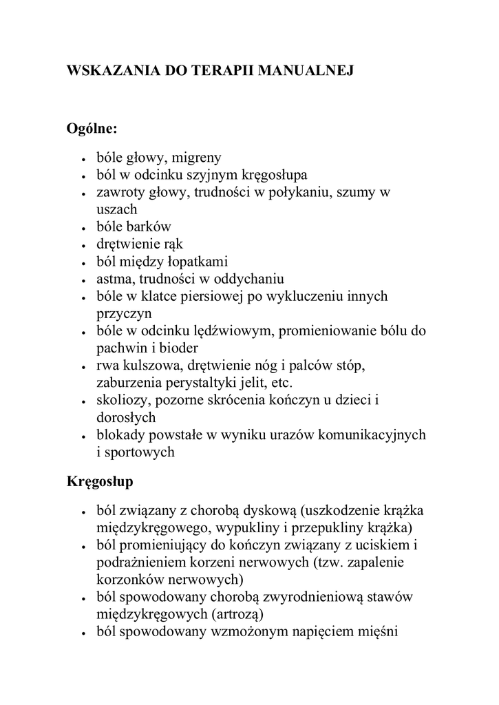 WSKAZANIA DO TERAPII MANUALNEJ Ogólne: bóle głowy, migreny ból w odcinku szyjnym kręgosłupa zawroty głowy, trudności w połykaniu, szumy w uszach bóle barków drętwienie rąk ból między łopatkami astma, trudności w oddychaniu bóle w klatce piersiowej po wykluczeniu innych przyczyn bóle w odcinku lędźwiowym, promieniowanie bólu do pachwin i bioder rwa kulszowa, drętwienie nóg i palców stóp, zaburzenia perystaltyki jelit, etc. skoliozy, pozorne skrócenia kończyn u dzieci i dorosłych blokady powstałe w wyniku urazów komunikacyjnych i sportowych Kręgosłup ból związany z chorobą dyskową (uszkodzenie krążka międzykręgowego, wypukliny i przepukliny krążka) ból promieniujący do kończyn związany z uciskiem i podrażnieniem korzeni nerwowych (tzw. zapalenie korzonków nerwowych) ból spowodowany chorobą zwyrodnieniową stawów międzykręgowych (artrozą) ból spowodowany wzmożonym napięciem mięśni sztywność spowodowana przykurczem lub zablokowaniem stawów międzykręgowych i krzyżowo-biodrowych łagodne położeniowe zawroty głowy BPPV niesymetryczna postawa ciała Kończyny ból spowodowany uszkodzeniem mięśni, ich ścięgien oraz ich przyczepów do kości ból spowodowany chorobą zwyrodnieniową stawów (artrozą) – staw kolanowy, biodrowy, barkowy itp. przygotowanie do planowanych zabiegów operacyjnych np. wymiany stawów (endoprotezy) oraz usprawnianie po wykonanej operacji stany pourazowe i po zabiegach ortopedycznych w obrębie kości, stawów, więzadeł, mięśni sztywność stawów – z powodu unieruchomienia (gips), zwyrodnienia skrócenie lub zwiększone napięcie mięśni, które zmieniają postawę ciała i przeciążają inne tkanki PRZECIWWSKAZANIA DO LECZENIA MANUALNEGO Ogólne: ból nie do zniesienia – brak możliwości zbadania zaawansowana osteoporoza – samoistne złamania kości problemy z krzepliwością krwi (leczenie antykoagulantami) problemy skórne brak współpracy ze strony pacjenta poważne zaburzenia internistyczne Miejscowe: ból związany z nowotworem ból związany z procesem zapalnym w fazie ostrej urazy, złamania i zwichnięcia w okresie unieruchomienia niestabilność torebkowo-więzadłowa anomalie i patologiczne zmiany naczyniowe powodujące objawy niewydolności kręgowo-podstawnej (niedrożność lub rozwarstwienie tętnic szyjnych, niewydolność tętnic kręgowych, zator) niestabilność więzadłowa w obrębie kręgosłupa szyjnego górnego w przypadku chorób reumatycznych objawy kompresji rdzenia kręgowego i zespół ogona końskiego - objawy oponowe - porażenia spastyczne, chód ataktyczny - zaburzenia w pracy mięśni zwieraczy - mielopatia szybko postępujące porażenia mięśni np. opadająca stopa ciąża po 6 miesiącu POWIKŁANIA PO TERAPII MANUALNEJ Przestrzegając wskazań i przeciwskazań zasadniczo brak powikłań po terapii manualnej. W przypadku manualnych technik leczenia czasem może się pojawić: Nasilenie bólu z uszkodzonej już tkanki z powodu zbyt wcześnie podjętej terapii Zwiększona tkliwość tkanek, poprzez które wywierany był lub nacisk lub ciąg podczas uruchamiania stawów Okresowe zawroty głowy i nudności w przypadku nierozpoznanej wcześniej niewydolności kręgowopodstawnej