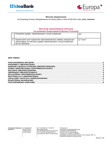 Warunki ubezpieczenia do Grupowej Umowy Ubezpieczenia od Utraty Zysku z dnia 23.05.2014 roku (dalej: Umowa) Skorowidz najważniejszych informacji (na podstawie Rozporządzenia Ministra Finansów) 1 Przesłanki wypłaty odszkodowania i innych świadczeń §9 2 Ograniczenia oraz wyłączenia odpowiedzialności zakładu ubezpieczeń uprawniające do odmowy wypłaty odszkodowania i innych świadczeń lub ich obniżenia § 11ust.7 SPIS TREŚCI POSTANOWIENIA WSTĘPNE ....................................................................................................................................2 PRZEDMIOT UBEZPIECZENIA...................................................................................................................................3 WARUNKI OBJĘCIA OCHRONĄ UBEZPIECZENIOWĄ ...........................................................................................3 OKRES UBEZPIECZENIA (ODPOWIEDZIALNOŚCI) ................................................................................................3 SKŁADKA UBEZPIECZENIOWA ................................................................................................................................4 OBOWIĄZKI UBEZPIECZONEGO ..............................................................................................................................4 WYŁĄCZENIA ODPOWIEDZIALNOŚCI .....................................................................................................................5 REZYGNACJA Z UBEZPIECZENIA ............................................................................................................................5 USTALANIE I WYPŁATA ODSZKODOWANIA ..........................................................................................................5 ROSZCZENIA REGRESOWE......................................................................................................................................7 POSTANOWIENIA KOŃCOWE ...................................................................................................................................8 Towarzystwo Ubezpieczeń Europa S.A. ul. Gwiaździsta 62 53-413 Wrocław [email protected] www.tueuropa.pl tel. 71 36 92 887, fax 71 36 92 707 Biuro Obsługi Klienta 801 500 300 (dla telefonów stacjonarnych) lub 71 36 92 887 (dla telefonów kom.) koszt połączenia zgodny z taryfą operatora TU Europa S.A. Sąd Rejonowy dla Wrocławia-Fabrycznej we Wrocławiu, KRS 0000002736 NIP 895-10-07-276,kapitał zakładowy zarejestrowany i opłacony 37 800 000 zł posiadającym zezwolenie Ministra Finansów z dnia 7 listopada 1994 r. na prowadzenie działalności ubezpieczeniowej Strona 1 z 8 Postanowienia wstępne §1 1. Niniejsze Warunki ubezpieczenia regulują zasady udzielania przez TU Europa S.A. ochrony ubezpieczeniowej Klientom Idea Banku S.A., w zakresie utraty spodziewanego Zysku Brutto, jaki osiągnąłby Ubezpieczony gdyby jego działalność nie została przerwana lub zakłócona na skutek wystąpienia Szkody w Mieniu oraz Zwiększonych Kosztów Działalności, na skutek wystąpienia Szkody w Mieniu. 2. Wykorzystane w Warunkach Ubezpieczenia określenia oznaczają odpowiednio: 1. Deklaracja Zgody – oświadczenie woli Klienta Idea Banku S.A., mocą którego wyraża on zgodę na objęcie ochroną ubezpieczeniową, złożone w formie zapewniającej jednoznaczną identyfikację osoby składającej to oświadczenie oraz oznaczenie dnia złożenia oświadczenia. 2. Strata – uszczerbek majątkowy polegający na osiągnięciu niższego niż spodziewany Zysk Brutto lub też konieczność ponoszenia Zwiększonych Kosztów Działalności przez Ubezpieczonego w Okresie Odszkodowawczym, będący bezpośrednim następstwem powstania Szkody w Mieniu. Wysokość Straty jest ustalana po zakończeniu Okresu Odszkodowawczego. 3. Ubezpieczający– Idea Bank S.A. z siedzibą w Warszawie,. 4. Ubezpieczony – Klient Idea Banku S.A. objęty ochroną ubezpieczeniowa na warunkach określonych w Warunkach Ubezpieczenia. 5. Ubezpieczyciel - Towarzystwo Ubezpieczeń Europa Spółka Akcyjna z siedzibą we Wrocławiu, 6. Suma Ubezpieczenia – to zadeklarowana przez Ubezpieczonego kwota spodziewanego Zysku Brutto jaki byłby osiągnięty przez Ubezpieczonego w Okresie Odszkodowawczym, oraz Zwiększonych Kosztów Działalności, jakie poniósłby Ubezpieczony w tym okresie w celu uniknięcia lub zminimalizowania spadku obrotu, który w przeciwnym razie nastąpiłby w Okresie Odszkodowawczym. Suma Ubezpieczenia zostaje wskazana przez Ubezpieczonego w Deklaracji Zgody w złotych polskich, jednak nie więcej niż 500.000 zł i stanowi górną granicę odpowiedzialności Ubezpieczyciela. Suma Ubezpieczenia ulega zmniejszeniu o kwotę wypłaconego odszkodowania w Okresie Ubezpieczenia. 7. Zdarzenie Ubezpieczeniowe – wystąpienie w Okresie Ubezpieczenia Straty u Ubezpieczonego w następstwie Szkody w Mieniu, stwierdzonej w drodze: a) decyzji o wypłacie odszkodowania z umowy ubezpieczenia, o której mowa w § 1 ust. 2, lub b) ugody zawartej pomiędzy Ubezpieczonym a zakładem ubezpieczeń, z którym Klient zawarł umowę ubezpieczenia, na podstawie której przyznano Ubezpieczonemu prawo do odszkodowania z umowy ubezpieczenia, o której mowa w § 1 ust. 2, lub c) prawomocnego orzeczenia sądu lub też na podstawie innego dokumentu przyznającego Ubezpieczonemu prawo do odszkodowania z umowy ubezpieczenia, o której mowa w § 1 ust. 2. 8. Zysk Brutto - kwota stanowiąca różnicę pomiędzy wartością Obrotu Standardowego a Zmiennymi Kosztami Wytwarzania, powiększona o różnicę pomiędzy wartością stanu zapasów (przez które rozumie się wyroby gotowe oraz produkcję w toku) na koniec, a wartością stanu zapasów na początek roku obrachunkowego. Wartość stanu zapasów uzyskuje się na podstawie zapisów księgowych prowadzonych przez Ubezpieczonego lub firmę księgową prowadzącą jego księgi rachunkowe, po jej wycenie zgodnie z ustawą o rachun