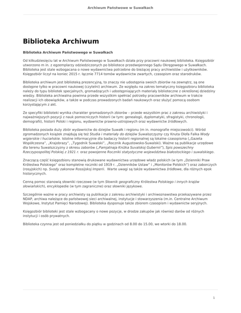 Archiwum Państwowe w Suwałkach Biblioteka Archiwum Biblioteka Archiwum Państwowego w Suwałkach Od kilkudziesięciu lat w Archiwum Państwowego w Suwałkach działa przy pracowni naukowej biblioteka. Księgozbiór utworzono m in. z egzemplarzy odziedziczonych po bibliotece przedwojennego Sądu Okręgowego w Suwałkach. Biblioteka jest stale wzbogacana o nowe wydawnictwa potrzebne do bieżącej pracy archiwistów i użytkowników. Księgozbiór liczył na koniec 2015 r. łącznie 7714 tomów wydawnictw zwartych, czasopism oraz starodruków. Biblioteka archiwum jest biblioteką prezencyjną, to znaczy nie udostępnia swoich zbiorów na zewnątrz, są one dostępne tylko w pracowni naukowej (czytelni) archiwum. Ze względu na zakres tematyczny księgozbioru biblioteka należy do typu bibliotek specjalnych, gromadzących i udostępniających materiały biblioteczne z określonej dziedziny wiedzy. Biblioteka archiwalna powinna przede wszystkim spełniać potrzeby pracowników archiwum w trakcie realizacji ich obowiązków, a także w podczas prowadzonych badań naukowych oraz służyć pomocą osobom korzystającym z akt. Ze specyfiki biblioteki wynika charakter gromadzonych zbiorów – przede wszystkim prac z zakresu archiwistyki i najważniejszych pozycji z nauk pomocniczych historii (w tym: genealogii, dyplomatyki, sfragistyki, chronologii, demografii), historii Polski i regionu, wydawnictw prawno-ustrojowych oraz wydawnictw źródłowych. Biblioteka posiada duży zbiór wydawnictw do dziejów Suwałk i regionu (m in. monografie miejscowości). Wśród zgromadzonych książek znajdują się też Studia i materiały do dziejów Suwalszczyzny czy Knuta Olofa Falka Wody wigierskie i huciańskie. Istotne informacyjnie dla badaczy historii regionalnej są lokalne czasopisma („Gazeta Współczesna”, „Krajobrazy”, „Tygodnik Suwalski”, „Rocznik Augustowsko-Suwalski). Ważne są publikacje urzędowe dla terenu Suwalszczyzny z okresu zaborów („Pamjatnaja Kniżka Suvalskoj Gubernii”), Spis powszechny Rzeczypospolitej Polskiej z 1921 r. oraz powojenne Roczniki statystyczne województwa białostockiego i suwalskiego. Znaczącą część księgozbioru stanowią drukowane wydawnictwa urzędowe władz polskich (w tym „Dzienniki Praw Królestwa Polskiego” oraz kompletne roczniki od 1919 r. „Dzienników Ustaw” i „Monitorów Polskich”) oraz zaborczych (rosyjskich) np. Svody zakonow Rossijskoj Imperii. Warte uwagi są także wydawnictwa źródłowe, dla różnych epok historycznych. Cenną pomoc stanowią słowniki rzeczowe (w tym Słownik geograficzny Królestwa Polskiego i innych krajów słowiańskich), encyklopedie (w tym zagraniczne) oraz słowniki językowe. Szczególnie ważne w pracy archiwisty są publikacje z zakresu archiwistyki i archiwoznawstwa przekazywane przez NDAP, archiwa należące do państwowej sieci archiwalnej, instytucje i stowarzyszenia (m.in. Centralne Archiwum Wojskowe, Instytut Pamięci Narodowej). Biblioteka dysponuje także zbiorem czasopism i wydawnictw seryjnych. Księgozbiór biblioteki jest stale wzbogacany o nowe pozycje, w drodze zakupów jak również darów od różnych instytucji i osób prywatnych. Biblioteka czynna jest od poniedziałku do piątku w godzinach od 8.00 do 15.00, we wtorki do 18.00. 1