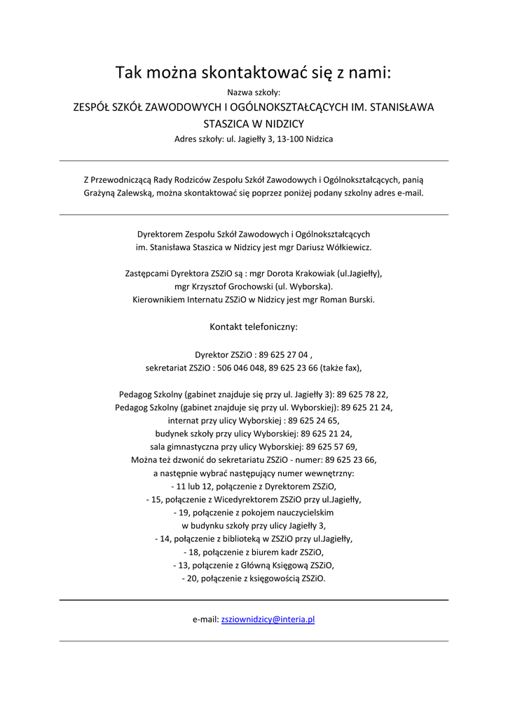 Tak można skontaktować się z nami: Nazwa szkoły: ZESPÓŁ SZKÓŁ ZAWODOWYCH I OGÓLNOKSZTAŁCĄCYCH IM. STANISŁAWA STASZICA W NIDZICY Adres szkoły: ul. Jagiełły 3, 13-100 Nidzica Z Przewodniczącą Rady Rodziców Zespołu Szkół Zawodowych i Ogólnokształcących, panią Grażyną Zalewską, można skontaktować się poprzez poniżej podany szkolny adres e-mail. Dyrektorem Zespołu Szkół Zawodowych i Ogólnokształcących im. Stanisława Staszica w Nidzicy jest mgr Dariusz Wółkiewicz. Zastępcami Dyrektora ZSZiO są : mgr Dorota Krakowiak (ul.Jagiełły), mgr Krzysztof Grochowski (ul. Wyborska). Kierownikiem Internatu ZSZiO w Nidzicy jest mgr Roman Burski. Kontakt telefoniczny: Dyrektor ZSZiO : 89 625 27 04 , sekretariat ZSZiO : 506 046 048, 89 625 23 66 (także fax), Pedagog Szkolny (gabinet znajduje się przy ul. Jagiełły 3): 89 625 78 22, Pedagog Szkolny (gabinet znajduje się przy ul. Wyborskiej): 89 625 21 24, internat przy ulicy Wyborskiej : 89 625 24 65, budynek szkoły przy ulicy Wyborskiej: 89 625 21 24, sala gimnastyczna przy ulicy Wyborskiej: 89 625 57 69, Można też dzwonić do sekretariatu ZSZiO - numer: 89 625 23 66, a następnie wybrać następujący numer wewnętrzny: - 11 lub 12, połączenie z Dyrektorem ZSZiO, - 15, połączenie z Wicedyrektorem ZSZiO przy ul.Jagiełły, - 19, połączenie z pokojem nauczycielskim w budynku szkoły przy ulicy Jagiełły 3, - 14, połączenie z biblioteką w ZSZiO przy ul.Jagiełły, - 18, połączenie z biurem kadr ZSZiO, - 13, połączenie z Główną Księgową ZSZiO, - 20, połączenie z księgowością ZSZiO. e-mail: [email protected]