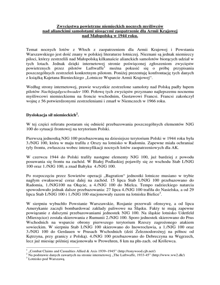 Zwycięstwa powietrzne niemieckich nocnych myśliwców nad alianckimi samolotami niosącymi zaopatrzenie dla Armii Krajowej nad Małopolską w 1944 roku. Temat nocnych lotów z Włoch z zaopatrzeniem dla Armii Krajowej i Powstania Warszawskiego jest dość znany w polskiej literaturze lotniczej. Nieznani są jednak niemieccy piloci, którzy zestrzelili nad Małopolską kilkanaście alianckich samolotów biorących udział w tych lotach. Jednak dzięki internetowej stronie poświęconej zgłoszeniom zwycięstw powietrznych przez pilotów Luftwaffe1 moŜna pokusić się o próbę przypisania poszczególnych zestrzeleń konkretnym pilotom. PoniŜej prezentuję konfrontację tych danych z ksiąŜką Kajetana Bienieckiego „Lotnicze Wsparcie Armii Krajowej“. Według strony internetowej, prawie wszystkie zestrzelone samoloty nad Polską padły łupem pilotów Nachtjagdgeschwader 100. Połowę tych zwycięstw przyznano najlepszemu nocnemu myśliwcowi niemieckiemu na froncie wschodnim, Gustawowi Francsi. Francsi zakończył wojnę z 56 potwierdzonymi zestrzeleniami i zmarł w Niemczech w 1966 roku. Dyslokacja sił niemieckich2. W tej części referatu postaram się odnieść przebazowania poszczególnych elementów NJG 100 do sytuacji frontowej na terytorium Polski. Pierwszą jednostką NJG 100 przebazowaną na dziesiejsze terytorium Polski w 1944 roku była 3./NJG 100, która w maju trafiła z Orszy na lotnisko w Radomiu. Zapewne miała ochraniać tyły frontu, zwłaszcza wobec intensyfikacji nocnych lotów zaopatrzeniowych dla AK. W czerwcu 1944 do Polski trafiły następne elementy NJG 100, juŜ bardziej z powodu posuwania się frontu na zachód. W Białej Podlaskiej pojawiły się ze wschodu Stab I./NJG 100 oraz 1./NJG 100, a znad Bałtyku 4./NJG 100. Po rozpoczęciu przez Sowietów operacji „Bagration“ jednostki lotnicze musiano w trybie nagłym ewakuować coraz dalej na zachód. 15 lipca Stab I./NJG 100 przebazowano do Radomia, 1./NJG100 na Okęcie, a 4./NJG 100 do Mielca. Tempo radzieckiego natarcia spowodowało jednak dalsze przebazowania: 27 lipca 4./NJG 100 trafiła do Nasielska, a od 29 lipca Stab I./NJG 100 i 1./NJG 100 stacjonowały razem na lotnisku Bielice3. W sierpniu wybuchło Powstanie Warszawskie, Rosjanie przerwali ofensywę, a od lipca Amerykanie zaczęli bombardować zakłady paliwowe na Śląsku. Fakty te mają zapewne powiązanie z dalszymi przebazowaniami jednostek NJG 100. Na śląskie lotnisko Udetfeld (Mierzęcice) została skierowania z Rumunii 2./NJG 100. Sporo jednostek skierowano do Prus Wschodnich na wsparcie obrony pierwszego terytorium Rzeszy zagroŜonego atakiem sowieckim. W sierpniu Stab I./NJG 100 skierowano do Inowrocławia, a 1./NJG 100 oraz 3./NJG 100 do Gerdauen w Prusach Wschodnich (dziś śeleznodoroŜnyj na północ od Kętrzyna, przy granicy z Polską). 4./NJG 100 przebazowano do Debreczyna na Węgrzech, lecz juŜ miesiąc później stacjonowała w Prowehren, 8 km na płn-zach. od Królewca. 1 „Combat Claims and Casualties Allied & Axis 1939~1945” (http://tonywood.cjb.net/) Na podstawie danych zawartych na stronie internetowej „The Luftwaffe, 1933-45” (http://www.ww2.dk/) 3 Lotnisko pod Warszawą. 2 Po klęsce Powstania Warszawskiego przesunięto następne jednostki NJG 100 na północ. 18 października Stab I./NJG 100 przesunięto do Gerdauen. W grudniu w Prowehren 2./NJG 100 dołączyła do skoncentrowanych tam Stab I./NJG 100, 1./NJG 100, 3./NJG 100 oraz 4./NJG 100. Pozostałe jednostki NJG 100 (Stab II./NJG 100, 5./NJG 100 oraz 6./NJG 100) stacjonowały w 1944 roku na Słowacji i Węgrzech. Jeśli chodzi o organizację naziemną, w sierpniu 1944 Niemcy dysponowali radiolatarnią (niem. Funkfeuer) w Radomiu, pomocną nocnym myśliwcom w nawigacji, oraz posterunkami radarowymi (niem. Fu.-M.G.-Stellung) pierwszego stopnia gotowości w okolicach Tarnowa (kryptonim „Takelwurm“), Warszawy (kryptonim „Walfisch“) oraz Piotrkowa Trybunalskiego (kryptonim „Perlhuhn“). Posterunek radarowy drugiego stopnia gotowości o kryptonimie „Kranstein“ znajdowała się w Krakowie, a o kryptonimie „Warthenstein” – na południe od Częstochowy. Wymieniam tutaj tylko posterunki znajdujące się w Polsce najbliŜej omawianego rejonu zestrzeleń oraz trasy do Warszawy4. Zestrzelenia alianckich samolotów nad Małopolską. Według ksiąŜki Kajetana Bienieckiego „Lotnicze wsparcie Armii Krajowej“, niemieckie nocne myśliwce były często napotykane w lotach do Kraju. Często pojawiają się meldunki załóg o patrolujących samolotach nad Tatrami i w okolicach Radomia (wokół radomskiej radiolatarni nocne myśliwce mogły krąŜyć przed skierowaniem na konkretny cel), o obcych samolotach z czerwonym światłem w nosie, czy o światłach pozycyjnych nieznanych maszyn. JuŜ podczas misji z 3 na 4 kwietnia 1944 nawigator Halifaxa JP177 (pilot F/L Goszczyński) meldował o duŜej liczbie samolotów nieprzyjacielskich na trasie od Krosna do Lwowa. Maszyna nie wykonała zrzutu, gdyŜ placówka nie wyłoŜyła sygnału. Stało się tak dlatego, Ŝe nieprzyjacielski samolot kilkakrotnie oświetlał wyłoŜoną literę „Y“, tak więc placówka przestała sygnalizować. Taki scenariusz z udziałem niemieckich myśliwców rozgrywał się nad Polską w 1944 roku wiele razy. W nocy 4/5 maja 1944 alianci ponieśli pierwszą stratę od nocnych myśliwców nad Polską. Z akcji nie wrócił Halifax BB438 (148 Dywizjon RAF), który 20 minut po północy spadł koło wsi Borowa5. Bombardier i nawigator dostali się do niewoli, pięciu pozostałych lotników zginęło. Zwycięstwo zostało przyznane porucznikowi Wilhelmowi Seuss z 11./NJG 5, który zgłosił zestrzelenie Halifaxa 18 km na północ od Mielca o 00:19. Podczas misji 4/5 sierpnia 1944 alianci stracili nad Małopolską cztery maszyny, wszystkie z 148 Dywizjonu RAF. Halifax JP276 (pilot F/L A. R. Blynn) został zestrzelony przez myśliwca w rejonie Dąbrowy Tarnowskiej. Siedmioosobowa z