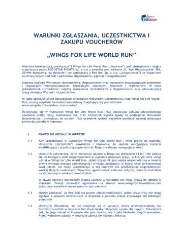 WARUNKI ZGŁASZANIA, UCZESTNICTWA I ZAKUPU VOUCHERÓW „WINGS FOR LIFE WORLD RUN” Wybrana lokalizacja („Lokalizacja”) Wings for Life World Run („Impreza”) jest obsługiwana i objęta organizacją przez ROCHSTAR EVENTS Sp. z o.o z siedzibą pod adresem ul. Wał Miedzeszyński 384, 03-994 Warszawa, na zlecenie i we współpracy z Red Bull Sp. z o.o. („Organizator”) ze wsparciem ze strony Grupy Red Bull i partnerów Organizatora, agencji i usługodawców. Impreza podlega Warunkom Uczestnictwa, Regulaminowi oraz wszystkim obowiązującym przepisom i regulacjom międzynarodowym, federalnym, stanowym, lokalnym i regionalnym. W razie jakiejkolwiek rozbieżności między Warunkami Uczestnictwa a Regulaminem, moc obowiązującą mają niniejsze Warunki. Uczestnictwa W razie ogólnych pytań dotyczących niniejszych Warunków Uczestnictwa i/lub Wings for Life World Run, proszę wypełnić formularz kontaktowy znajdujący się pod adresem www.wingsforlifeworldrun.com/contact. Rejestrując się w wybranym Wings for Life World Run i/lub dokonując zakupu odpowiedniego vouchera (patrz niżej, konkretnie ust. 3.9), Uczestnik wyraża zgodę na podleganie Warunkom Uczestnictwa i oświadcza, że on sam i/lub uczestnik spełnia wszystkie poniższe wymogi dotyczące prawa do udziału w Imprezie. 1. PRAWO DO UDZIAŁU W IMPREZIE 1.1 Aby uczestniczyć w wybranym Wings for Life World Run i mieć prawo do nagrody, Uczestnik („Uczestnik“) oświadcza i zapewnia, że spełnia następujące kryteria kwalifikujące i przed przystąpieniem do Biegu zrealizuje następujące kroki: 1.2 Uczestnik potwierdza, że w momencie udziału w Biegu ma skończone 18 lat i nie zalicza się do kategorii osób niepełnoletnich w systemie prawnym kraju, w którym chce wziąć udział w Wings for Life World Run. Jeżeli Uczestnik jest osobą niepełnoletnią w świetle prawa swojego miejsca zamieszkania i w kraju Lokalizacji, w której chce zarejestrować swój udział, nie może uczestniczyć w tej Imprezie ani przekazywać Organizatorowi swoich danych osobowych. Powyższe ograniczenia wiekowe dotyczą także uczestników na dozwolonych wózkach inwalidzkich. W chwili obecnej mieszkańcy miasta Quebec w Kanadzie nie mają prawa do udziału w Imprezie. Proszę sprawdzić ogłoszenia na stronie www.wingsforlifeworldrun.com dotyczące wszelkich zmian zasad w tym zakresie. 1.3 Należy pamiętać, że Red Bull nie ponosi odpowiedzialności, jeżeli Uczestnicy nie mogą zgodnie z prawem uczestniczyć w Imprezie z powodu prawa krajowego lub lokalnych przepisów. 1.4 Uczestnik Oświadcza, że nie znajduje się w sytuacji, która uniemożliwiałaby mu bezpieczny udział w Imprezie lub stwarzałaby faktyczne ryzyko dla innych. Potwierdza też, że jego udział w Imprezie nie jest niemożliwy z jakichkolwiek innych powodów. Przed wzięciem udziału w Imprezie zaleca się wizytę u lekarza. 1.5 Aby mieć prawo do udziału w Imprezie, należy wypełnić w całości i dokładnie formularz „Oświadczenia Uczestnika“, podpisać go, a następnie przekazać Obsłudze Biegu w Lokalnym Punkcie Rejestracyjnym przez rozpoczęciem Biegu. 1.6 Możliwa jest tylko jedna rejestracja dla danej osoby. 1.7 Uczestnik ma obowiązek przeczytać i wyrazić zgodę na Regulamin, który oprócz różnych innych informacji i wymagań zawiera wyjaśnienie, jakie dodatkowe pomoce i narzędzia są zabronione podczas biegu i którą kategorię należy wybrać, jeżeli jest to wymagane i możliwe. Wszelkie naruszenia Regulaminu lub niniejszych Warunków Uczestnictwa mogą (według wyłącznego uznania Organizatora) prowadzić do dyskwalifikacji i wykluczenia z Imprezy bez możliwości ubiegania się o zwrot jakichkolwiek kosztów związanych z Wpisowym i innymi wydatkami. 1.8 Organizator zastrzega sobie prawo do sprawdzenia w dowolnym momencie według własnego uznania informacji podanych Organizatorowi przez Uczestnika, a w szczególności do żądania okazania dowodu potwierdzającego pełnoletniość, tożsamość i/lub inne dane. Zgłoszenia zawierające nieistniejący adres e-mail lub nieprawidłowe dane dotyczące wieku lub miejsca zamieszkania Uczestnika będą uznawane za nieważne. 1.9 Organizator zastrzega sobie prawo do ograniczenia ogólnej liczby Uczestników w każdej z lokalnych Imprez. W razie osiągnięcia takiego limitu, dalsi Uczestnicy nie będą przyjmowani w danej Lokalizacji Imprezy i zostaną w należyty sposób poinformowani o tym fakcie na witrynie www.wingsforlifeworldrun.com. 1.10 W takich wypadkach, jeżeli dostępne będą określone kategorie wyścigów (np. mężczyzn, kobiet, mężczyzn lub kobiet oraz, w niektórych lokalizacjach, dzieci i nastolatków), Organizator zastrzega też sobie prawo do określenia minimalnej i maksymalnej liczby Uczestników, co zostanie ogłoszone w odpowiednim czasie na stronie internetowej ww.wingsforlifeworldrun.com. Jeżeli na tydzień przed końcem Okresu Rejestracji określonego w ust. 2.1 nie zostanie osiągnięta minimalna liczba Uczestników, Organizator zastrzega sobie prawo do anulowania lokalnej Imprezy lub anulowania określonych kategorii biegów i opublikowania informacji o anulowaniu na witrynie www.wingsforlifeworldrun.com. W takiej sytuacji przyznany zostanie zwrot Wpisowego zapłaconego za anulowane biegi. 1.11 Wings for Life World Run zostanie przeprowadzony według wyłącznego uznania Organizatora. Decyzja Organizatora dotycząca wszystkich spraw związanych z Wings for Life World Run jest ostateczna i nie podlega dalszej korespondencji. 2. OKRES REJESTRACJI I HARMONOGRAM WINGS FOR LIFE WORLD RUN 2015 2.1 Zgłoszenia do Wings for Life World Run rozpoczynają się 1 października 2014 r. o godz. 11.00 skoordynowanego czasu uniwersalnego (UTC) i kończą się 28 kwietnia 2015 r. o godz. 11.00 czasu UTC. Dla niektórych lokalizacji oraz dla kategorii dzieci/nastolatków przewidzianych w pewnych lokalizacjach okres nadsyłania zgłoszeń może rozpocząć się później, co 