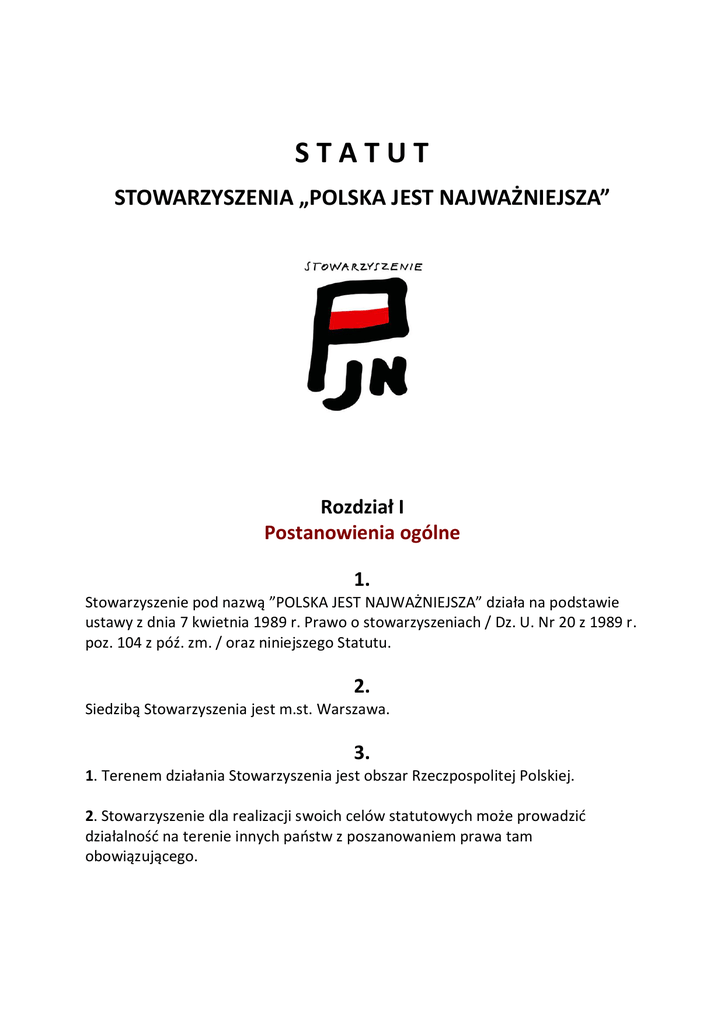 STATUT STOWARZYSZENIA „POLSKA JEST NAJWAŻNIEJSZA” Rozdział I Postanowienia ogólne 1. Stowarzyszenie pod nazwą ”POLSKA JEST NAJWAŻNIEJSZA” działa na podstawie ustawy z dnia 7 kwietnia 1989 r. Prawo o stowarzyszeniach / Dz. U. Nr 20 z 1989 r. poz. 104 z póź. zm. / oraz niniejszego Statutu. 2. Siedzibą Stowarzyszenia jest m.st. Warszawa. 3. 1. Terenem działania Stowarzyszenia jest obszar Rzeczpospolitej Polskiej. 2. Stowarzyszenie dla realizacji swoich celów statutowych może prowadzić działalność na terenie innych państw z poszanowaniem prawa tam obowiązującego. 4. Stowarzyszenie posiada osobowość prawną i powołane jest na czas nieoznaczony. 5. Stowarzyszenie może współpracować z krajowymi, zagranicznymi i międzynarodowymi organizacjami pozarządowymi. 6. Stowarzyszenie opiera swą działalność na pracy społecznej członków. Dla prowadzenia swoich działań może powołać biuro i zatrudniać pracowników. 7. Stowarzyszenie używa pieczęci z napisem: Stowarzyszenie ”POLSKA JEST NAJWAŻNIEJSZA”. Stowarzyszenie może używać znaku graficznego /logo/, odznaki organizacyjnej. Wzór pieczęci, znaku graficznego i odznaki określą uchwały Zarządu Stowarzyszenia. Rozdział II Cele i sposoby działania 8. 1. Celem Stowarzyszenia jest udział w życiu publicznym zgodnie z konstytucyjną zasadą demokratycznego państwa prawnego oraz kultywowanie postaw patriotycznych obywateli. 2. Nadto celem Stowarzyszenia jest szeroka działalność społeczna, edukacyjna i kulturalna zmierzająca do zachowania w pamięci narodowej ofiar katastrofy smoleńskiej, w szczególności inspirowanie i wspieranie inicjatywy wzniesienia w Warszawie pomnika dla uczczenia Prezydenta Rzeczpospolitej Lecha Kaczyńskiego oraz pozostałych ofiar katastrofy. 9. Stowarzyszenie swoje cele realizuje w szczególności poprzez: 1. Organizowanie spotkań, konferencji, seminariów, wystaw dotyczących bieżących spraw publicznych, a także popularyzujących tradycję historyczną. 2. Wydawanie i rozpowszechnianie publikacji poświęconych tematyce związanej z celami Stowarzyszenia. 3. Promowanie w kraju i za granicą idei budowy pomnika, wspieranie organizacji konkursu architektoniczno-urbanistycznego na projekt pomnika, pozyskiwanie środków finansowych na pokrycie kosztów budowy, w tym także zbiórki publicznej po uzyskaniu stosownego zezwolenia. 4. Współpracę z polskimi i zagranicznymi mediami mającą na celu realizację celów statutowych Stowarzyszenia. Rozdział III Członkowie Stowarzyszenia 10. 1. Członkami Stowarzyszenia mogą być osoby fizyczne i prawne. Osoby prawne mogą posiadać jedynie status członka wspierającego. 2. Członkowie Stowarzyszenia to: członkowie zwyczajni członkowie wspierający członkowie honorowi 11. 1. Członkiem zwyczajnym Stowarzyszenia może zostać każdy pełnoletni obywatel polski, posiadający pełną zdolność do czynności prawnych, niepozbawiony praw publicznych, po złożeniu pisemnej deklaracji o przystąpieniu do Stowarzyszenia. 2. Przyjęcie nowych członków następuje na podstawie decyzji Prezydium Zarządu Stowarzyszenia w terminie miesiąca od daty złożenia deklaracji. Warunek ten nie dotyczy członków – założycieli Stowarzyszenia. 3. Od decyzji o nieprzyjęciu w poczet członków Stowarzyszenia, zainteresowanemu przysługuje odwołanie do Zarządu Stowarzyszenia w terminie 14 dni od daty doręczenia decyzji. 4. Członkiem wspierającym może zostać każda osoba fizyczna lub prawna , która wniosła na rzecz Stowarzyszenia pomoc materialną. 5. Decyzję o członkostwie wspierającym podejmuje Prezydium Zarządu Stowarzyszenia na podstawie pisemnej deklaracji. 6. Członkiem honorowym Stowarzyszenia może zostać osoba fizyczna, która wniosła szczególnie znaczący wkład do realizacji celów Stowarzyszenia. 7. Uchwałę o nadaniu tytułu honorowego członka Stowarzyszenia podejmuje Walne Zgromadzenie Członków na wniosek Zarządu Stowarzyszenia. 12. 1. Członkowie zwyczajni mają: - bierne i czynne prawo wyborcze do władz Stowarzyszenia - prawo udziału w spotkaniach, konferencjach i seminariach organizowanych przez Stowarzyszenie - prawo zgłaszania wniosków i pytań do władz Stowarzyszenia. 2. Podstawowymi obowiązkami członków Stowarzyszenia jest przestrzeganie postanowień Statutu i uchwał władz Stowarzyszenia oraz regulowanie składek członkowskich. 13. Członkowie wspierający, działający osobiście lub przez swojego przedstawiciela, oraz członkowie honorowi mają prawo uczestniczenia w obradach Walnego Zgromadzenia Członków bez prawa wyborczego. 14. 1. Członkostwo w Stowarzyszeniu ustaje: 1. na skutek pisemnej deklaracji o wystąpieniu ze Stowarzyszenia 2. wykluczenia przez Prezydium Zarządu na skutek: - rażącego naruszenia zasad statutowych Stowarzyszenia lub uchwał i postanowień władz Stowarzyszenia - braku aktywnej działalności na rzecz Stowarzyszenia 3. śmierci członka Stowarzyszenia. 2. Od decyzji Prezydium Zarządu o wykluczeniu ze Stowarzyszenia, zainteresowanemu przysługuje odwołanie do Zarządu Stowarzyszenia w terminie 14 dni od daty doręczenia decyzji o wykluczeniu. Rozdział IV Władze Stowarzyszenia 15. 1. Władzami Stowarzyszenia są: Walne Zgromadzenie Członków Zarząd Komisja Rewizyjna 2. Kadencja władz stowarzyszenia trwa 3 lata. Walne Zgromadzenie Członków 16. 1. Najwyższą władzą Stowarzyszenia jest Walne Zgromadzenie Członków. 2. Walne Zgromadzenie Członków może być zwyczajne lub nadzwyczajne 3. Zwyczajne Zgromadzenie Członków zwołuje raz do roku Zarząd Stowarzyszenia jako zgromadzenie sprawozdawcze. Co trzy lata Zarząd Stowarzyszenia zwołuje Walne Zgromadzenie Członków jako zgromadzenie sprawozdawczo – wyborcze. 4. Nadzwyczajne Walne Zgromadzenie zwoływane jest przez Zarząd z własnej inicjatywy lub na wniosek Komisji Rewizyjnej w terminie miesiąca od podjęcia uchwały o zwołaniu nadzwyczajnego Walnego Zgromadzenia lub od daty wp