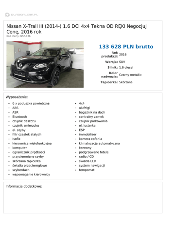 Nissan X-Trail III (2014-) 1.6 DCI 4x4 Tekna OD RĘKI Negocjuj Cenę, 2016 rok Kod oferty: NSP-136 133 628 PLN brutto Rok 2016 produkcji: Wersja: SUV Silnik: 1.6 diesel Kolor Czarny metallic nadwozia: Tapicerka: Skórzana Wyposażenie: - 6 x poduszka powietrzna ABS ASR Bluetooth czujnik deszczu czujnik zmierzchu el. szyby filtr cząstek stałych Isofix kierownica wielofunkcyjna komputer ogranicznik prędkości przyciemniane szyby skórzana tapicerka światła przeciwmgłowe szyberdach wspomaganie kierownicy Informacje dodatkowe: - 4x4 alufelgi bagażnik na dach centralny zamek czujnik parkowania el. lusterka ESP immobiliser kamera cofania klimatyzacja automatyczna ksenony podgrzewane fotele radio / CD światła LED system nawigacji tempomat Autoryzowany Dealer Nissan A i R Polody Spółka Jawna ul. Rynkowa 160 62-081 Przeźmierowo Tel.: 660-783-624 Fax: