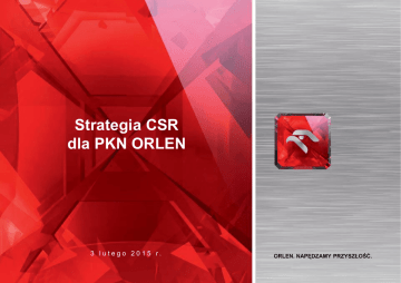 Strategia CSR dla PKN ORLEN 3 lutego 2015 r. ORLEN. NAPĘDZAMY PRZYSZŁOŚĆ. Fundamentem Strategii CSR dla PKN są WARTOŚCI ORLEN Nasze wartości Odpowiedzialność Rozwój Szanujemy naszych klientów, akcjonariuszy, środowisko naturalne oraz lokalne społeczności Poszukujemy nowych możliwości Energia Działamy z entuzjazmem Ludzie Naszymi atutami są: kompetencje, współpraca i uczciwość Niezawodność Można na nas polegać Nasza misja Odkrywając i przetwarzając zasoby naturalne, napędzamy przyszłość. Nasze credo ORLEN. Napędzamy przyszłość. Obowiązujący w Koncernie dokument: Biała księga: „Wartości i zasady postępowania PKN ORLEN S.A.”, definiuje i wskazuje wartości, które zobowiązujemy się respektować w naszej firmie, jak i względem otoczenia. W białej księdze zdefiniowano kluczowych dla Wartości interesariuszy takich jak: Pracownicy, Klienci, Akcjonariusze, Społeczność lokalna, Środowisko naturalne, Partnerzy biznesowi, Konkurenci, Organy władzy i administracji. 2 W ramach prac nad Strategią zdefiniowaliśmy, jak rozumiemy społeczną odpowiedzialność biznesu w Koncernie Realizując strategię biznesową, zawsze pamiętamy, że wzrost wartości przedsiębiorstwa powinien być zgodny z interesami otoczenia, w którym funkcjonujemy oraz opierać się o zrównoważone i odpowiedzialne korzystanie z zasobów 3 Trzy obszary Strategii CSR – odpowiedź na trendy Obszar Strategii CSR w Koncernie Organizacja – – ORGANIZACJA kształtujemy postawy budujemy relacje OTOCZENIE Otoczenie bliskie BLISKIE – budujemy relacje kształtujemy postawy OTOCZENIE DALEKIE Otoczenie dalekie – – przewodzimy przewodzimy zmianom zmianom Priorytety Strategii CSR w Koncernie Bezpieczeństwo pracowników Zarządzanie rozwojem i różnorodnością Life balance i zaangażowanie społeczne pracowników Przesłanki Wysoka świadomość i oczekiwania wobec pracodawcy dotyczące podstawowych kwestii związanych z prawami pracowników i zapewnianiem bezpieczeństwa Pokolenie Y na rynku pracy, zmiana oczekiwań wobec pracodawcy Zmiany demograficzne, starzenie się społeczeństwa Oczekiwania pracowników dotyczące partycypacji w zarządzaniu i dialogu z pracodawcą oraz możliwości realizowania pasji społecznych Wizerunek odpowiedzialnej Niski poziom zaufania społecznego, brak partnerstwa, zaangażowania spółki i współpracy* Angażowanie interesariuszy Rosnąca świadomość konsumentów, którzy zwracają coraz częściej uwagę na odpowiedzialne postępowanie firm Zaangażowanie społeczne Rosnące rozwarstwienie społeczne zarówno na poziomie kraju, jak i globalnie Odpowiedzialny rozwój Etyczne przywództwo Nowe obszary biznesowe i innowacyjność Silna międzynarodowa presja społeczna i polityczna związana z minimalizacją negatywnego wpływu na środowisko Rozwój i wzrost znaczenia nowych technologii oraz ich coraz większa rola w życiu ludzi Rosnące oczekiwania związane z mierzeniem i pokazywaniem efektów oraz wpływu działalności firmy na otoczenie Rosnące zapotrzebowanie na energię 4 * Opracowanie „2050. Wizja zrównoważonego rozwoju dla polskiego biznesu”. ORGANIZACJA: Budujemy relacje Priorytety Bezpieczeństwo pracowników Działania Budujemy kulturę bezpieczeństwa opartą na odpowiedzialności pracowników i podwykonawców za wspólne bezpieczeństwo w pracy i poza nią Zarządzanie rozwojem i różnorodnością Inspirujemy do rozwoju, kreatywności i innowacyjności przy wykorzystaniu dialogu społecznego oraz potencjału tkwiącego w różnorodności Life balance i zaangażowanie społeczne pracowników Promujemy aktywny, zdrowy styl życia i tworzymy warunki do harmonijnego łączenia wyzwań zawodowych z rolą członka rodziny Motywujemy do empatii i wrażliwości społecznej, a poprzez to integrujemy pracowników wokół ważnych celów społecznych Jesteśmy dobrym, odpowiedzialnym pracodawcą, który stawia na wzajemne zaufanie, zaangażowanie i efektywność pracowników, dbając o ich bezpieczeństwo oraz wspierając zachowanie równowagi pomiędzy życiem zawodowym i prywatnym 5 OTOCZENIE BLISKIE: Kształtujemy postawy Priorytety Wizerunek odpowiedzialnej spółki Działania Dążymy do bycia postrzeganym przez interesariuszy (dostawcy, klienci, inwestorzy, kontrahenci) jako lider odpowiedzialnego biznesu Wymagamy od naszych dostawców spełnienia zdefiniowanych przez nas kryteriów odpowiedzialności Budujemy świadomość klientów dotyczącą wartości płynących z zaangażowania społecznego, troski o środowisko naturalne, zdrowego stylu życia oraz bezpiecznej jazdy Budujemy u naszych klientów świadomość, że jesteśmy liderem branży w zakresie ochrony środowiska Angażowanie interesariuszy Wykorzystujemy potencjał sieci sprzedaży na rzecz zaangażowania klientów w inicjatywy społeczne Koncernu Zaangażowanie społeczne Dążymy do bycia postrzeganym jako członek społeczności lokalnej wpływający aktywnie na pozytywne zmiany w otoczeniu Rozwijamy wrażliwość społeczną naszych partnerów biznesowych – klientów, kontrahentów, społeczności lokalnych, dostawców, akcjonariuszy 6 OTOCZENIE DALEKIE: Przewodzimy zmianom Priorytety Odpowiedzialny rozwój Działania Realizujemy strategię budowy wartości PKN ORLEN 2014-2017 aktywnie wzmacniając bezpieczeństwo energetyczne oraz wspierając rozwój gospodarczy regionu Zachowujemy równowagę pomiędzy efektywnością a ekologią Etyczne przywództwo Dążymy do bycia postrzeganym jako promotor etyki biznesu i ochrony środowiska Nowe obszary biznesowe i innowacyjność Wspieramy rozwój innowacji i inspirujących liderów działających z pasją, energią i zaangażowaniem Dążymy do bycia postrzeganym przez otoczenie rynkowe jako lider jutra, realizując innowacyjne projekty, w tym m.in. venture capital Realizujemy Strategię Koncernu i promujemy innowacyjność wyznaczając najwyższe standardy branżowe w zakresie etyki biznesu i ochrony ś