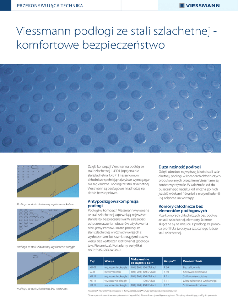 PRZEKONYWUJĄCA TECHNIKA Viessmann podłogi ze stali szlachetnej komfortowe bezpieczeństwo Dzięki koncepcji Viessmanna podłόg ze stali szlachetnej 1.4301 (opcjonalnie stalszlachetna 1.4571) nasze komory chłodnicze spełniają najwyższe wymagagania higieniczne. Podłogi ze stali szlachetnej Viessmann są bezfugowe i nachodzą na siebie bezstopniowo. Podłoga ze stali szlachetnej, wytłoczenie kuliste Podłoga ze stali szlachetnej, wytloczenie okrągłe Podłoga ze stali szlachetnej, bez wytłoczeń Antypoślizgowakompresja podłogi Podłogi w komorach Viessmann wykonane ze stali szlachetnej zapewniają najwyższe standardy bezpieczeństwa! W zależności od przeznaczenia i obszarów użytkowania oferujemy Państwu nasze podłogi ze stali szlachetnej w różnych wersjach z wytłoczeniami kulistymi, okrągłymi oraz w wersji bez wytłoczeń (szlifowana) (podłoga tzw. Piekarnicza). Posiadamy certyfikat ANTYPOŚLIZGOWOŚCI. Maksymalne obciążenie kόł.* Duża nośność podłogi Dzięki obrόbce najwyższej jakości stali szlachetnej, podłogi w komorach chłodniczych produkowanych przez firmę Viessmann są bardzo wytrzymałe. W zależności od dopuszczalnego nacisku kόł można po nich jeździć wózkami (również z małymi kołami) i są odporne na wstrząsy. Komory chłodnicze bez elementόw podłogowych Przy komorach chłodniczych bez podłog ze stali szlachetnej, elementy ścienne skręcane są na miejscu z podłogą za pomoca profili U z tworzywa sztucznego lub ze stali szlachetnej. Grupa** Powierzchnia Typ Wersja KR 09 wytłoczenia okrągłe 100 | 200 | 400 KP/Rad R 09 Bez szlifowania G 36 bez wytłoczeń 100 | 200 | 400 KP/Rad R 10 Szlifowanie wzdłużne KR 11 wytłoczenia okrągłe 100 | 200 | 400 KP/Rad R 11 Szlifowanie wzdłużne KE 11 wytłoczenia okrągłe 100 KP/Rad R 11 z/bez szlifowania wzdłużnego KR 12 wytłoczenia okrągłe 100 | 200 | 400 KP/Rad R 12 Szlifowanie krzyżowe Nacisk kόł*: Powierzchnia obciążenia > 4 cm2/koło | Grupa**: Grupa oceniająca antypoślizgowość (Stowarzyszenie zawodowe ubezpieczenia od wypadkόw). Pozostałe wersje podłόg na zapytanie. Oferujemy również typy podłóg do spawania. PRZEKONYWUJĄCA TECHNIKA TECTO – Doskonała higiena TECTO wersja standardowa grubość ścian 80, 100, 120, 150 mm Nasza standardowa wersja TECTO spełnia wszystkie cechy charakterystyczne, które są potrzebne do higienicznego oraz sterylnego składowania towaru chłodniczego. W standardowych komorach chłodniczych oraz mroźniczych TECTO ściany komory przylegają bezpośrednio do izolowanej podłogi ze stali szlachetnej. TECTO Standard wersja WL Grubość ścian 80, 100 mm Styki elementów ścian komłór chłodniczych i mroźniczych TECTO Standard WL80, WL100 są wyposażone we wpust i pióro oraz położoną pomiędzy uszczelkę. Zakładka TECTO bezfugowe przejście od ściany do ściany. Dzięki bezfugowemu nakładaniu się ścian unika się osadzania brudu i wody. TECTO Standard Podłoże ze stali szlachetnej o stożkowatych wytłoczeniach. TECTO Spezial Grubość ścian 100mm W wersjach TECTO Spezial ocieplone podłoże ze stali szlachetnej wyposażone jest aż do ścian komory w duże zaokrąglenie, ułatwiające zachowanie higieny. Dodatkowo kąty podłoża są zaokrąglone, a powierzchnia podłoża nalożona bezfugowo i bezstopniowo. W ten sposób unika się osadzaniu brudu. Ściany komory chłodniczej przylegają do siebie bez szczelin i stoją podwyższone na zaokrągleniu podłoża. Dzięki tej konstrukcji woda do mycia lub wilgoć z towaru chłodniczego nie może przedostać sie pomiędzy ściany podłoża a komory. Skutecznie zapobiega sie procesowi nukleacji, który rozwija sie zwłaszcza w fugach i kątach. Do tego zaokraglenie na całym obwodzie umożliwia łatwe i higienicznie optymalne czyszczenie. Elementy ściany dostarczane są z bezfugową zakładką TECTO. Kąty ścian komory są wyposażone od wewnętrznej strony komory chłodniczej w zaokrąglenie. Wersje specjalne jak komory okrętowe w USPH-Standard uzupełniają wymagający program TECTO. TECTO Spezial Podłoże ze stali szlachetnej o owalnych wytłoczeniach. Viessmann Kältetechnik AG Schleizer Straße 100 95030 Hof/Saale - Germany DORA Paweł Kalinowski-Mikołajczuk 66-432 Baczyna, ul. Osiedlowa 3 k/Gorzów Wlkp. www.dorago.pl [email protected] telefon: +48 95 718 09 08 +48 501 465 512 +48 501 465 514