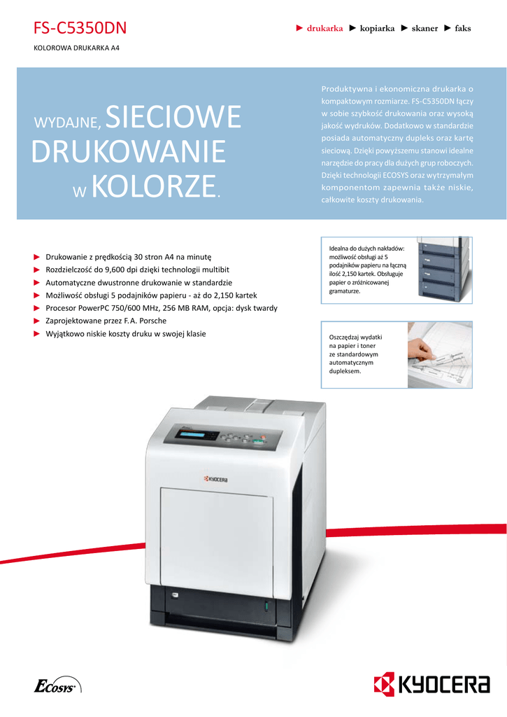 FS-C5350DN ► drukarka ► kopiarka ► skaner ► faks KOLOROWA DRUKARKA A4 Sieciowe Drukowanie w Kolorze. Wydajne, Drukowanie z prędkością 30 stron A4 na minutę Rozdzielczość do 9,600 dpi dzięki technologii multibit Automatyczne dwustronne drukowanie w standardzie Możliwość obsługi 5 podajników papieru - aż do 2,150 kartek Procesor PowerPC 750/600 MHz, 256 MB RAM, opcja: dysk twardy Zaprojektowane przez F. A. Porsche Wyjątkowo niskie koszty druku w swojej klasie Produktywna i ekonomiczna drukarka o kompaktowym rozmiarze. FS-C5350DN łączy w sobie szybkość drukowania oraz wysoką jakość wydruków. Dodatkowo w standardzie posiada automatyczny dupleks oraz kartę sieciową. Dzięki powyższemu stanowi idealne narzędzie do pracy dla dużych grup roboczych. Dzięki technologii ECOSYS oraz wytrzymałym komponentom zapewnia także niskie, całkowite koszty drukowania. Idealna do dużych nakładów: możliwość obsługi aż 5 podajników papieru na łączną ilość 2,150 kartek. Obsługuje papier o zróżnicowanej gramaturze. Oszczędzaj wydatki na papier i toner ze standardowym automatycznym dupleksem. FS-C5350DN KOLOROWA DRUKARKA A4 Technologia ECOSYS jest oparta na bardzo wytrzymałych komponentach. Bęben drukarki FS-C5350DN został zaprojektowany tak, aby móc wydrukować do 200 000 stron. Dzięki technologii ECOSYS wymianie podlega jedynie toner, co sprawia, że koszty eksploatacji drukarki są bardzo niskie. FS-C5350DN ma najniższe koszty wydruku w swojej klasie. Poza tym drukarki Kyocera są przyjazne środowisku. PRESCRIBE IIc Prescribe IIc jest zarówno językiem sterującym, jak i językiem opisu strony. To dzięki niemu możliwe jest drukowanie kompleksowej grafiki, loga oraz formularzy pod każdym systemem operacyjnym. Prescribe IIc umożliwia także, późniejsze zapisywanie i aktualizowanie już z poziomu drukarki. OGÓLNE 500-kartkowa, uniwersalna kaseta; 60–120 g/m2; A4, A5, A6, B5, B6, Letter, Legal, Custom (105 x 148 – 216 x 356 mm) Max. ilość wejściowa papieru (z opcjami): 2,150 kartek OPCJE Automatyczny dupleks Dupleks w standardzie: 60–120 g/m2; A4, A5, B5, Letter, Legal, Custom (140 x 210 mm – 216 x 356 mm) Podajnik papieru PF-510 Uniwersalna kaseta na 500 kartek; 60–220 g/m2; A4, A5, B5, Letter, Legal, Custom (148 x 210 mm – 216 x 356 mm) Pojemność wyjściowa 250 kartek nadrukiem do dołu z czujnikiem przepełnienia Szafka CB-500 Wysokość ok. 40 cm KONTROLER Opcjonalna pamięć MDDR2-128: 128 MB; MDDR2-256: 256 MB; MDDR2-512: 512 MB, MDDR2-1024: 1.024 MB Technologia Laserowa KYOCERA ECOSYS Szybkość drukowania 30 stron A4 na minutę w kolorze i cz/b Rozdzielczość 600 x 600 dpi Technologia Multi-Bit pozwala na drukowanie w rozdzielczości 9,600 x 600 dpi Obciążalność 100,000 stron KM NetViewer KM-NetViewer umożliwia całkowite monitorowanie i kontrolę wszystkich drukarek Kyocera opartych na systemie ECOSYS oraz laserowych urządzeń wielofunkcyjnych Kyocera pracujących w systemie operacyjnym Windows, co z kolei umożliwia doskonałą administrację sieciową. KM-NetViewer obsługuje także standardowy protokół SNMP. Status Monitor i Command Center Status Monitor pokazuje aktualny stan drukarki i daje możliwość bezpośredniego dostępu do Command Center w celu modyfikacji ustawień, które nie są zawarte w sterowniku (np.: ustawienia sieciowe). Interfejs USB dla pamięci przenośnej USB Flash Pliki PDF mogą być drukowane bezpośrednio z pamięci przenośnych USB (poprzez dedykowany port USB). Pliki przeznaczone do drukowania wybierane są z panelu operacyjnego drukarki. Do przeprowadzenia tej operacji komputer nie jest wymagany. Procesor PowerPC 750/600 MHz Czas wygrzewania Ok. 36 sekund lub mniej Czas pierwszej strony Ok. 8.5 sekund lub mniej w cz/b Ok. 10 sekund lub mniej w kolorze Wymiary (szer. x głęb. x dług.) 345 mm x 518 mm x 480 mm Waga Ok. 29,5 kg Pamięć 256 MB RAM, możliwość rozszerzenia 1,280 MB RAM Standardowy interfejs USB 2.0 (Hi-Speed), gniazdo USB przeznaczone dla urządzeń USB Flash Memory, FastEthernet (10/100BaseTX) Slot dla opcjonalnego print serwera lub dysku twardego Slot dla opcjonalnej karty CompactFlash Język sterujący Prescribe IIc Zasilanie 220/240 V, 50/60 Hz Emulacje PCL6, PCL5c, PostScript 3 (KPDL 3 - kompatybilny), XPS Direct Print, PDF Direct Print, Pobór mocy Drukowanie: 516 W Czuwanie: 74 W Uśpienie: 8 W Poziom hałasu (ISO 7779 / ISO 9296) Drukowanie: 55 dB(A) Czuwanie: 36 dB(A) Standardy bezpieczeństwa GS, TÜV, CE Drukarki produkowane zgodnie z normą jakości ISO 9001 i normą ochrony środowiska ISO 14001. OBSŁUGA PAPIERU Wszystkie wymienione pojemności zostały podane dla papieru o grubości maks. 0,11 mm. Pojemność wejściowa 150-kartkowy, wielofunkcyjny podajnik; 60–220 g/m2; A4, A5, A6, B5, B6, Letter, Legal, Custom (70 x 138 mm – 216 x 356 mm) Systemy operacyjne Wszystkie dostępne systemy operacyjne Windows, Mac OS X Version 10.2 lub wyższa, UNIX, LINUX jak również inne systemy dostępne na żądanie Czcionki 93 skalowane czcionki dla PCL, 136 skalowane czcionki dla PostScript, 8 czcionek dla Windows Vista, czcionka bitmapowa, 45 kodów kreskowych (np. EAN8, EAN13, EAN128) z automatyczną generacją sum kontrolnych jak również wsparciem dla dwuwymiarowych kodów kreskowych PDF-417 w PRESCRIBE Podajnik papieru PF-500 Uniwersalna kaseta na 500 kartek; 60–120 g/m2; A4, A5, B5, Letter, Legal, Custom (148 x 210 mm – 216 x 356 mm) Karta CompactFlash 1 gniazdo (do 4 GB) na formularze, czcionki, loga, makra Pamięć USB Flash Umożliwia drukowanie plików PDF via USB Host Interface Dysk twardy HD-5a 40 GB do przechowywania dokumentów DOSTĘPNE WARIANTY FS-C5350DN z rozszerzoną gwarancją GWARANCJA 2 letnia gwarancja w standardzie. Kyocera gwarantuje 3 letnią trwałość bębna lub 200,000 stron wydruków (zależnie od tego który z warunków wystąpi wcześniej) przy założeniu, że każda z drukarek będzie stosowana i czyszczona zgodnie z 