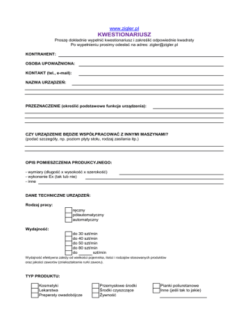 www.zigler.pl KWESTIONARIUSZ Proszę dokładnie wypełnić kwestionariusz i zakreślić odpowiednie kwadraty Po wypełnieniu prosimy odesłać na adres: [email protected] KONTRAHENT: OSOBA UPOWAŻNIONA: KONTAKT (tel., e-mail): NAZWA URZĄDZEŃ: PRZEZNACZENIE (określić podstawowe funkcje urządzenia): CZY URZĄDZENIE BĘDZIE WSPÓŁPRACOWAĆ Z INNYMI MASZYNAMI? (podać szczegóły, np. poziom płyty stołu, rodzaj zasilania itp.) OPIS POMIESZCZENIA PRODUKCYJNEGO: - wymiary (długość x wysokość x szerokość) - wykonanie Ex (tak lub nie) - inne DANE TECHNICZNE URZĄDZEŃ: Rodzaj pracy: ręczny półautomatyczny automatyczny Wydajność: do 30 szt/min do 40 szt/min do 50 szt/min do 80 szt/min do szt/min Wydajność efektywna zależy od wielkości pojemnika, ilości i rodzajów stosowanych produktów oraz jakości zaworów (zniekształcenie rurki zaworu). TYP PRODUKTU: Kosmetyki Lekarstwa Preperaty owadobójcze Przemysłowe środki Środki czyszczące Żywność Pianki poliuretanowe Inne (jeśli tak to jakie) DOKŁADNY OPIS PRODUKTU: skład chemiczny gęstość toksyczność palność pienienie niskie średnie wysokie ZAWORY: 1" zawory z rurką 20 mm zawory bez rurki Max. długość rurki 1" zawory bez rurki z główkami rozpyłowymi Producent 20 mm zawory z rurką Inne Typ RODZAJ GŁOWICY ZACISKAJĄCEJ: na zawory o śr. 1" na zawory o śr. mniejszej niż 1" RODZAJ SZCZĘK ZACISKOWYCH: szczęki do zaworów 1" szczęki do zaworów mniejszych niż 1" (podać średnicę) RODZAJ POJEMNIKÓW: blaszane aluminiowe szklane inne WYMIARY POJEMNIKÓW (średnica / wysokość): Φ35 Φ38 Φ45 Φ50 Φ53 Φ58 Φ66 Φ minimalna i maksymalna wysokość pojemnika ILOŚĆ PRODUKTU w ml (dozowana do jednego pojemnika): od do SPOSÓB PODAWANIA PRODUKTU: grawitacyjny ciśnieniowy (pompa pneumatyczna ZIGLER) mm ILOŚĆ GAZU w ml (dozowana do jednego pojemnika): od do SPOSÓB PODAWANIA GAZU: pompy elektryczne przy zbiorniku pompa pneumatyczna (ZIGLER) RODZAJ GAZU: propan / butan azot DME CO2 powietrze inne ZGAZOWYWANIE POJEMNIKÓW: Palne gazy będą wtłaczane w kontenerach na zewnątrz budynku (GAS HOUSE) Linia umieszczona w pomieszczeniu w wykonaniu przeciwwybuchowym Ex RODZAJ ZAKRĘCANIA: elektryczny z regulacja siły docisku pneumatyczny WYPOSAŻENIE ELEKTRYCZNE: w całości przeciwwybuchowe Ex wersja przeciwwybuchowa Ex tylko w strefie Z1 standard bez wersji przeciwwybuchowej Ex WYPOSAŻENIE DODATKOWE: (Stoły podawcze, transportery, elewatory, stoły odbiorcze, przyrządy pomiarowe, zestawy serwisowe, itp.) WYMAGANIA TECHNOLOGICZNE DLA URZĄDZEŃ: (np. temperatura zgrzewania, ilość cykli wytrząsarki, dokładność ważenia, dokładność dozowania, czułość detektorów gazu, itp.) UWAGI DO PROJEKTU: WYKONANIE: Urządzenia wykonane są ze stali nierdzwenej oraz z materiałów uszlachetnionych i zabezpieczonych przed korozją. Zastosowano uszczelnienia o najwyższej jakości i wysokiej odporności na ścieranie. Napędy elektryczne standardowo w wykonaniu Ex z płynną regulacją prędkości.