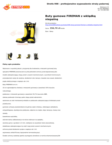 Strefa 998 - profesjonalne wyposażenie straży pożarnej Wietszyce 41 67-221 Białołęka tel: 723 895 900 Buty gumowe FIREMAN z wkłądką niepalną link do produktu: http://strefa998.pl/buty-gumowe/1091-buty-gumowe-fireman-z-wkladka-niepalna.html Cena: 356,70 zł brutto Stan: Nowy Pełny opis produktu Wykonane z wysokiej jakości, przyjaznej dla środowiska, mieszanki gumowej buty specjalne FIREMAN przeznaczone są dla jednostek ochrony przeciwpożarowej jako środek zabezpieczający stopy przed: urazami mechanicznymi, czynnikami termicznymi, przesiąkaniem wody do wnętrza, działaniem olei, benzyn, kwasów oraz zasad, działaniem prądu elektrycznego o napięciu do 1 kV. Buty FIREMAN to m.in.: 33 cm ognioodporna cholewa z mieszanki gumowej o zawartości 55% kauczku naturalnego, podeszwa z mieszanki gumowej o zawartości 55,7% kauczuku NBR, stalowy podnosek chroniący palce stopy przed uderzeniem, wykonana ze stali nierdzewnej wkładka w podeszwie zabezpieczająca śródstopie przed przekłuciem, gumowe uchwyty przytwierdzone do górnej części cholewy, ułatwiające zakładanie, antypoślizgowa, atystatyczna podeszwa, odporna na ciepło, oleje, benzyny, kwasy oraz zasady, bawełniana wyściółka, odcinek taśmy odblaskowej w ko-lorze srebrnym na zapiętku, warstwa gumy o grubości 1,5 mm, naklejona na wysokości kości piszczelowej, dodatkowo zabezpieczająca tę część nogi przed urazami mechanicznymi, ochrona przed działaniem prądu o napięciu do 1 kV. wyjmowany wkład filcowy (opcjonalnie termoizolacyjny). Środek ochrony osobistej spełnia wymagania określone w normie zharmonizowanej EN 3-03-2017 1/2 15090:2012 Obuwie dla strażaków PN-EN 50321:2002 Obuwie elektroizolacyjne do prac przy instalacjach niskiego napięcia Tabela konwersji rozmiarów: cm 25 26 26,5 27 28 29 30 30,5 31 32 UK 5 6 6,5 7 8 9 10 11 12 13 EU 38 39 40 41 42 43 45* 46 47 48 US 6 7 7,5 8 9 10 11 12 13 14 * rozmiar 44/45 rozróżnialny wkladką 3-03-2017 2/2
