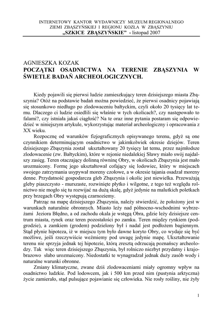 INTERNETOWY KANTOR WYDAWNICZY MUZEUM REGIONALNEGO ZIEMI ZBĄSZYŃSKIEJ I REGIONU KOZŁA W ZBĄSZYNIU „SZKICE ZBĄSZYŃSKIE” - listopad 2007 AGNIESZKA KOZAK POCZĄTKI OSADNICTWA NA TERENIE ZBĄSZYNIA W ŚWIETLE BADAŃ ARCHEOLOGICZNYCH. Kiedy pojawili się pierwsi ludzie zamieszkujący teren dzisiejszego miasta Zbąszynia? Otóż na podstawie badań można powiedzieć, że pierwsi osadnicy pojawiają się stosunkowo niedługo po zlodowaceniu bałtyckim, czyli około 20 tysięcy lat temu. Dlaczego ci ludzie osiedlili się właśnie w tych okolicach?, czy następowało to falami?, czy istniała jakaś ciągłość? Na te oraz inne pytania postaram się odpowiedzieć w niniejszym artykule, wykorzystując materiał archeologiczny i opracowania z XX wieku. Rozpocznę od warunków fizjograficznych opisywanego terenu, gdyż są one czynnikiem determinującym osadnictwo w jakimkolwiek okresie dziejów. Teren dzisiejszego Zbąszynia został ukształtowany 20 tysięcy lat temu, przez najmłodsze zlodowacenie (zw. Bałtyckim), które w rejonie niedalekiej Sławy miało swój najdalszy zasięg. Teren otaczający dolinną równinę Obry, w okolicach Zbąszynia jest mało urozmaicony. Formę jego ukształtował cofający się lodowiec, który w miejscach swojego zatrzymania usypywał moreny czołowe, a w okresie tajania osadzał moreny denne. Przydatność gospodarcza gleb Zbąszynia i okolic jest niewielka. Przeważają gleby piaszczysto - murszaste, rozwinięte płytko i wilgotne, z tego też względu rolnictwo nie mogło się tu rozwijać na dużą skalę, gdyż jedynie na malutkich poletkach przy brzegach Obry występują czarnoziemy. Patrząc na mapę dzisiejszego Zbąszynia, należy stwierdzić, że położony jest w warunkach naturalnie obronnych. Miasto leży nad północno-wschodnimi wybrzeżami Jeziora Błędno, a od zachodu okala je wstęgą Obra, gdzie leży dzisiejsze centrum miasta, rynek oraz teren pozostałości po zamku. Teren między rynkiem (podgrodzie), a zamkiem (grodem) podzielony był i nadal jest podłożem bagiennym. Stąd płynie hipoteza, iż w miejscu tym było dawne koryto Obry, co wydaje się być możliwe, jeśli rzeczywiście weźmiemy pod uwagę jedynie mapę. Ukształtowanie terenu nie sprzyja jednak tej hipotezie, którą zresztą odrzucają poznańscy archeolodzy. Tak więc teren dzisiejszego Zbąszynia, był rolniczo niezbyt przydatny i krajobrazowo słabo urozmaicony. Niedostatki te wynagradzał jednak duży zasób wody i naturalne warunki obronne. Zmiany klimatyczne, zwane dziś zlodowaceniami miały ogromny wpływ na osadnictwo ludzkie. Pod lodowcem, jak i 500 km przed nim (pustynia arktyczna) życie zamierało, stąd pulsujące pojawianie się człowieka. Nie rosły rośliny, nie żyły 1 zwierzęta, a co za tym idzie nie mógł także egzystować człowiek. Na terenie dzisiejszej Polski swoją obecność zaznaczyły cztery zlodowacenia. Człowiek występował między zlodowaceniami. Ślady występowania człowieka pochodzą już z pierwszego ocieplenia. Jeśli zaś chodzi o teren Wielkopolski, to ślady obecności człowieka pochodzą dopiero z młodszej epoki kamienia, czyli neolitu. Okres neolitu, to czas wielkich przemian, tzw. rewolucja neolityczna. Ludność zaczęła przechodzić z koczowniczego na osiadły tryb życia, a gospodarka powoli z przyswajalnej (zbieractwo, myślistwo) przekształcała się w wytwórczą (rolnictwo, hodowla). Zmiany te wpłynęły również na rodzaj występującej fauny i flory, kształt osiedli, ogólnie na cały tryb życia ówczesnych ludzi. Najprawdopodobniej w związku z tymi zmianami pojawili się osadnicy nad Jeziorem Błędno. Starożytność osadników archeolodzy dzielą na tzw. kultury. Kultury archeologiczne, to plemiona, które pozostawiły po sobie anonimowe ślady egzystencji w postaci grobów, ceramiki, resztek osiedli. Niestety nie znamy ich języka, nazw, dlatego archeolodzy zaczęli nadawać im umowne nazwy, np.: kultura lendzielsko - podgarska. Jedna z pierwszych kultur zamieszkujących tereny dzisiejszego Zbąszynia. Była to typowa kultura rolnicza, zasiedlająca obszary o bardziej urozmaiconych, ale lekkich i przez to łatwiejszych w uprawie glebach. Kolejnym, bardzo oryginalnym znaleziskiem jest skrobacz kamienny i sztylet miedziany. Teorię o istnieniu osadnictwa na terenie Zbąszynia w okresie neolitu potwierdza znalezisko dwóch toporków kamiennych datowanych właśnie na ten okres. Reasumując epokę kamienną, można stwierdzić, że po ustąpieniu ostatniego lodowca, na ziemi zbąszyńskiej pojawiły się plemiona, wraz z nimi symptomy rewolucji neolitycznej. Tak, więc pierwsze ślady osadnictwa sięgają starszej epoki brązu. Neolit, to tak zwana młodsza epoka kamienia, po której następuje epoka brązu. Brąz przywędrowała na ziemie polskie z Bliskiego Wschodu, ok. 1900 lat p.n.e. Brąz to stop dwóch metali, miedzi (90%) i cyny (10%). Miedź, co prawda znano wcześniej, ale nie zrewolucjonizowała ona jednak epoki, ponieważ była materiałem zbyt plastycznym, aby wykonywać z niej narzędzia, produkowano, z niej ozdoby. Tak, więc, wraz z pojawieniem się brązu zmieniły się obyczaje, narzędzia i zajęcia. Początkowo importowany, w związku, z czym bardzo drogi, stopniowo i powoli zaczął wypierać przedmioty z kamienia i krzemienia. Głównym jego atutem było to, że mógł być przetopiony i użyty ponownie. W trakcie prawie 1000 letniej epoki nastąpiło bardzo ważne zagęszczenie osadnictwa, na skalę, jaka może być porównywalna do rozwoju osadnictwa zachodniego w późnym średniowieczu i czasach nowożytnych. Epokę brązu dzielimy na 5 okresów. W starszym okresie epoki potwierdzone zostało tylko jedno znalezisko, a mianowicie okazały grot brązowy, trudno jednoznacznie powiedzieć, czy jedno znalezisko to wystarczający dowód na ciągłość osadnictwa na tym terenie, w I i II okresie brązu. Na środkową epokę brązu, czyli III i IV okres przypada kultura łu