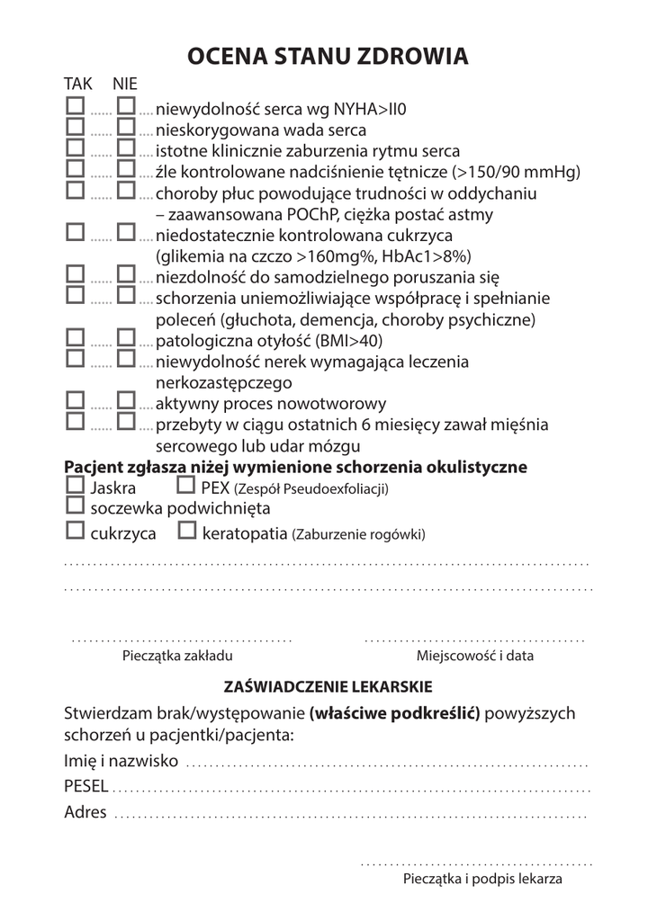 OCENA STANU ZDROWIA TAKNIE ....... ..... niewydolność serca wg NYHA>II0 ....... ..... nieskorygowana wada serca ....... ..... istotne klinicznie zaburzenia rytmu serca ....... ..... źle kontrolowane nadciśnienie tętnicze (>150/90 mmHg) ....... ..... choroby płuc powodujące trudności w oddychaniu – zaawansowana POChP, ciężka postać astmy ....... ..... niedostatecznie kontrolowana cukrzyca (glikemia na czczo >160mg%, HbAc1>8%) ....... ..... niezdolność do samodzielnego poruszania się ....... ..... schorzenia uniemożliwiające współpracę i spełnianie poleceń (głuchota, demencja, choroby psychiczne) ....... ..... patologiczna otyłość (BMI>40) ....... ..... niewydolność nerek wymagająca leczenia nerkozastępczego ....... ..... aktywny proces nowotworowy ....... ..... przebyty w ciągu ostatnich 6 miesięcy zawał mięśnia sercowego lub udar mózgu Pacjent zgłasza niżej wymienione schorzenia okulistyczne Jaskra PEX (Zespół Pseudoexfoliacji) soczewka podwichnięta cukrzyca keratopatia (Zaburzenie rogówki) .......................................................................................... ....................................................................................... ...................................... Pieczątka zakładu ...................................... Miejscowość i data ZAŚWIADCZENIE LEKARSKIE Stwierdzam brak/występowanie (właściwe podkreślić) powyższych schorzeń u pacjentki/pacjenta: Imię i nazwisko . . . . . . . . . . . . . . . . . . . . . . . . . . . . . . . . . . . . . . . . . . . . . . . . . . . . . . . . . . . . . . . . . . . . . PESEL . . . . . . . . . . . . . . . . . . . . . . . . . . . . . . . . . . . . . . . . . . . . . . . . . . . . . . . . . . . . . . . . . . . . . . . . . . . . . . . . . . Adres . . . . . . . . . . . . . . . . . . . . . . . . . . . . . . . . . . . . . . . . . . . . . . . . . . . . . . . . . . . . . . . . . . . . . . . . . . . . . . . . . ........................................ Pieczątka i podpis lekarza ul. M. Skłodowskiej-Curie 73, Toruń gabinet A 45, czynny w godzinach 8.00 - 18.00 informacja telefoniczna w godz. od 14.00 - 16.00 pod nr tel. 56 658 44 33 lub e-mail: oddział@citomed.pl Szanowna Pani Doktor Szanowny Panie Doktorze, W związku ze zgłoszeniem się do naszego ośrodka pacjentki/pacjenta ........................................................................................ celem przeprowadzenia kwalifikacji do zabiegu okulistycznego (usunięcie zaćmy), zwracamy się z uprzejmą prośbą o wydanie zaświadczenia o stanie zdrowia osoby będącej pod opieką Pani Doktor/ Pana Doktora. Zabiegi tego typu wykonywane są w naszej placówce w znieczuleniu miejscowym-kroplowym oraz dożylnej sedacji prowadzonej przez anestezjologa. Ze względu na bezpieczeństwo chorego, powodem, który nie pozwala na wykonanie zabiegu w trybie jednodniowym w naszej placówce, jest obecność określonych, poważnych schorzeń współistniejących wymienionych na odwrotnej stronie. W takiej sytuacji pacjent będzie skierowany do leczenia w trybie stacjonarnym. Podpisane przez Panią Doktor/Pana Doktora zaświadczenie o stanie zdrowia będzie stanowiło podstawę dalszego postępowania kwalifikacyjnego. Dziękujemy za współpracę! Zespół Lecznic Citomed Sp. z o.o.