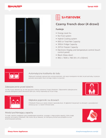 Sprzęt AGD SJ-FS810VBK Czarny French door (4 drzwi) Funkcje Energy Level A+ No Frost system Hybrid Cooling system 600 Ltr Total Net Capacity 393Ltr Fridge Capacity 207Ltr Freezer Capacity Electronic Display and temperature control (touch control panel) Black (Glass door) 892 x 1830 x 766 (W x H x D)[mm] Automatyczna kostkarka do lodu Większość kostkarek zajmuje dużo cennej przestrzeni, ale nasze rozwiązanie nie dość że jest pod ręką, to jeszcze pozwala zaoszczędzić dużo cennego miejsca na żywność. Zabezpieczenie przed dziećmi Już Nie musisz obawiać się, że mali spryciarze zmienią ustawienia Twojej chłodziarki. Odpowiednie zabezpieczenie pozwala obsługiwać panel sterowania tylko tym, którzy naprawdę się na tym znają. Głębokie pojemniki na drzwiach Chłodziarki Sharp są w stanie zmieścić naprawdę dużo. W głębokich kieszeniach na drzwiach z powodzeniem zmieszczą się 2- a nawet 5-litrowe butle. Moduł pochłaniający zapachy To małe i sprytne urządzenie czyści przepływające powietrze, usuwając z niego przykre zapachy, które mogły powstać we wnętrzu chłodziarki. Nie musisz się już obawiać, że intensywny aromat sera przejdzie na inne przechowywane potrawy. Sharp Home Appliances sharphomeappliances.com/pl Sprzęt AGD Kluczowe cechy Kolor Czarny Sprawność energetyczna A+ Typ produktu French door (4 drzwi) Czas wzrostu temperatury (godz.) 17 Liczba drzwi 4 Szklane wykończenie drzwi Tak Wydajność mrożenia (kg/ 24 godziny) 9.5 Frost free (No frost) Tak Poziom emisji hałasu w powietrzu (dB(A) re1 pW) 37 Roczne zużycie energii (kWh/rok) 487 Klasa klimatyczna SN-T Regulowane szklane półki Tak Przedział na warzywa i owoce (ok. 3°C) Tak Przedział o obniżonej temperaturze (-2°C ~ +3°C) Tak Szuflada na warzywa i owoce Nie Pojemniki na drzwiach Tak Funkcje Lodówka Regulacja temperatury (elektroniczna/mechaniczna) Tak/Nie Oświetlenie wnętrza (Lodówki) Tak System chłodzenia System Hybrid Cooling System Plasmacluster Ion Tak Pochłaniacz zapachów (Honeycomb / Nano) Pochłaniacz zapachów Nano + AG Sharp Home Appliances sharphomeappliances.com/pl Sprzęt AGD Funkcje zamrażarka No Frost /chłodzenie wentylatorowe Tak/Tak Liczba gwiazdek - zamrażarka 4 Ekspresowe zamrażanie Tak Automatyczna kostkarka do lodu (typ zbiornikowy) Tak Kostkarka do lodu/obrotowa/z tacką -/-/- Pojemnik na lód Tak (1 duży pojemnik) Regulacja temperatury (elektroniczna/mechaniczna) Tak/Nie Oświetlenie wnętrza (Zamrażarka) Nie Inne funkcje Dozownik wody Nie Alarm otwartych drzwi Tak Zabezpieczenie przed dziećmi Tak Tryb wakacyjny Tak Uchwyt na drzwiach Crystal Clear Handle Czynnik chłodniczy R600a Elektroniczny wyświetlacz i sterowanie Tak (dotykowy panel sterowania) Przekładane drzwi Nie Do zabudowy Nie Pojemność (całkowita netto) (L) 600 Pojemność chłodziarki (całkowita netto) (L) 393 Pojemność zamrażarki (całkowita netto) (L) 207 Masa, kg (netto) 118 Masa, kg (brutto) 132 Szerokość Ponad 80cm Typ systemu odszraniania w chłodziarce/zamrażarce Auto/Auto Pojemność Pojemność (całkowita brutto) (L) 678 Pojemność chłodziarki (całkowita brutto) (L) 424 Pojemność zamrażarki (całkowita brutto) (L) 254 Wymiary i waga Wymiary z uchwytem (sz. x w. x g.) mm 892 x 1830 x 766 Wymiary bez uchwytu (sz. x w. x g.) mm – Wymiary opakowania (sz. x w. x g.) mm 962 x 1970 x 853 Sharp Home Appliances sharphomeappliances.com/pl Sprzęt AGD European article number Kod EAN Sharp Home Appliances Powered by TCPDF (www.tcpdf.org) 4974019750118 sharphomeappliances.com/pl