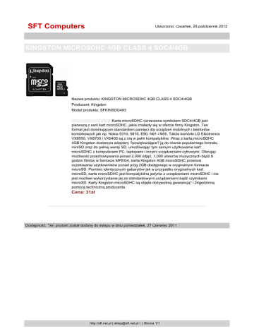 SFT Computers Utworzono: czwartek, 25 październik 2012 KINGSTON MICROSDHC 4GB CLASS 4 SDC4/4GB Nazwa produktu: KINGSTON MICROSDHC 4GB CLASS 4 SDC4/4GB Producent: Kingston Model produktu: SFKINSDG493 Karta microSDHC oznaczona symbolem SDC4/4GB jest pierwszą z serii kart microSDHC, jakie znalazły się w ofercie firmy Kingston. Ten format jest dominującym standardem pamięci dla urządzeń mobilnych i telefonów komórkowych jak np. Nokia 5310, 5610, E90, N81 i N95. Także komórki LG Electronics VX8550, VX8700 i VX9400 są z nią w pełni kompatybilne. Wraz z kartą microSDHC 4GB Kingston dostarcza adaptery ?powiększające? ją do równie popularnego formatu miniSD oraz do pełnej wersji SD, umożliwiając tym samym użytkowanie kart microSDHC z komputerami PC, laptopami i innymi urządzeniami cyfrowymi. Oferując możliwość przechowywania ponad 2,000 zdjęć, 1,000 utworów muzycznych bądź 8 godzin filmów w formacie MPEG4, karta Kingston 4GB microSDHC przenosi oczekiwania użytkowników ponad próg 2GB dostępnego w oryginalnym formacie microSD. Pomimo identycznych gabarytów jak w przypadku oryginalnych kart microSD, karta microSDHC jest kompatybilna jedynie z urządzeniami microSDHC i nie jest możliwe wykorzystanie jej ze standardowymi urządzeniami bądź czytnikami microSD. Karty Kingston microSDHC są objęte dożywotnią gwarancją* i 24godzinną pomocą techniczną producenta. Cena: 31zł Dostępność: Ten produkt został dodany do sklepu w dniu poniedziałek, 27 czerwiec 2011 http://sft.net.pl | [email protected] | | Strona 1/1