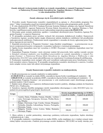 Zasady alokacji i wykorzystania środków na wyjazdy stypendialne w ramach Programu Erasmus+ w Państwowej WyŜszej Szkole Zawodowej im. Angelusa Silesiusa w Wałbrzychu w roku akademickim 2014/2015 §1 Zasady odnoszące się do wszystkich typów mobilności 1. Wszystkie zasady finansowania wyjazdów stypendialnych są opisane w „Przewodniku programu Erasmus+” (http://erasmusplus.org.pl/wp-content/uploads/2013/12/erasmus-plus-programme-guide_en.pdf). 2. W roku akademickim 2014/2015 Fundacja Rozwoju Systemu Edukacji, pełniąca rolę Agencji Narodowej Programu ERASMUS+ zapewni Państwowej WyŜszej Szkole Zawodowej im. Angelusa Silesiusa w Wałbrzychu współfinansowanie działań do kwoty maksymalnej nieprzekraczającej 66.250,00 EUR. 3. Otrzymany grant zostanie podzielony zgodnie z warunkami określonymi przez Narodową Agencję Programu Erasmus+ w umowie finansowej. 4. W przypadku posiadania przez uczelnie wolnych lub otrzymania dodatkowych środków finansowych z Narodowej Agencji, uczelnia będzie mogła sfinansować jedynie dodatkowe mobilności lub przedłuŜenia zaakceptowanych mobilności. Podniesienie stawki stypendium w stosunku do kwoty ogłoszonej przez Narodową Agencję nie jest moŜliwe. 5. Stypendia przyznawane w Programie Erasmus+ mają charakter uzupełniający – są przeznaczone na pokrycie zwiększonych kosztów związanych z wyjazdem i pobytem w instytucji przyjmującej. 6. Ogólna kwota stypendium musi być wyraŜona w EURO. Przyznane i wypłacone stypendium musi być liczbą całkowitą. 7. Stypendium Programu Erasmus+ moŜe otrzymać student lub pracownik, który spełnia warunki zawarte w Zasadach rekrutacji studentów oraz kwalifikacji pracowników na wyjazdy stypendialne w ramach Programu Erasmus+ w Państwowej WyŜszej Szkole Zawodowej im. Angelusa Silesiusa w Wałbrzychu w roku akademickim 2014/2015 oraz został zakwalifikowany na wyjazd przez Uczelnianą Komisję Kwalifikacyjną. 8. Przekazanie stypendium moŜe nastąpić tylko pod warunkiem zaakceptowania przez beneficjenta wszystkich warunków umowy finansowej. W przypadku niespełnienia warunków określonych w umowie, Uczelnia moŜe zaŜądać zwrotu części lub całości otrzymanego stypendium. §2 Zasady finansowania wyjazdów studentów na studia/praktykę 1. Środki przeznaczone na wyjazdy studentów to maksymalnie: - 43.200,00 EUR na wyjazdy na studia (SMS), szacunkowa łączna liczba wyjeŜdŜających studentów – 18, - 3.000,00 EUR na wyjazdy na praktykę (SMP), szacunkowa łączna liczba wyjeŜdŜających studentów – 2. 2. Stypendium Programu Erasmus+ jest przyznawane w celu zrealizowania części określonego programu praktyki/studiów I lub II stopnia. 3. Student moŜe ubiegać się o częściowe dofinansowanie kosztów podróŜy, składając podanie do Kanclerza PWSZ AS w Wałbrzychu. 4. Narodowa Agencja określiła następujące stawki stypendialne obowiązujące w roku 2014/2015 przy wyjazdach do poszczególnych grup krajów docelowych: Grupa I II III Kraje Austria, Dania, Finlandia, Francja, Irlandia, Lichtenstein, Norwegia, Szwajcaria, Szwecja, Wielka Brytania, Włochy Belgia, Chorwacja, Cypr, Czechy, Grecja, Hiszpania, Holandia, Islandia, Luksemburg, Niemcy, Portugalia, Słowenia, Turcja Bułgaria, Estonia, Litwa, Łotwa, Malta, Rumunia, Słowacja, Węgry Kwota stypendium/miesiąc (w EURO) wyjazd na studia wyjazd na praktyki 500,00 600,00 400,00 500,00 300,00 400,00 5. Okres pobytu w uczelni partnerskiej, stanowiący podstawę rozliczenia stypendium, będzie określany z dokładnością do 1 dnia. 6. W przypadku studentów wyjeŜdŜających na studia (SMS), osoba znajdująca się w trudnej sytuacji materialnej będzie otrzymywała z budŜetu przyznanego uczelni dodatkowo 200 EURO na kaŜdy miesiąc pier1 wotnie zaakceptowanego pobytu. PrzynaleŜność do tej grupy będzie definiowana przez otrzymywania tego stypendium w semestrze zakończonym tuŜ przed wyjazdem za granicę. PrzynaleŜność do grupy uprawnionej do otrzymania dodatku musi być udokumentowana w chwili składania formularza zgłoszeniowego przez studenta. 7. Osoby z orzeczonym stopniem niepełnosprawności będą mogły ubiegać się o dodatkowe środki. Wnioski o dodatkowe fundusze będą składane do Narodowej Agencji. Dodatkowo przyznana kwota dofinansowania (przewyŜszająca stawki określone w tabeli powyŜej) będzie rozliczana jako koszty rzeczywiste, czyli wymagające udokumentowania w postaci dowodów finansowych. §3 Zasady finansowania wyjazdów pracowników 1. Środki przeznaczone na wyjazdy pracowników to maksymalnie: - 3.600,00 EUR (w tym ryczałt na koszty podróŜy) na kilkudniowe wyjazdy nauczycieli akademickich w celu prowadzenia zajęć dydaktycznych (STA), szacunkowa łączna liczba wyjeŜdŜających nauczycieli – 5, - 5.250,00 EUR (w tym ryczałt na koszty podróŜy) na tygodniowe wyjazdy pracowników w celach szkoleniowych (STT), szacunkowa łączna liczba wyjeŜdŜających pracowników – 7. 2. Środki finansowe przyznane w tej kategorii mogą być przeznaczone na wypłatę stypendiów dla nauczycieli akademickich, zakwalifikowanych na wyjazd do uczelni partnerskiej w celu prowadzenia min. 8 godzin zajęć dydaktycznych, a takŜe dla pracowników administracji Uczelni wyjeŜdŜających do uczelni partnerskich na szkolenie. 3. Narodowa Agencja określiła następujące stawki stypendialne obowiązujące w roku 2014/2015 przy wyjazdach do poszczególnych grup krajów docelowych: Grupa Kraje I Dania, Holandia, Irlandia, Szwecja, Wielka Brytania Austria, Belgia, Bułgaria, Cypr, Czechy, Finlandia, Francja, Grecja, Islandia, Liechtenstein, Luksemburg, Norwegia, Polska, Rumunia, Szwajcaria, Turcja, Węgry, Włochy Hiszpania, Łotwa, Malta, Niemcy, Portugalia, Słowacja Chorwacja, Estonia, Litwa, Słowenia II III IV Dzienna wartość stypendium w EURO przy wyjazdach trwających nie dłuŜej niŜ 14 dni 130,00 110,00 100,00 80,00 4. Dodatkowo, uczelnia będzie mogła wypłacić w ramach przyzna