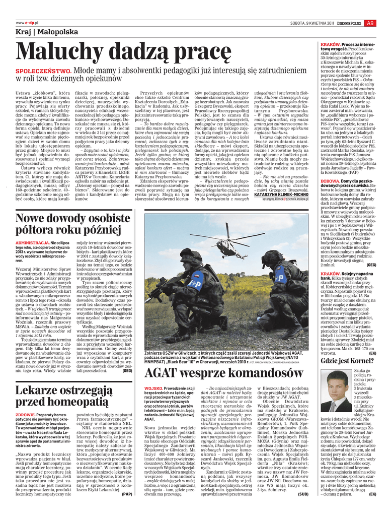 www.e–dp.pl SOBOTA, 9 KWIETNIA 2011 A9 Kraj | Małopolska Maluchy dadzą pracę KRAKÓW. Proces za internetową wrogość. Przed krakow- Młode mamy i absolwentki pedagogiki już interesują się zatrudnieniem w roli tzw. dziennych opiekunów SPOŁECZEŃSTWO. Ustawa „żłobkowa”, która weszła w życie kilka dni temu, wywołała ożywienie na rynku pracy. Pojawiają się oferty szkoleń, w ramach których będzie można zdobyć kwalifikacje do wykonywania zawodu dziennego opiekuna. To nowa forma opieki, którą definiuje ustawa. Opiekun może zajmować się maksymalnie pięciorgiem dzieci w swoim domu lub lokalu udostępnionym przez gminę. Miejsce to musi być jednak odpowiednio dostosowane i spełniać wymogi bezpieczeństwa. Ustawa wylicza również kryteria stawiane kandydatom. Ci, którzy nie mają doświadczenia i kwalifikacji pedagogicznych, muszą odbyć 160–godzinne szkolenie. 40– godzinne szkolenie mogą odbyć osoby, które mają kwali- fikacje w zawodach: pielęgniarki, położnej, opiekunki dziecięcej, nauczyciela wychowania przedszkolnego, nauczyciela edukacji wczesnoszkolnej lub pedagoga opiekuńczo–wychowawczego. Doszkalać nie muszą się ci, którzy pracowali z dziećmi w wieku do 3 lat przez co najmniej rok bezpośrednio przed podjęciem pracy jako dzienny opiekun. – Zapytań o to, kto i w jaki sposób może zostać opiekunem, jest coraz więcej. Zainteresowanie jest bardzo duże – mówi Katarzyna Przyborowska, radca prawny z Kancelarii LEGE ARTIS w Toruniu. Kancelaria ogłosiła nabór na szkolenie pt. „Dzienny opiekun – pomysł na biznes”. Skierowane jest do gmin i kandydatów na opiekunów. Przyszłych opiekunów chce także szkolić Centrum Kształcenia Dorosłych „Edukacja” w Radomiu. Jak usłyszeliśmy w tej placówce, jest już zainteresowanie taką propozycją. – To bardzo dobre rozwiązanie dla mam małych dzieci, które chcą zajmować się swoją pociechą i jednocześnie pracować, zwłaszcza tych z wykształceniem pedagogicznym, pielęgniarek lub położnych. Jeżeli tylko gmina, w której taka chętna do bycia dziennym opiekunem mama mieszka, ogłosi konkurs ofert – można w nim startować – tłumaczy Katarzyna Przyborowska. Zdaniem ekspertów wprowadzenie nowego zawodu pozwoli poprawić sytuację na rynku pracy. Mogą na tym skorzystać absolwenci kierun- ków pedagogicznych, którzy obecnie stanowią znaczną grupę bezrobotnych. Jak zauważa Grzegorz Byszewski, ekspert Pracodawcy Rzeczypospolitej Polskiej, jest to szansa dla emerytowanych nauczycieli, pedagogów czy pielęgniarek. Podejmując się takiego zajęcia, będą mogli być znów aktywni zawodowo. – A to z kolei oznacza dla nich kolejne lata składkowe – mówi ekspert, dodając, że na wprowadzeniu formy opieki, jaką jest opiekun dzienny, zyskają przede wszystkim mieszkańcy małych miejscowości, w których jest niewiele żłobków bądź nie ma ich wcale. – Wykształcenie pedagogiczne czy wcześniejsza praca jako pielęgniarka czy położna wręcz predysponuje takie osoby do korzystania z nowych udogodnień i otwierania żłobków, klubów dziecięcych czy podpisania umowy jako dzienny opiekun – przekonuje Katarzyna Przyborowska. – W tym ostatnim wypadku należy sprawdzić, czy nasza gmina jest zainteresowana instytucją dziennego opiekuna i ogłasza konkurs. Ustawa daje również możliwość zatrudniania niani. Składki na ubezpieczenia społeczne i zdrowotne będą na nią opłacane z budżetu państwa. Nianię będą mogły zatrudniać te rodziny, w których obydwoje rodzice są pracujący. – Nic nie stoi na przeszkodzie, by taką nianią została babcia czy ciocia dziecka – mówi Grzegorz Byszewski. KATARZYNA KLIMEK–MICHNO [email protected] Nowe dowody osobiste półtora roku później ADMINISTRACJA. Nie od lipca tego roku, ale dopiero od stycznia 2013 r. wydawane będą nowe dowody osobiste z mikroprocesorem. Wczoraj Ministerstwo Spraw Wewnętrznych i Administracji przyznało, że nie zdąży przygotować się do wydawania nowych dokumentów tożsamości. Termin wprowadzenia plastikowych kart z wbudowanym mikroprocesorem to 1 lipca tego roku – określa go ustawa o dowodach osobistych. – W tej chwili trwają prace nad nowelizacją tej ustawy – poinformowała nas Małgorzata Woźniak, rzecznik prasowy MSWiA. – Zakłada ona wejście w życie nowych dowodów od 1 stycznia 2013 roku. To już druga zmiana terminu wprowadzenia dowodów z chipem. Gdy kilka lat temu decydowano się na wbudowanie chipów w plastikowowe karty, zakładano, że pierwsi Polacy dostaną nowe dowody już w styczniu tego roku. Wtedy właśnie mijały terminy ważności pierwszych 10–letnich dowodów osobistych – kart plastikowych, które w 2001 r. zastąpiły dowody książeczkowe. Zbyt długo trwały dyskusje na temat tego, co będzie kodowane w mikroprocesorach i nie zdążono przygotować zmian w przepisach. Tym razem półtoraroczny poślizg to skutek ciągle nierozstrzygniętego przetargu, który ma wyłonić producenta nowych dowodów. Dodatkowy czas pozwoli też skutecznie przetestować nowe rozwiązania, wyłapać wszystkie błędy i niedociągnięcia oraz uzyskać odpowiednie certyfikacje. Według Małgorzaty Woźniak wszystkie pozostałe przygotowania do wprowadzenia nowych dokumentów przebiegają zgodnie z przyjętym wcześniej harmonogramem. Gminy zostały już wyposażone w komputery wraz z czytnikami kart, a pracownicy odpowiedzialni za wydawanie nowych dowodów zostali przeszkoleni. (GEG) Lekarze ostrzegają przed homeopatią ZDROWIE. Preparaty homeopatyczne nie powinny być określane jako produkty lecznicze. To wprowadzanie w błąd pacjentów – uważa Naczelna Rada Lekarska, która wystosowała w tej sprawie apel do parlamentu i ministra zdrowia. „Nazwa produkt leczniczy wprowadza pacjenta w błąd. Jeśli produkty homeopatyczne mają charakter leczniczy, powinny przejść procedurę jak inne produkty tego typu. Jeśli taka procedura