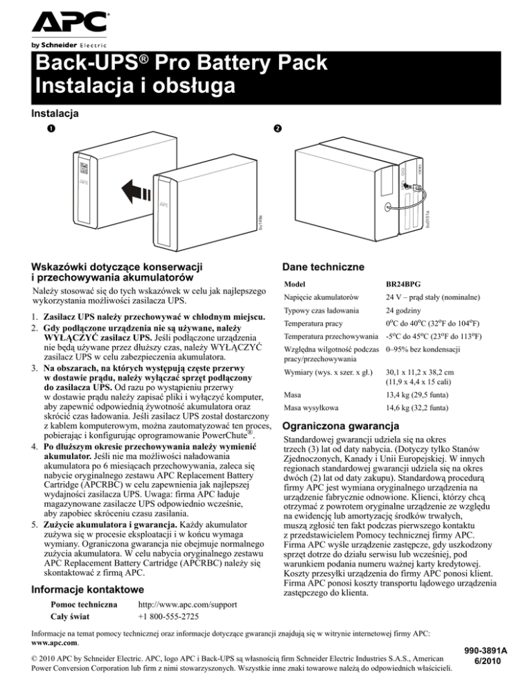 Back-UPS® Pro Battery Pack Instalacja i obsługa Instalacja bu0151a bu149a Wskazówki dotyczące konserwacji i przechowywania akumulatorów Należy stosować się do tych wskazówek w celu jak najlepszego wykorzystania możliwości zasilacza UPS. 1. Zasilacz UPS należy przechowywać w chłodnym miejscu. 2. Gdy podłączone urządzenia nie są używane, należy WYŁĄCZYĆ zasilacz UPS. Jeśli podłączone urządzenia nie będą używane przez dłuższy czas, należy WYŁĄCZYĆ zasilacz UPS w celu zabezpieczenia akumulatora. 3. Na obszarach, na których występują częste przerwy w dostawie prądu, należy wyłączać sprzęt podłączony do zasilacza UPS. Od razu po wystąpieniu przerwy w dostawie prądu należy zapisać pliki i wyłączyć komputer, aby zapewnić odpowiednią żywotność akumulatora oraz skrócić czas ładowania. Jeśli zasilacz UPS został dostarczony z kablem komputerowym, można zautomatyzować ten proces, pobierając i konfigurując oprogramowanie PowerChute®. 4. Po dłuższym okresie przechowywania należy wymienić akumulator. Jeśli nie ma możliwości naładowania akumulatora po 6 miesiącach przechowywania, zaleca się nabycie oryginalnego zestawu APC Replacement Battery Cartridge (APCRBC) w celu zapewnienia jak najlepszej wydajności zasilacza UPS. Uwaga: firma APC ładuje magazynowane zasilacze UPS odpowiednio wcześnie, aby zapobiec skróceniu czasu zasilania. 5. Zużycie akumulatora i gwarancja. Każdy akumulator zużywa się w procesie eksploatacji i w końcu wymaga wymiany. Ograniczona gwarancja nie obejmuje normalnego zużycia akumulatora. W celu nabycia oryginalnego zestawu APC Replacement Battery Cartridge (APCRBC) należy się skontaktować z firmą APC. Informacje kontaktowe Pomoc techniczna Cały świat Dane techniczne Model BR24BPG Napięcie akumulatorów 24 V – prąd stały (nominalne) Typowy czas ładowania 24 godziny Temperatura pracy 0oC do 40oC (32oF do 104oF) Temperatura przechowywania -5oC do 45oC (23oF do 113oF) Względna wilgotność podczas 0–95% bez kondensacji pracy/przechowywania Wymiary (wys. x szer. x gł.) 30,1 x 11,2 x 38,2 cm (11,9 x 4,4 x 15 cali) Masa 13,4 kg (29,5 funta) Masa wysyłkowa 14,6 kg (32,2 funta) Ograniczona gwarancja Standardowej gwarancji udziela się na okres trzech (3) lat od daty nabycia. (Dotyczy tylko Stanów Zjednoczonych, Kanady i Unii Europejskiej. W innych regionach standardowej gwarancji udziela się na okres dwóch (2) lat od daty zakupu). Standardową procedurą firmy APC jest wymiana oryginalnego urządzenia na urządzenie fabrycznie odnowione. Klienci, którzy chcą otrzymać z powrotem oryginalne urządzenie ze względu na ewidencję lub amortyzację środków trwałych, muszą zgłosić ten fakt podczas pierwszego kontaktu z przedstawicielem Pomocy technicznej firmy APC. Firma APC wyśle urządzenie zastępcze, gdy uszkodzony sprzęt dotrze do działu serwisu lub wcześniej, pod warunkiem podania numeru ważnej karty kredytowej. Koszty przesyłki urządzenia do firmy APC ponosi klient. Firma APC ponosi koszty transportu lądowego urządzenia zastępczego do klienta. http://www.apc.com/support +1 800-555-2725 Informacje na temat pomocy technicznej oraz informacje dotyczące gwarancji znajdują się w witrynie internetowej firmy APC: www.apc.com. © 2010 APC by Schneider Electric. APC, logo APC i Back-UPS są własnością firm Schneider Electric Industries S.A.S., American Power Conversion Corporation lub firm z nimi stowarzyszonych. Wszystkie inne znaki towarowe należą do odpowiednich właścicieli. 990-3891A 6/2010