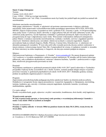 Snow Camp Zakopane Termin: I turnus 14.01-20.01.2017 Cena: 1189zł + 350zł na wyciągi narciarskie Wiek uczestników:(od 7 do 15lat). Uczestnikiem może być każdy kto jeździł bądź nie jeździł na nartach lub snowboardzie. Szkolenie narciarsko-snowboardowe: Małe grupy szkoleniowe 7-8osób, w zależności od poziomu zaawansowania. 6-dniowe szkolenie narciarskie, które poprowadzi wykwalifikowana kadra posiadająca uprawnienia SITN PZN, SITS PZS, MENiS. Zajęcia rozpoczynamy wyjazdem na stok o godzinie 8.45, wracamy o godz. 14.30 (przewidujemy dwie jazdy nocne: w pierwszy dzień i dowolny w ciągu pobytu).Tak jak rok temu zabieramy tyczki, aby szlifować jazdę sportową. Tyczki będziemy rozkładać w godzinach porannych, bądź wieczornych na przygotowanej do tego i odgrodzonej części stoku. Wieczorami wideoanaliza zdobytych umiejętności, pokaz filmów o tematyce narciarsko-snowboardowej, wykłady z techniki, serwisu i zagadnień sportów zimowych. Szkolenie zakończymy zawodami: slalom na tyczkach z cennymi nagrodami. Zajęcia prowadzone będą na stokach Jurgowa, Białki, Witowa, Czarnej Góry, Kluszkowiec- w zależności od aktualnie panujących warunków. W tym roku jeśli tylko warunki pozwolą chcemy jeździć codziennie w innym miejscu, wykorzystując karnet Tatry Ski. Z poprzednich lat wiemy, iż najlepsze warunki w stosunku do ilości narciarzy na stoku znajdziemy w Jurgowie, ale decyzja zostanie podjęta na miejscu. Miejsce: Zakwaterowani będziemy w Pensjonacie „U Ziomka” (www.uziomka.pl). Do naszej dyspozycji pokoje 3,4,5 osobowe w wysokim standardzie z pełnym węzłem sanitarnym. W ośrodku stół do tenisa stołowego, piłkarzyki, sala wykładowo-dyskotekowa, smaczna i domowa kuchnia, 3 posiłki + podwieczorek w ciągu dnia, możliwość przygotowania prowiantu na stok. Przejazd: Wyjeżdżamy autokarem w godzinach porannych (około 8.00) 14.01.2017 spod Lodowiska w Tychach(w przypadku większej liczby uczestników nie z okolic Tychów, zostanie podane drugie miejsce wyjazdu i powrotu) wracamy w godzinach popołudniowych około 16.00 20.01.2017. Dokładne godziny zostaną podane na spotkaniu organizacyjnym w styczniu. Program: Zapewniamy przeszkoloną kadrę pedagogiczną która opiekować będzie się dziećmi podczas pobytu. Dodatkowo w programie liczne zajęcia pozastokowe: wyjazd do Aquaparku w Zakopanem, snowtubing, turnieje, konkursy, gry, zawody z wieloma cennymi nagrodami, dyskoteki, karaoke, rywalizacja multimedialna, ognisko. Co warto zabrać: Przede wszystkim kask, gogle, rękawice: zwykłe i narciarskie, kombinezon, dwie kurtki, strój kąpielowy. Wypożyczenie sprzętu: W celu wypożyczenia sprzętu, w korzystnej cenie prosimy o wcześniejszą informacje i kontakt z nami. Cena około 150zł za tydzień za komplet Warunki uczestnictwa: Prosimy o wpłatę zaliczki w kwocie 300zł na poniższe konto do dnia 30.11.2016, resztę kwoty do 15.12.2016. 09105016181000009149667611 Barbara Krzemien uslugi turystyczno przewozowe Andatur ul. Urzedowa 2, 32-332 Bukowno NIP: 6371300900 Równocześnie z wpłaceniem zaliczki prosimy przesłać maila z informacją: Imię i nazwisko uczestnika, jego PESEL, telefon kontaktowy i mail do rodziców/opiekunów, informację czy dziecko jeździ na nartach czy na snowboardzie, oraz w jakim stopniu: -początkujący (nigdy nie stał na desce, nartach), -średniozaawansowany (potrafi zjechać ze stoków o słabym nachyleniu), -zaawansowany (potrafi zjeżdżać z każdego stoku). Wpłacenie zaliczki jest równoznaczne z akceptacją warunków uczestnictwa w imprezie znajdujących się na www.fununiversity.pl/pliki.php Dodatkowe informacje: Spotkanie informacyjne dla rodziców przewidziane jest na dzień: 12.01.2017 w szkole sportowej nr.19 w Tychach. Do ceny należy doliczyć 350zł na wyciągi narciarskie które powinno mieć dziecko w kopercie. Cena zawiera wyżej wymienione świadczenia oraz -ubezpieczenie NW -opiekę lekarską (lekarz na telefon) Więcej informacji i kontakt: Mariusz Klęczar [email protected] tel. 698653286 Rafał Majcherczyk [email protected] tel. 502279491 Organizatorem wyjazdu jest biuro podróży ANDATUR z Bukowna, które wystawia fakturę VAT za wyjazd.