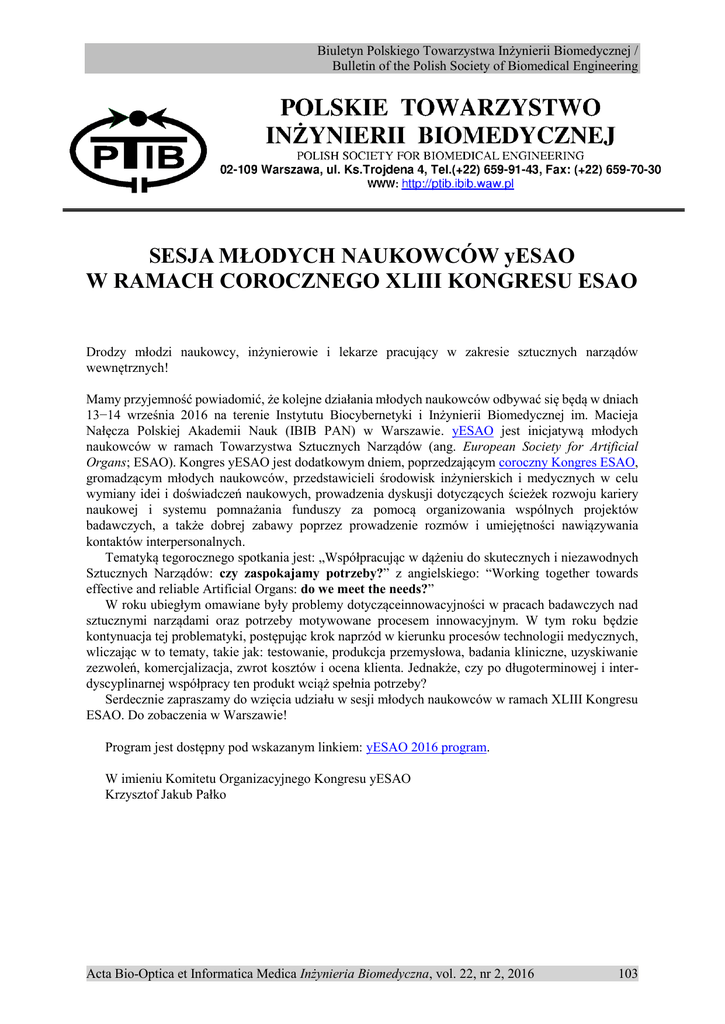 Biuletyn Polskiego Towarzystwa Inżynierii Biomedycznej / Bulletin of the Polish Society of Biomedical Engineering SESJA MŁODYCH NAUKOWCÓW yESAO W RAMACH COROCZNEGO XLIII KONGRESU ESAO Drodzy młodzi naukowcy, inżynierowie i lekarze pracujący w zakresie sztucznych narządów wewnętrznych! Mamy przyjemność powiadomić, że kolejne działania młodych naukowców odbywać się będą w dniach 13−14 września 2016 na terenie Instytutu Biocybernetyki i Inżynierii Biomedycznej im. Macieja Nałęcza Polskiej Akademii Nauk (IBIB PAN) w Warszawie. yESAO jest inicjatywą młodych naukowców w ramach Towarzystwa Sztucznych Narządów (ang. European Society for Artificial Organs; ESAO). Kongres yESAO jest dodatkowym dniem, poprzedzającym coroczny Kongres ESAO, gromadzącym młodych naukowców, przedstawicieli środowisk inżynierskich i medycznych w celu wymiany idei i doświadczeń naukowych, prowadzenia dyskusji dotyczących ścieżek rozwoju kariery naukowej i systemu pomnażania funduszy za pomocą organizowania wspólnych projektów badawczych, a także dobrej zabawy poprzez prowadzenie rozmów i umiejętności nawiązywania kontaktów interpersonalnych. Tematyką tegorocznego spotkania jest: „Współpracując w dążeniu do skutecznych i niezawodnych Sztucznych Narządów: czy zaspokajamy potrzeby?” z angielskiego: “Working together towards effective and reliable Artificial Organs: do we meet the needs?” W roku ubiegłym omawiane były problemy dotycząceinnowacyjności w pracach badawczych nad sztucznymi narządami oraz potrzeby motywowane procesem innowacyjnym. W tym roku będzie kontynuacja tej problematyki, postępując krok naprzód w kierunku procesów technologii medycznych, wliczając w to tematy, takie jak: testowanie, produkcja przemysłowa, badania kliniczne, uzyskiwanie zezwoleń, komercjalizacja, zwrot kosztów i ocena klienta. Jednakże, czy po długoterminowej i interdyscyplinarnej współpracy ten produkt wciąż spełnia potrzeby? Serdecznie zapraszamy do wzięcia udziału w sesji młodych naukowców w ramach XLIII Kongresu ESAO. Do zobaczenia w Warszawie! Program jest dostępny pod wskazanym linkiem: yESAO 2016 program. W imieniu Komitetu Organizacyjnego Kongresu yESAO Krzysztof Jakub Pałko Acta Bio-Optica et Informatica Medica Inżynieria Biomedyczna, vol. 22, nr 2, 2016 103